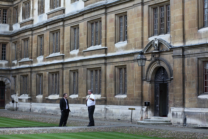 去剑桥大约2个小时,出了火车站按照谷歌地图的指示,先是一直往前走,到了一个十字路口后右拐再一直往前就能走到。 剑桥大学算是一个小镇,跟我们国内大学的不同,他们是没有围墙的,跟周围的居民区、商业区融合在一起。小镇中间有一条河穿过,这条河就是著名的剑河(也称为康河),剑桥大学按照学院划分,主要的学院基本上分布在这条河的两岸和镇上的其他地区。剑河两岸最值得去的学院是三一学院和国王学院,他们可以说是剑桥的发源。牛顿、达尔文、罗素、霍金、拜伦都是从这里成长起来的。