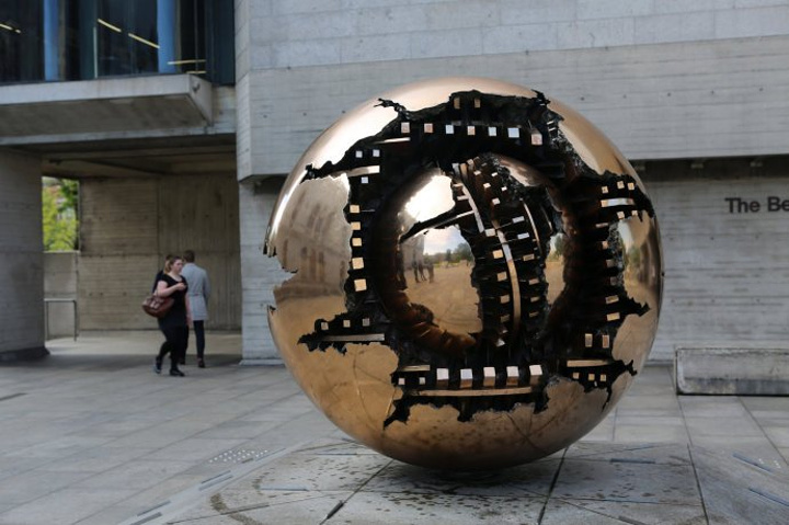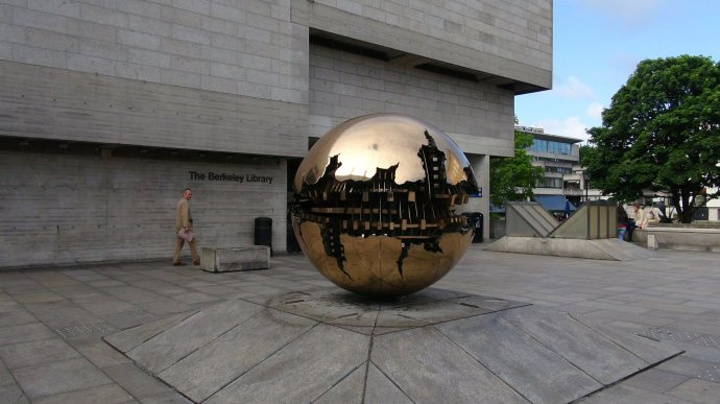 伯克利新图书馆门口的这个雕刻作品叫做“球中之球”(Sphere within Sphere),出自意大利雕刻家阿纳尔多.波莫多罗(Arnaldo Pomodore)之手。三一学院新老图书馆的藏书非常丰富。