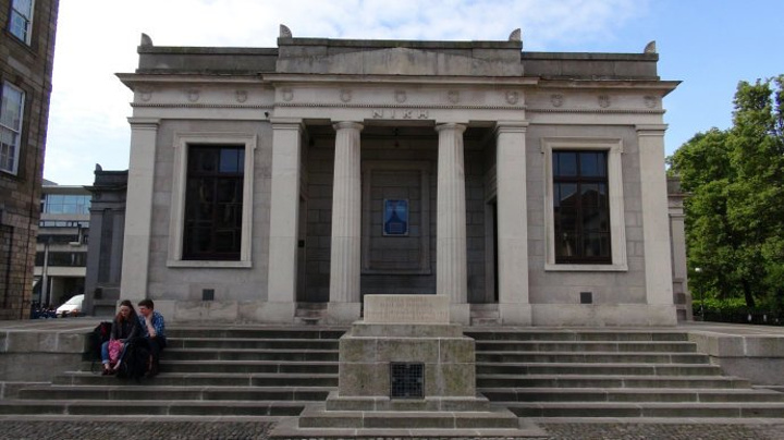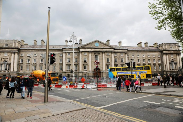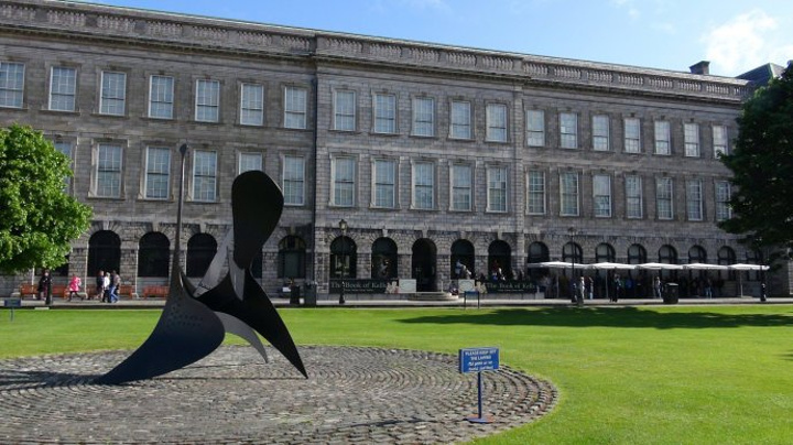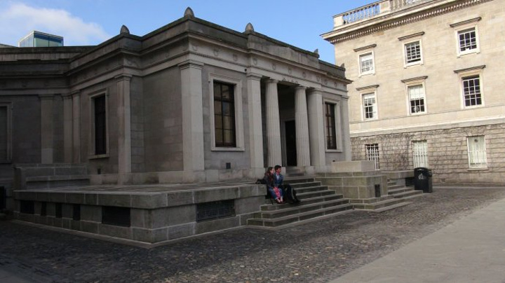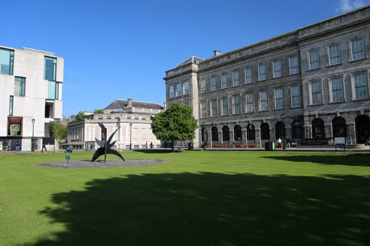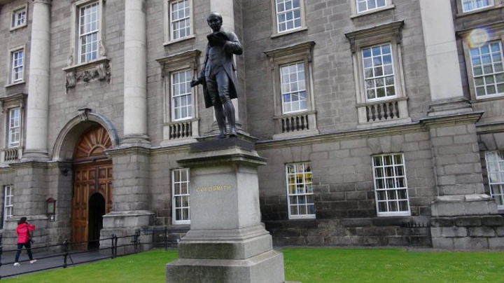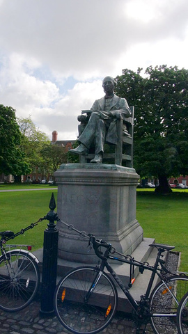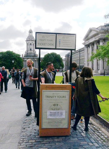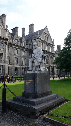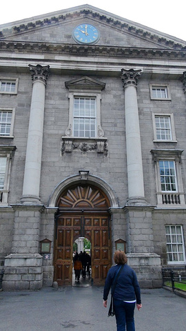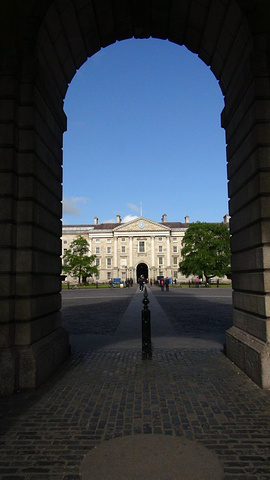 正前方的教学楼的门洞才是圣三一学院的正门的入口。位于都柏林的圣三一学院是爱尔兰排名第一的综合性大学。在国际上与英国的剑桥,牛津,美国的哈佛,耶鲁齐名。有两位圣三一学院的学者在物理学和英语文学领域获得过诺贝尔奖。乔伊斯,王尔德,贝克特,这些爱尔兰最伟大的作家,名人都毕业于这里。