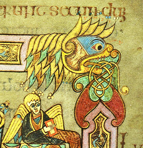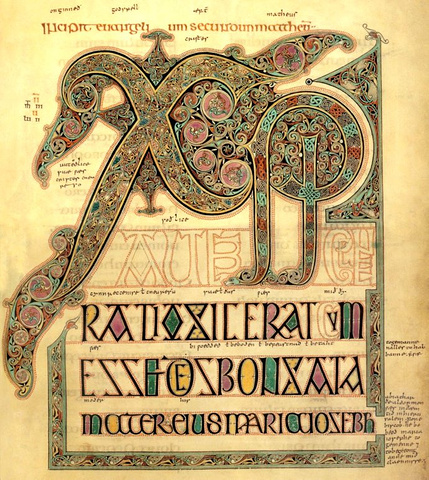 在精密平衡的整体书页构成中,最突出的是令人目眩神迷的字体与纹饰。花体字变形为叶漩涡,蛇身人头或蛇身鸟头的图形。