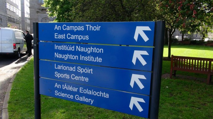 校园里的指路路标都是用爱尔兰语和英语两种语言写的。如果你仔细比较两种文字,你会发现这两种文字的差别简直太大了。从字母的组成,词序到发音都很不同。爱尔兰语是爱尔兰的第一官方语言。英语是第二官方语言。