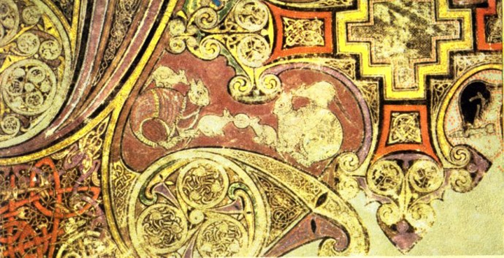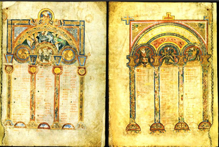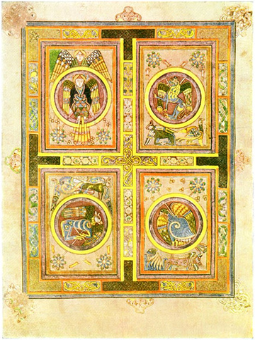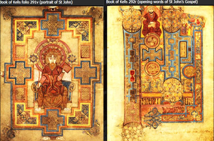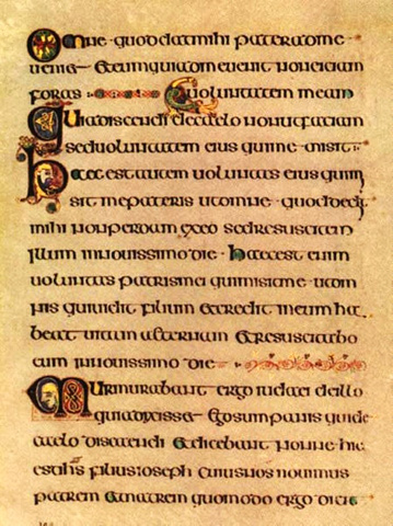 看时间差不多了,我们回到老图书馆门前,加入了等待的长队。在一层大厅的售票处我们先出示了手里的都柏林pass,被告之这个不管用,需要重新购票,每人11欧元。大老远的赶过来,不就是为了亲眼目睹这个著名的凯尔斯之书吗,就是花钱也不能不进去呀。于是花了22欧元,买了两张票。我们先去看在展示在底层的《凯尔斯之书》。由于这本书过于珍贵,被保存在一间光线昏暗的展室中央的防弹玻璃展柜里,定期翻开新页,所以每次参观只能看到这本680页羊皮书巨作中的两页,一般是一页图案,一页文字,而且不容许拍照。为了满足朋友们的好奇,我只好从网络和旅游书翻拍了几张照片。好了,现在花一点时间介绍一下《凯尔斯之书》(The Book of Kells)吧。