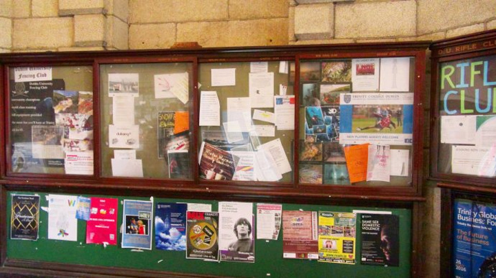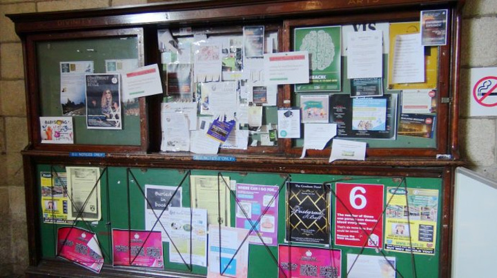 入门处门洞两侧的公告栏上,贴满了学校各种文体活动,讲座的通知和告示