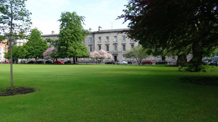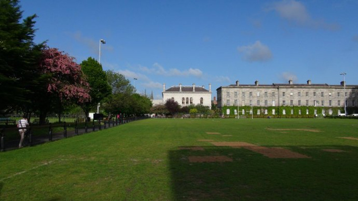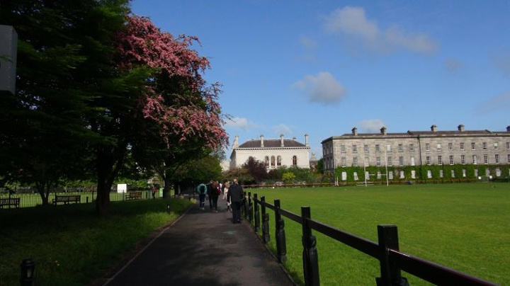 我们穿过绿草如茵的运动场去参观主校区。都柏林圣三一学院(英语:Trinity College Dublin,爱尔兰语:Coláiste na Tríonóide)正式名称为:College of the Holy and Undivided Trinity of Queen Elizabeth near Dublin 。学院占地47英亩,各时期的建筑自成方阵,颇具时代特色。