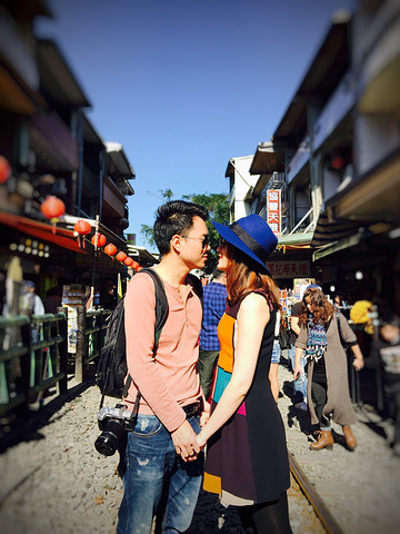 十分车站外面就一条街,卖小吃的,其余就是天灯铺子。我们买了个十分车站鸡翅包饭(没有拍照,人太多了),就找了家天灯铺子。先挑灯,付了钱之后,小妹会把天灯夹在架子上,提供毛笔在天灯上写字。然后两个工作人员带着我们到十分街上的火车轨道上去放天灯,照片都是小妹用手机帮我们拍的。