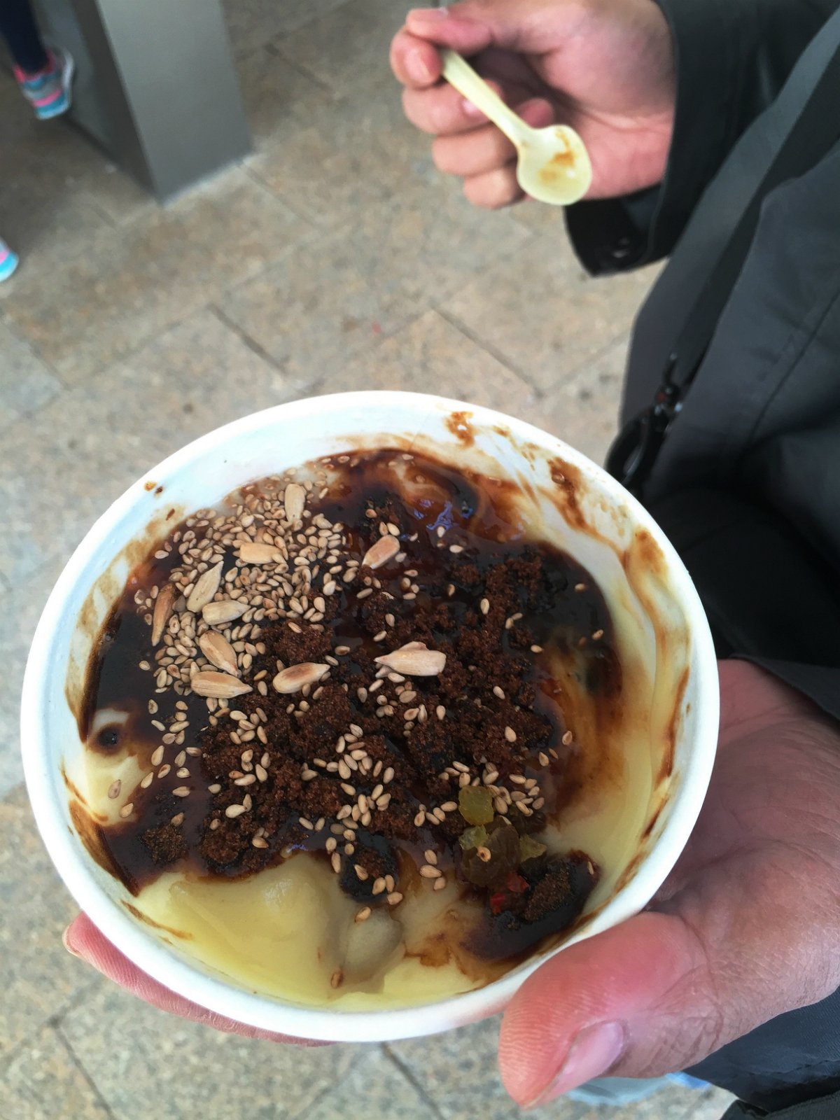 这里下摆渡车后,会先经过一片小食街有不少当地小吃,包括羊肉串、拉面、羊肉汤、羊杂汤、奶茶等。如果要八道桥待较长时间,建议吃点暖身的东西,因为这边温差真是挺大的。我们见这个小摊挺多人,就在这里叫了碗小吃,据说是独家配方,名字不记得了,但味道相当赞啊。有奶酪的香滑,上面的芝麻、松子、红糖也香。后来想在其他地方再试下,没找着。