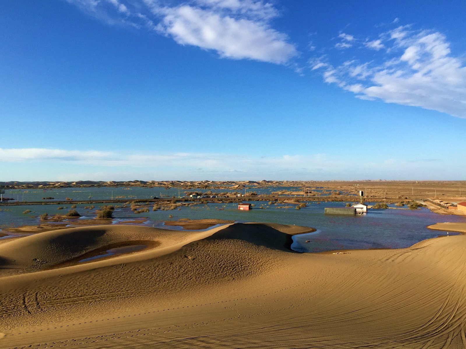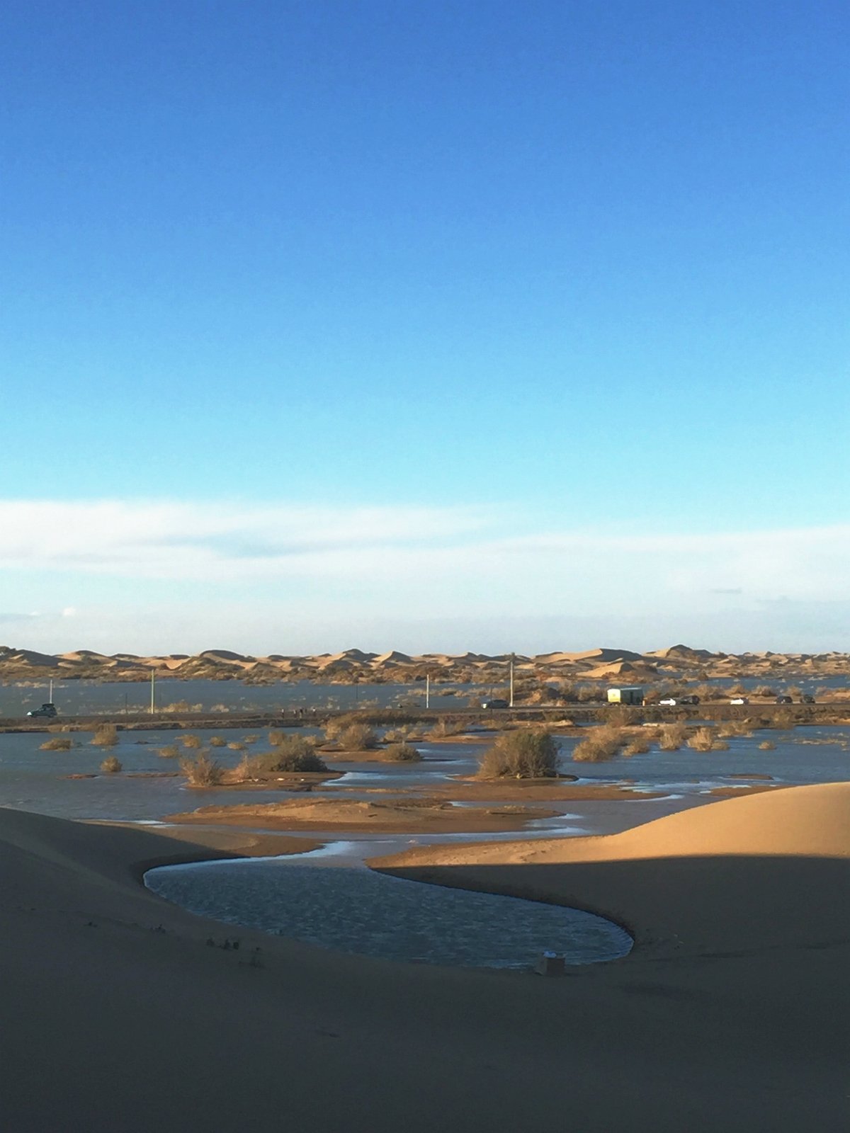 注意事项:一是最好准备口罩或颈套。风大时,真是相当大风沙啊!二是一定要注意保暖。因那几天白天比较热,太阳出来时,穿一件线衣或薄毛衣都热,而且去八道桥这天的天气睛好,我就掉以轻心,穿了件线衣外加一件风衣,然后杯具了。到下午开始越来越冷,到5点多觉得冷得紧,尽管我带了件毛衣,后来也穿上了,还是觉得冷,风也大。可我们要在这里等同行的朋友,于是就走到下面的湖边避风。风是小些,可随着天色渐沉,气温是越来越低啊。后来同行友人与我们汇合时说手都冻僵了。当时的日落是最美时,可我们已经冻得不想拍了,只想赶快上车。三是如果不是高筒靴子,建议还是租个鞋套,入门处就有,租金只要几元一双。而且是迷彩款,与行动服或冲锋衣都挺搭的。天热时脱鞋行走在沙子上是挺舒服的,可到气温降下来时,不可能还当赤脚大仙,寒从足底走啊,这时如果鞋子进了沙子也是挺不舒服的。四是这里气温高时也是相当晒的,女生一定要注意防晒、防风沙,墨镜、防晒霜不可或缺。