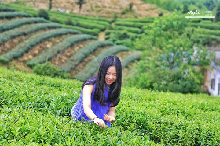 妹子在茶园里,正认真的采茶呢.