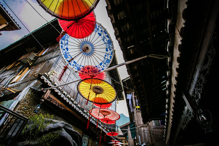 所谓“嘎歌”在苗语里的意思就是:小巷子。果然,穿过布满油纸伞的一条小路,我们直接前往了“古歌堂”。