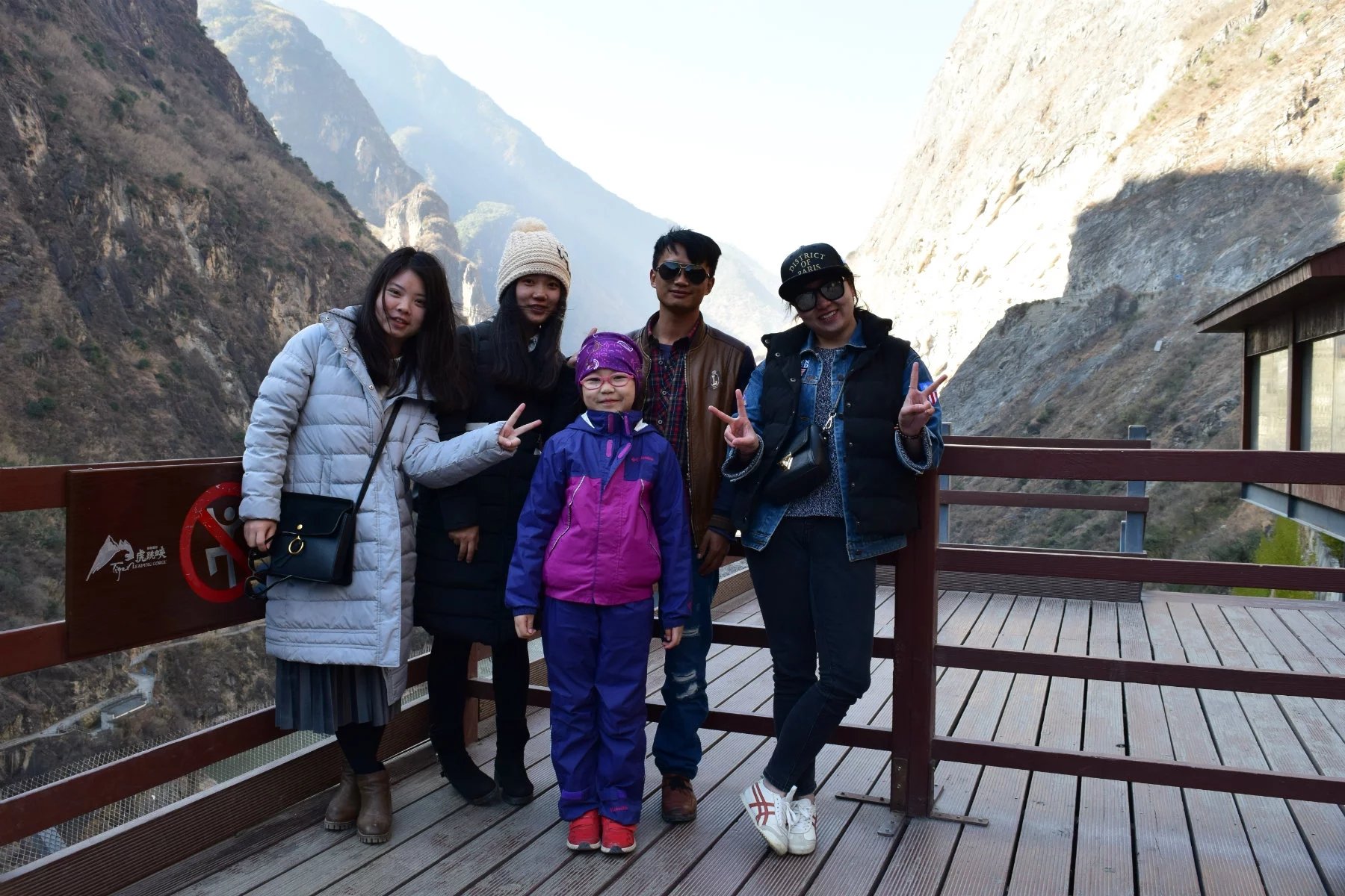 虎跳峡景区下车,让扎西上了个镜,他是我们两天行程的司机兼导游,藏族人。一上车就告诉我们不能在车上梳头和脱鞋子。。。小妹妹是同行组团的家庭成员,甩开了她爸爸妈妈跟我们合影。