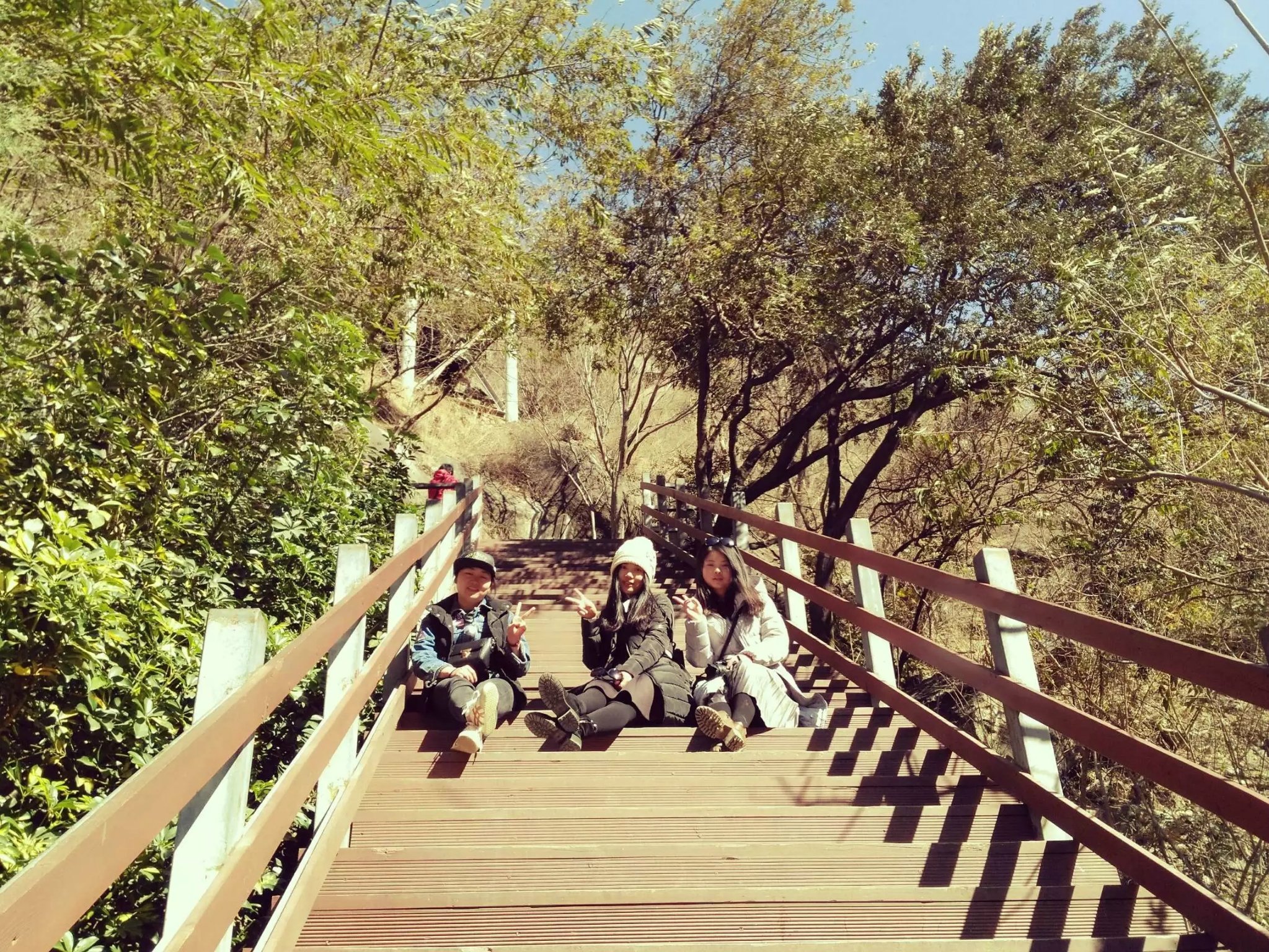 楼梯很陡,所以中途我们需要小休息一下。本身坐得没这么没素质的啦。因为有人帮忙拍照,所以摆POSE的啦。