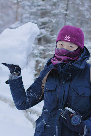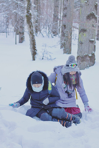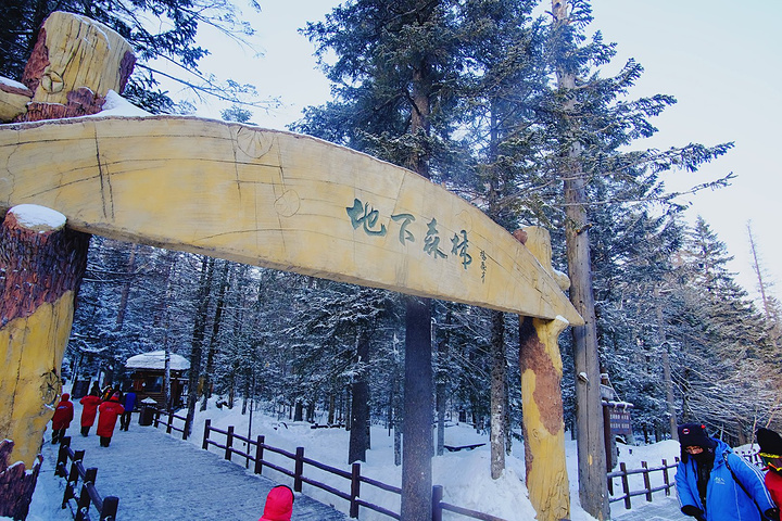 继续等车,去地下森林。地下森林是一处略略低于海拔的景点。沿着木板小路一直走,两边都是参天的桦树、杉树,颇为壮观,很有东北林的赶脚。路旁时常有小木牌提示,不要跨越栏杆进入林地,但我们还是试了一下,积雪可以没过大腿,深入林地是危险的也可能有小动物大动物的出没。(回家不久以后,看新闻说一男子在长白山迷路了,在长白山乱走,手机信号微弱,危险。)