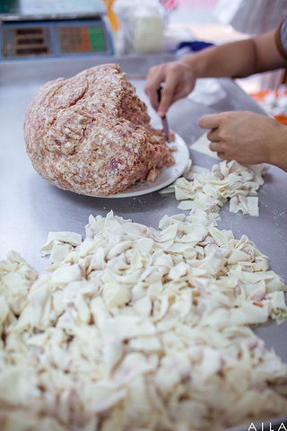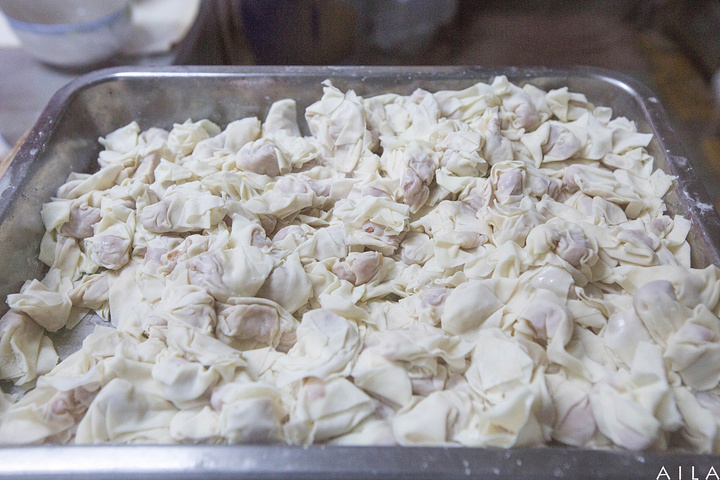 老板就守在店门口包馄饨,馅料和面皮都一目了然的呈现在食客眼前,让人吃着放心。除了堂食的还有很多食客直接在他家买生的扁食,然后回去自己煮来吃。所以这里的生扁食也论斤卖。