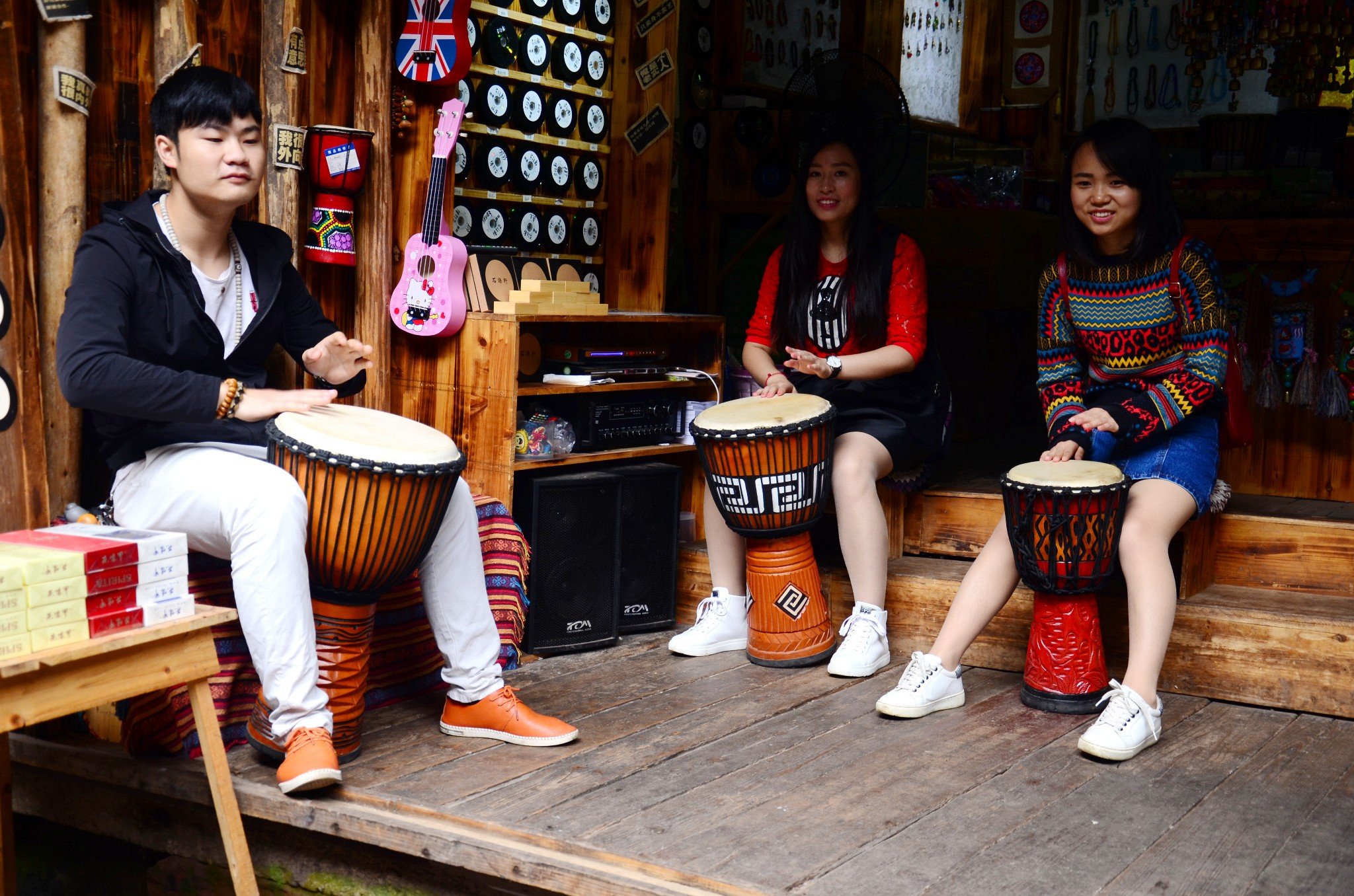 最后在古镇上,找到一家卖鼓和卖碟的店;我们跟着老板一起拍鼓玩了许久;有个摄影师走那过,看见我们,帮忙拍了这张照片;