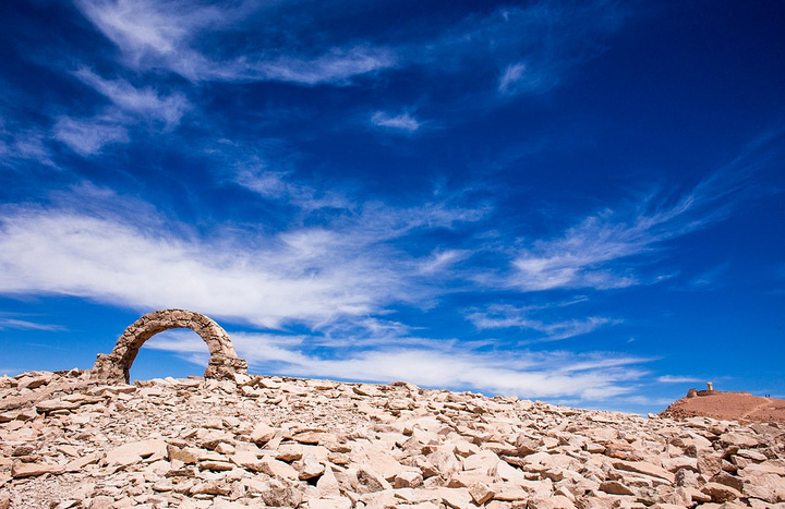 尽管昨夜出了事故,可我还是没放弃自行车的旅行。去租车店换一辆更加硬朗的山地车,把昨夜坏了的自行车还掉,甚至那位租车行的老板还对我脸上的伤进行了戏虐,罢了,罢了,过去的事儿,就让他随风而逝吧! 我本打算,只是骑着车去个最近的景点,不到三公里的路程,让我信心满满,可就在那儿我遇见了三智利游客,一吹风一点火,我居然被他们忽悠着开始了沙漠里的自行车之旅,不得不佩服智利人的体质,我连最瘦弱的那个女孩都撵不上,甚至他们会在前方的路口休息等我,从中午开始,我们骑行接近 20 公里,走了三个景点,在月亮谷我放弃了这场自行车之旅,在路边盼望着来往车辆的搭救。 在 Paula 的帮助下,最终拦下一辆返程的空大巴车,抱着我的自行车踉踉跄跄上了车,我才得以在这场长途跋涉的自行车之旅解脱,不过倘若没有 Paula 的帮助,我肯定一筹莫展,司机和售票员一点英文都不懂,不过他们却很热情,即便我给钱,他们也没有收。 夜里约上 Paula 和她的小伙伴们去镇子外拍星空,我们选择了镇子里的小道,没想到会遇见那么多狗,当然这些狗绝非野生,沙漠小镇外围的居民大多喜欢在家里养上数条狗,一般不用绳索,让它们自由自在的转悠在居所附近。一路上我们不止一次被 5-6 条狗围攻,幸好我们四人团队,甚至一路上 Paula 还给讲着许多卡拉马的新闻,譬如上周又发现一个人夜里被狗吃了,我再说起昨夜发生的意外和深夜独自一人的旅程,她一直夸运气好,没碰上像现在的狗群。 出了镇子不到一公里,就能直视璀璨的星空,为了避免意外发生,我们不愿走远,可身边的狗们依旧不断,这充满犬吠的夜。 从没想过,自己可以在高原沙漠骑这么远。在 Pukara de Quitor 遗址遇见 Paula 一群人,纯属巧合,不过作为少数的骑行者,我们都有着自己的自行车,不同的是她们打算骑行一天,而带着脸上的伤我只想来这儿看看就好。 Pukara de Quitor 遗址,位于镇子西北 3-4 公里的位置,有两座山坡可供游览,登顶可以俯瞰整座圣佩德罗德-阿塔卡马。作为距离镇子最近的景观,也成了来此旅行人们不可错过的一站。 尽管圣佩德罗-德阿塔卡马很小,这里可是智利北部最重要的旅游地,来自世界各地的旅人把小镇装点成了个世界村庄。