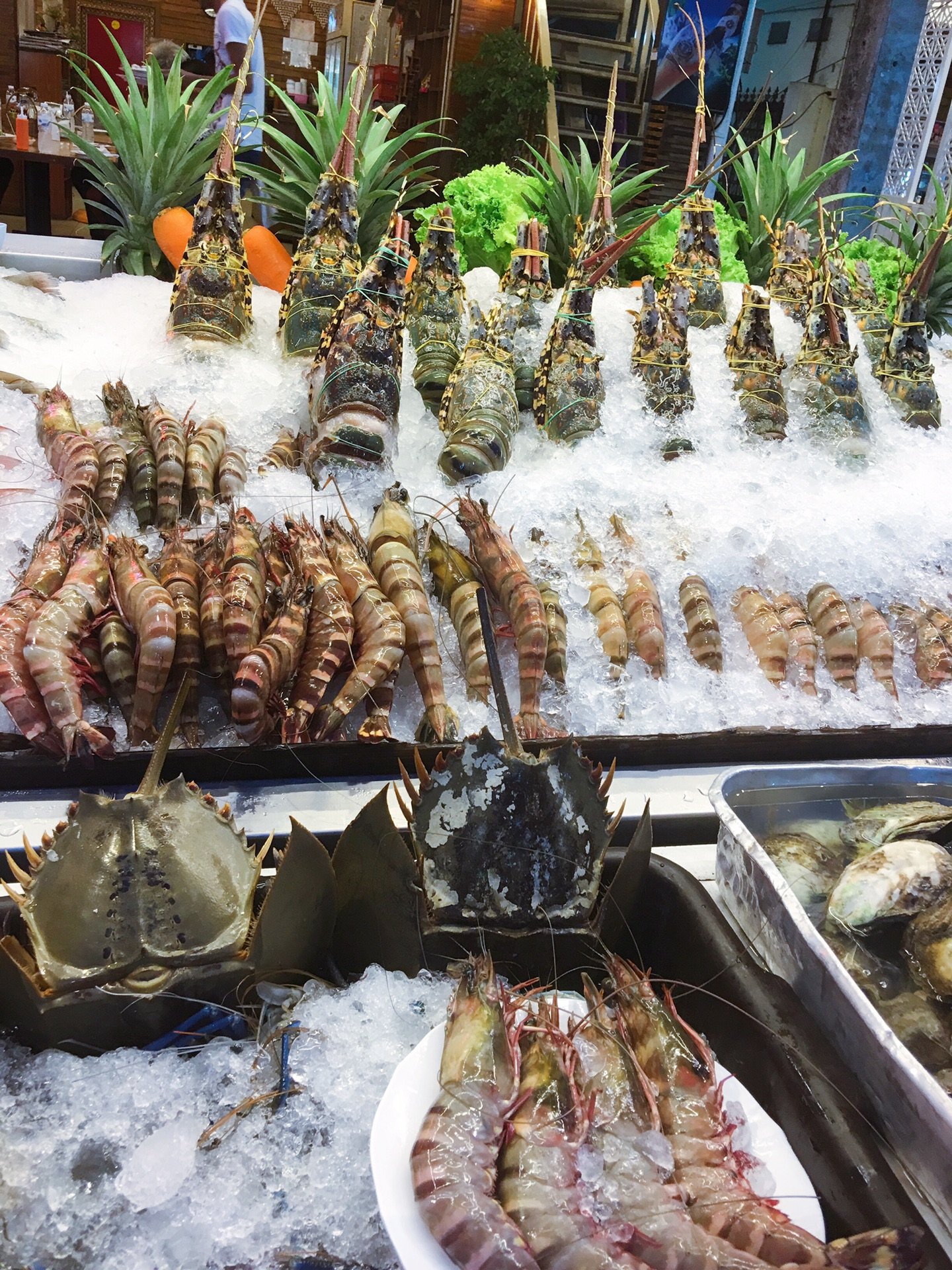 华欣夜市的海鲜很多,尤以鱿鱼、螃蟹和蛤蜊为最。每到傍晚,游客便会从各个角落冒出来,到夜市中找一家餐馆,品味泰式海鲜,这里有个头夸张的大头虾、螃蟹和龙虾,很少有人不为所动啊!尤其我这种爱吃海鲜的小公举。