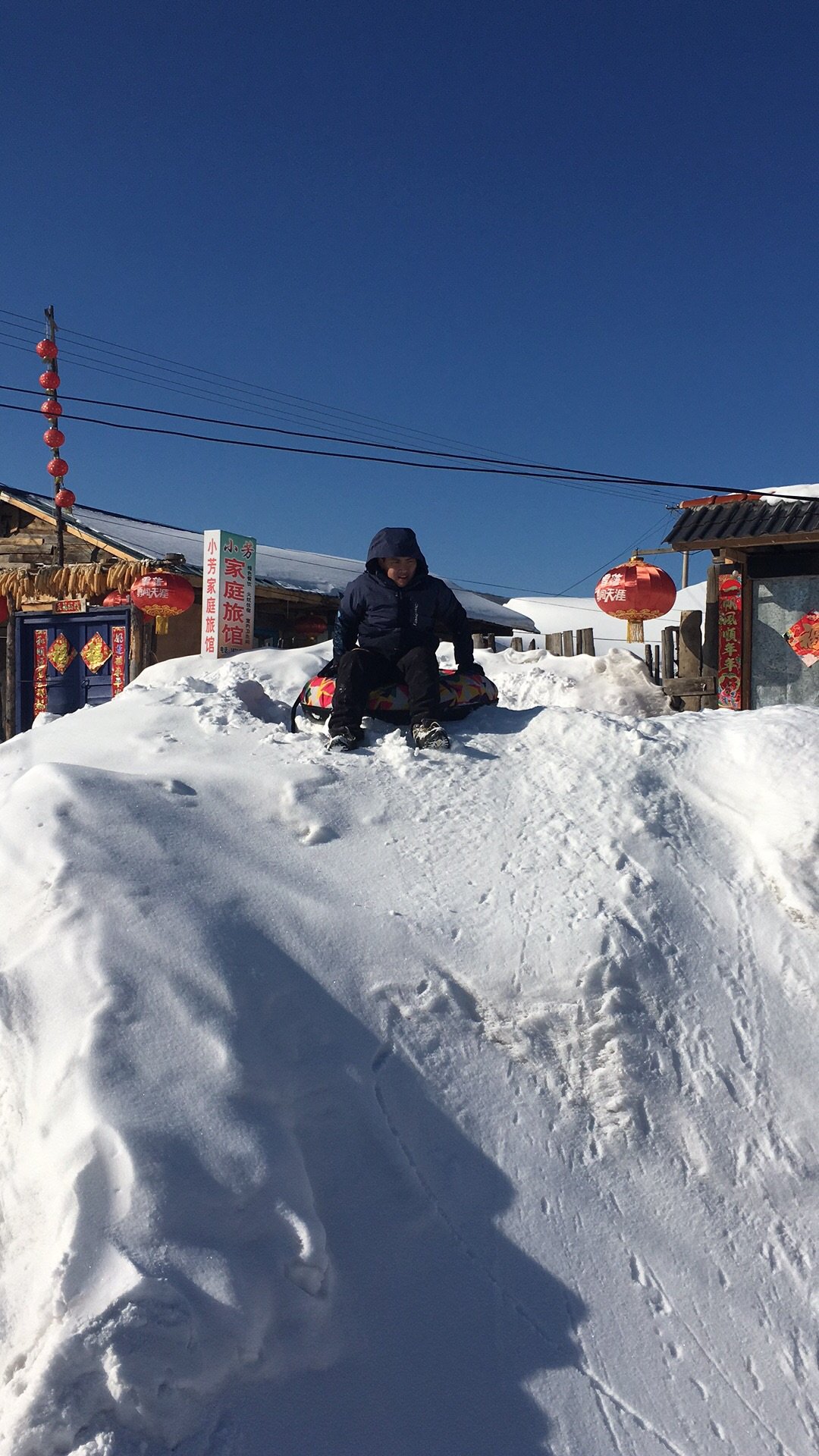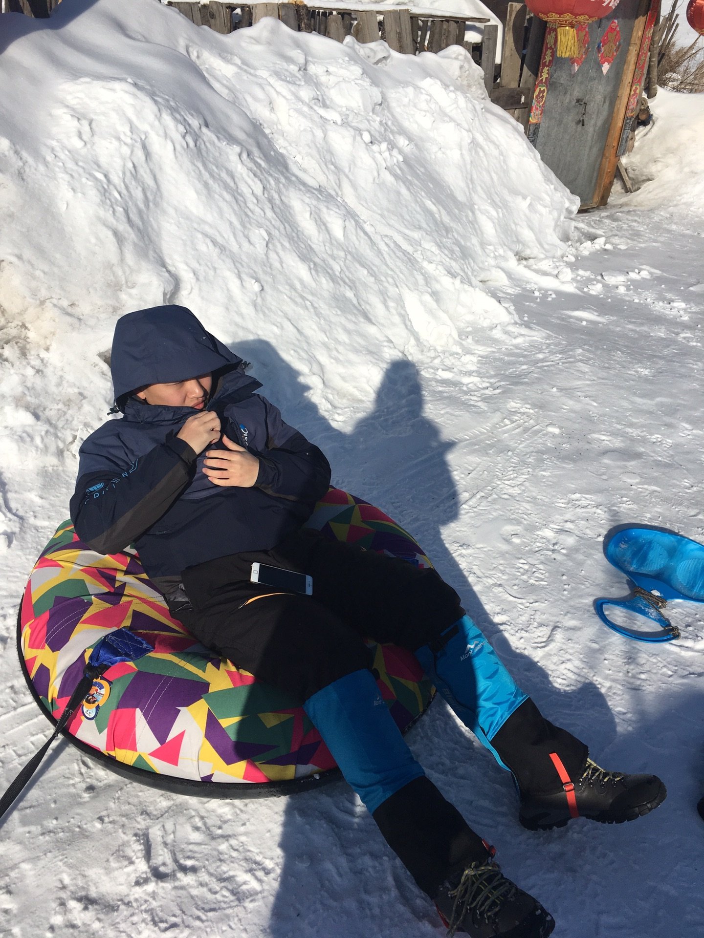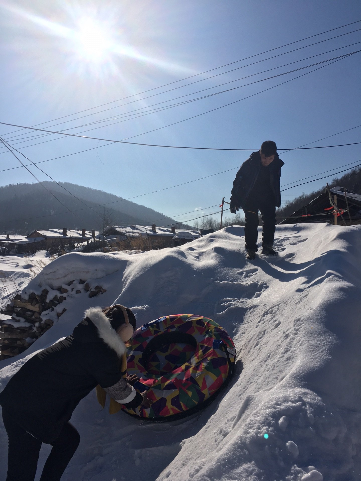 吃完就出去玩耍啦,阿姨家门口有自己挖的一条雪道,家里也有雪圈雪板,拉着雪圈雪板出去滑了好几圈哈哈哈哈特别有意思