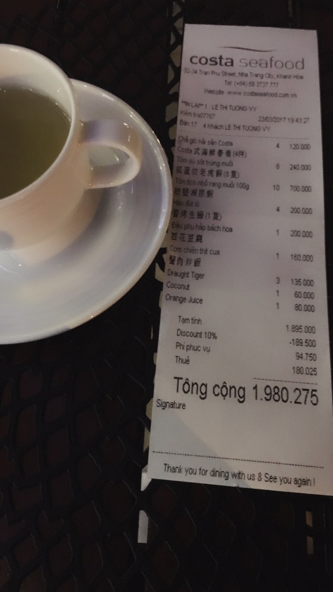 Costa seafood的环境在芽庄也算是上乘的,室内灯火通明,装修简约大气,室外虽然幽暗,但好在烛光可以将浪漫气息蔓延,正对着沙滩,丝丝凉意,看着马路上过往的车辆和行人,晚餐甚合我意。实在觉得这样的兼容很难以做到,但costa seafood却结合得相当的妙!