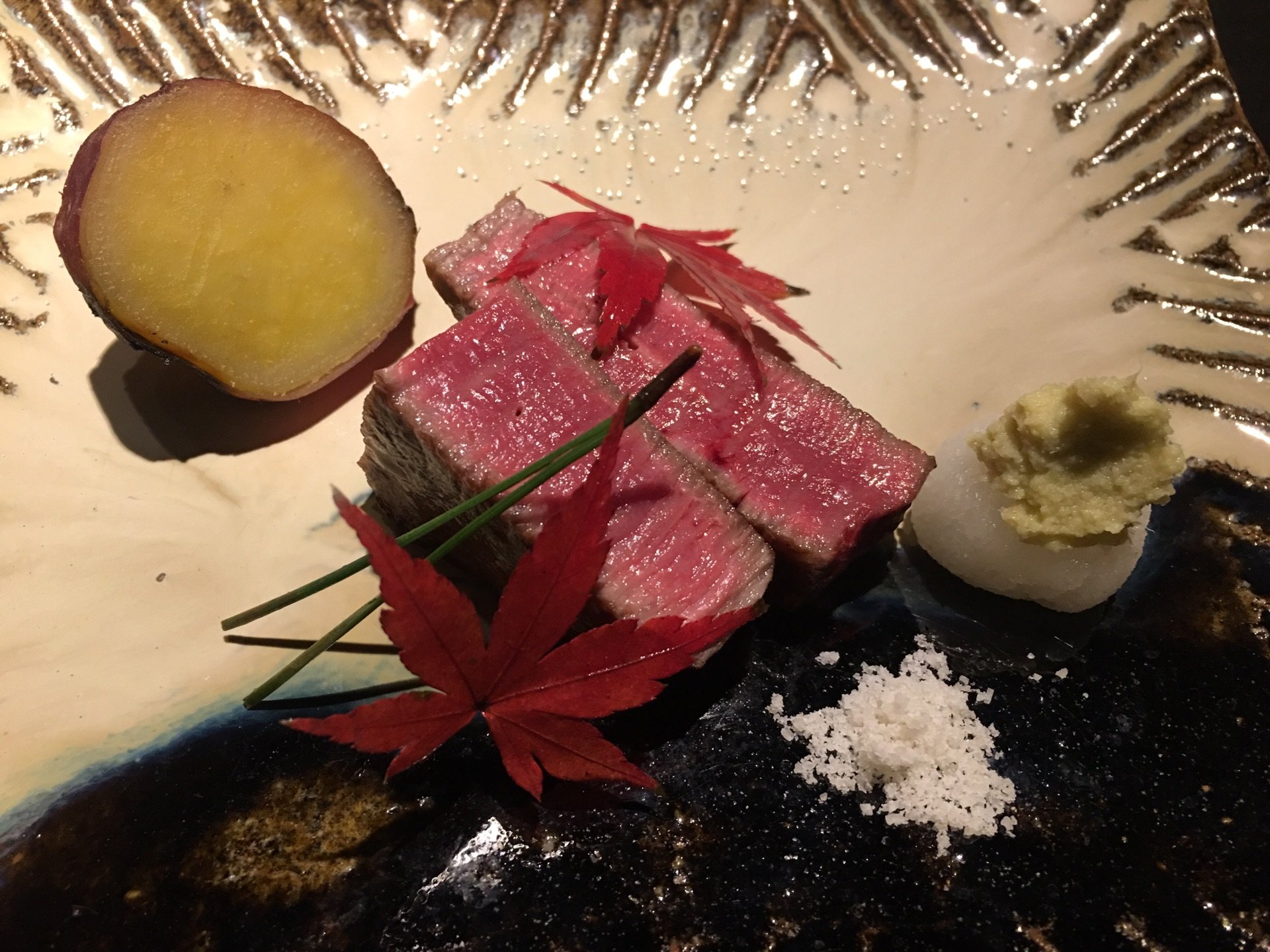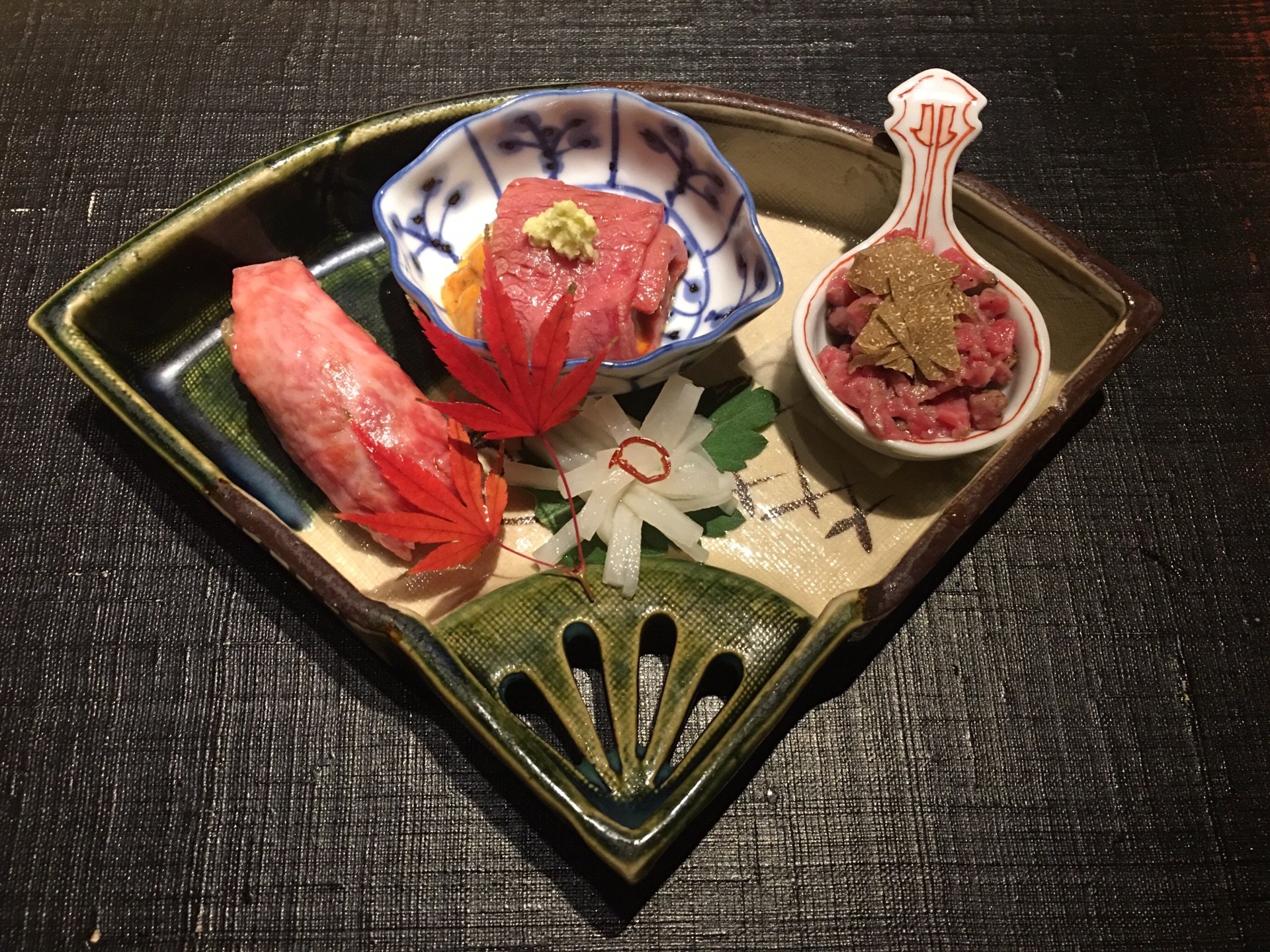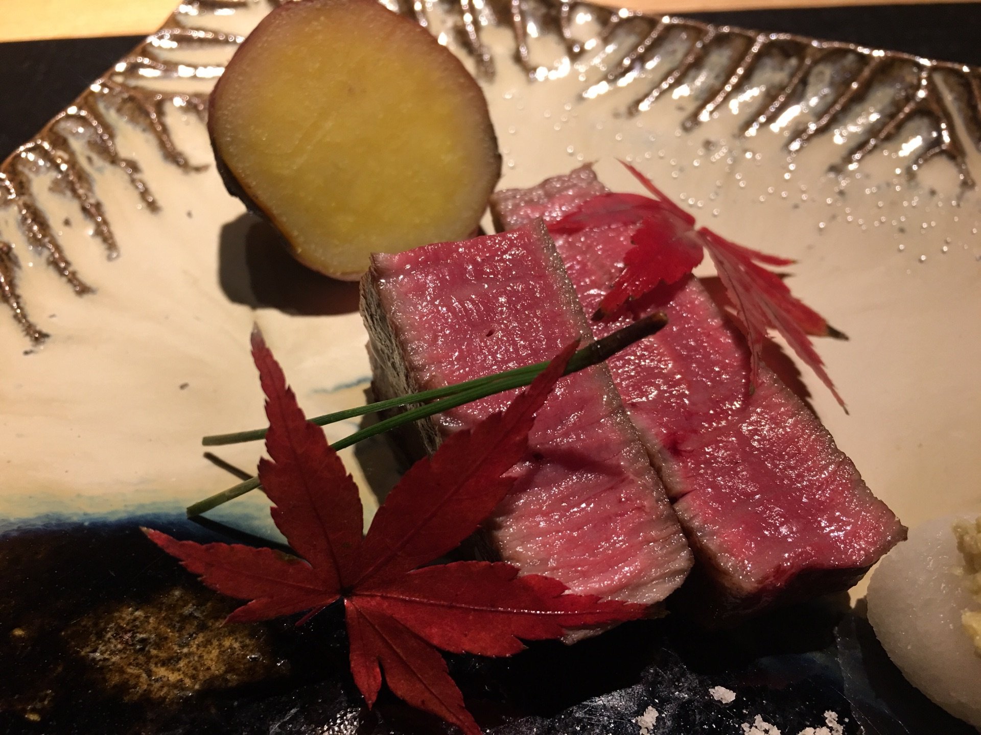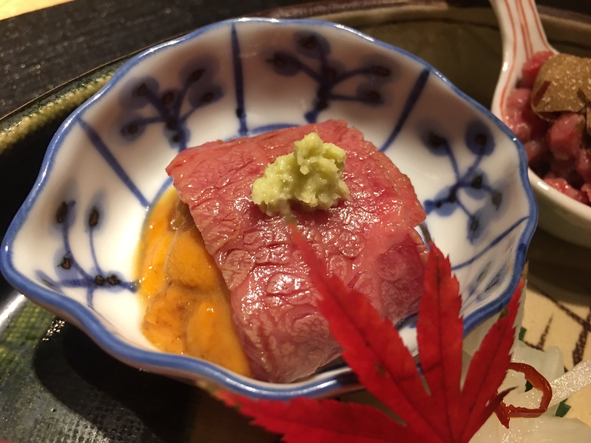 扇形的盘子很有感觉,点缀着秋天的枫叶和松针,里面是三种不同做法的牛肉刺身,牛肉寿司,牛肉海胆与牛肉粒配松露。其中我最爱的是牛肉粒配松露,牛肉粒有很快炙烤过的表面配上松露的香味,特别令人回味。寿司不是不好吃,只是对于我这个胃小的人来说,一个小饭团也是很占地方的。海胆加生牛肉,就是海陆结合的美味,海胆原有的甜味,加上牛肉和一些酱汁,没法形容,就是好吃