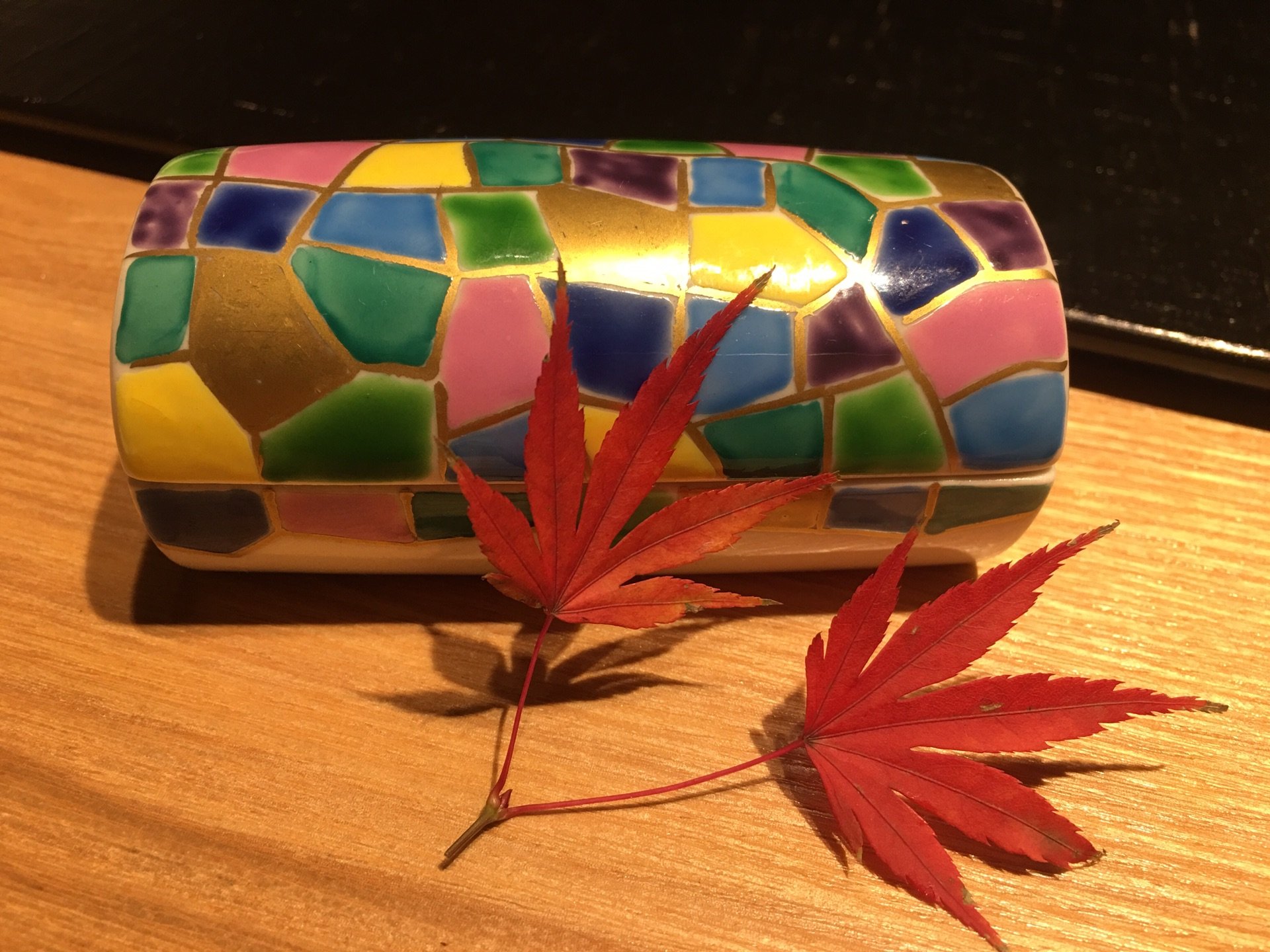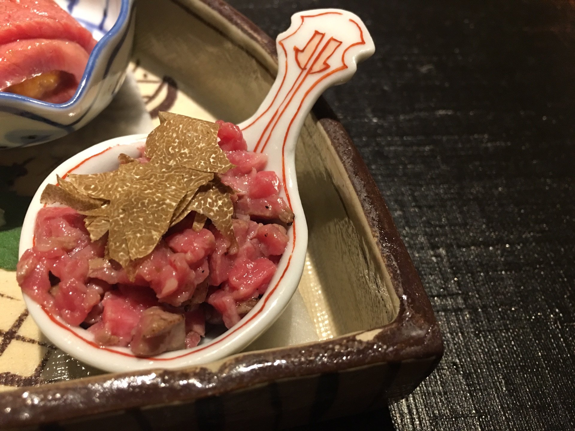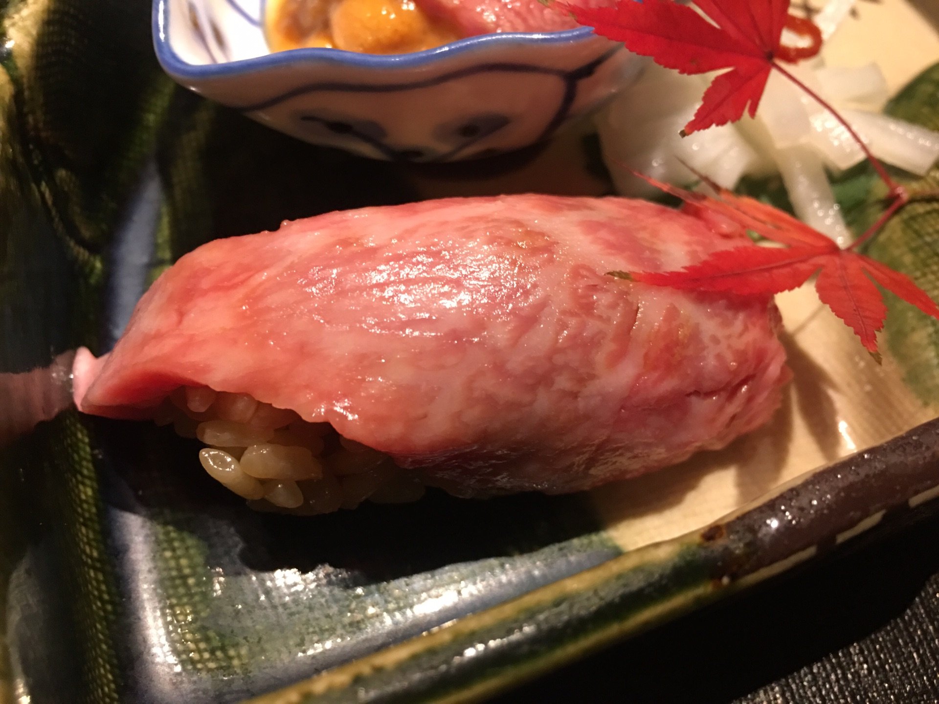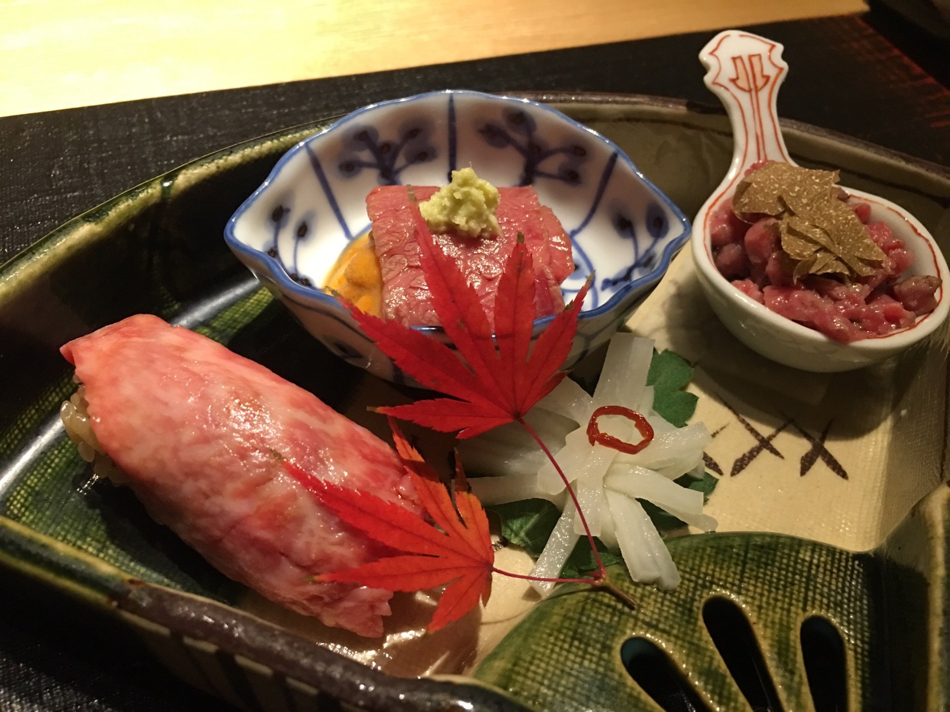 扇形的盘子很有感觉,点缀着秋天的枫叶和松针,里面是三种不同做法的牛肉刺身,牛肉寿司,牛肉海胆与牛肉粒配松露。其中我最爱的是牛肉粒配松露,牛肉粒有很快炙烤过的表面配上松露的香味,特别令人回味。寿司不是不好吃,只是对于我这个胃小的人来说,一个小饭团也是很占地方的。海胆加生牛肉,就是海陆结合的美味,海胆原有的甜味,加上牛肉和一些酱汁,没法形容,就是好吃