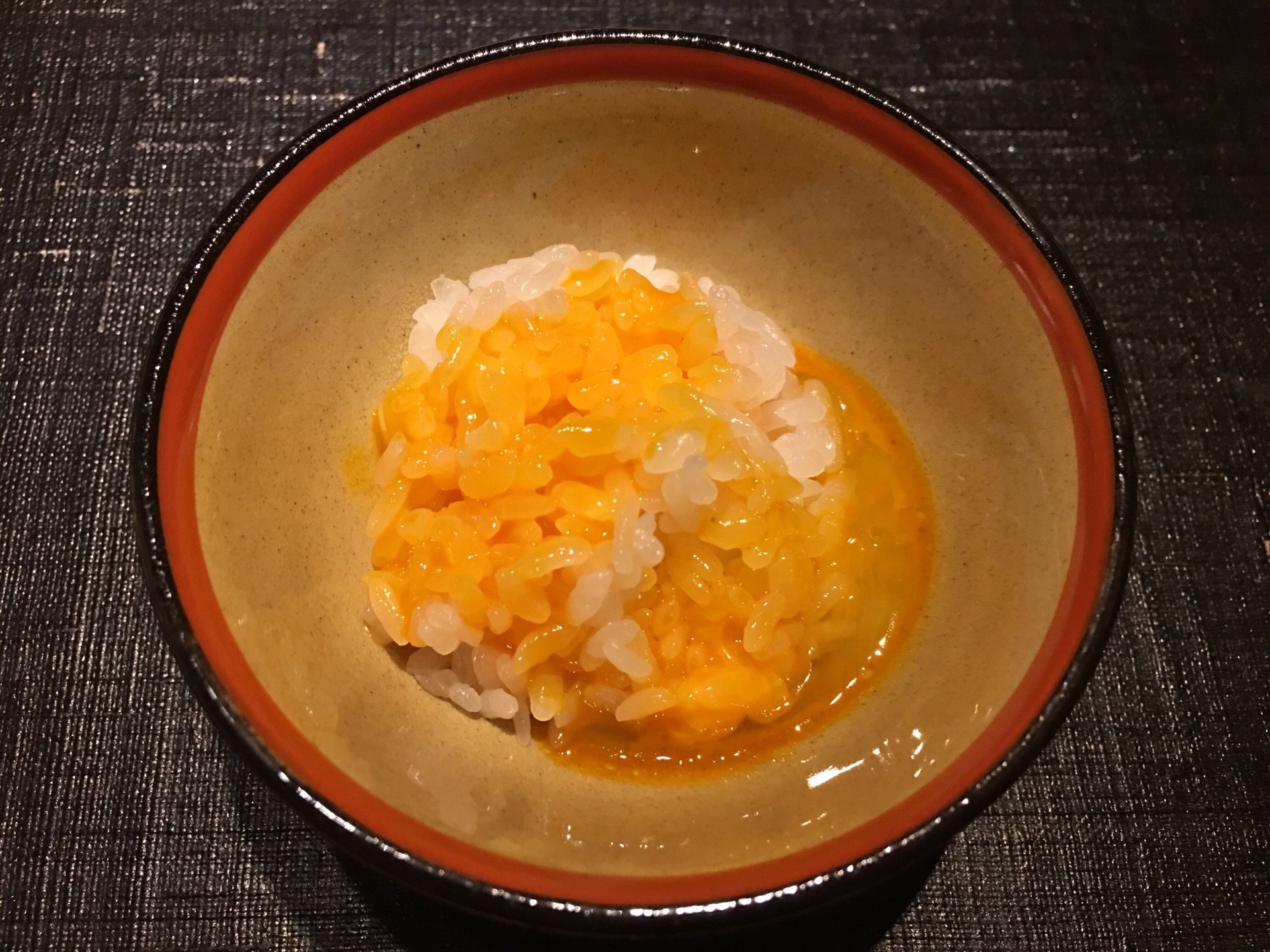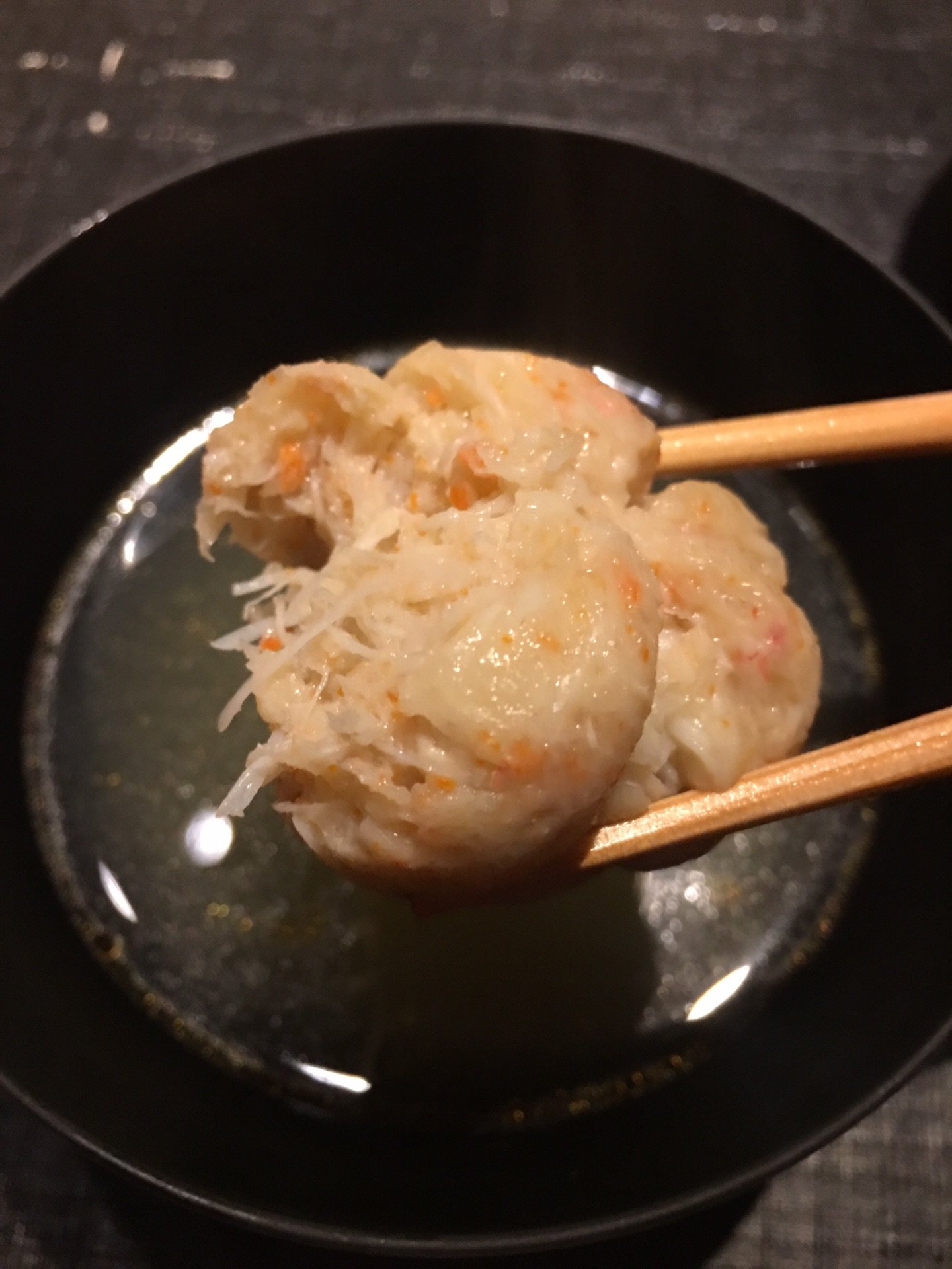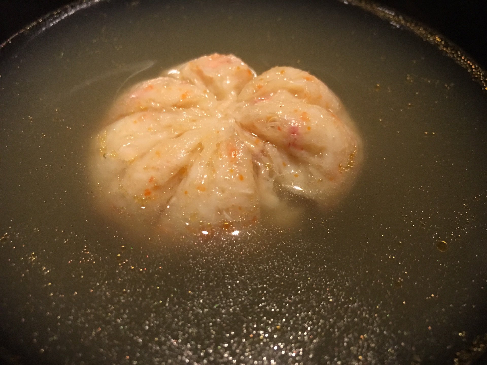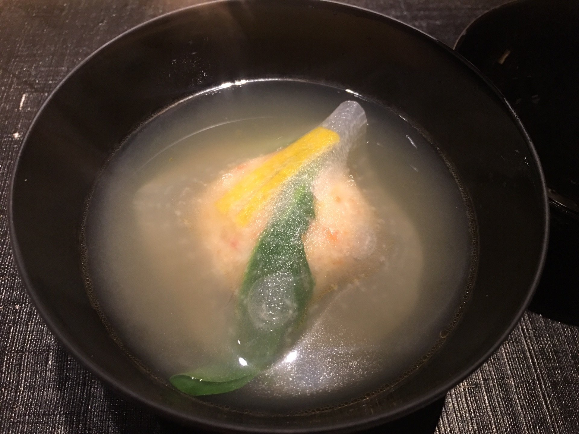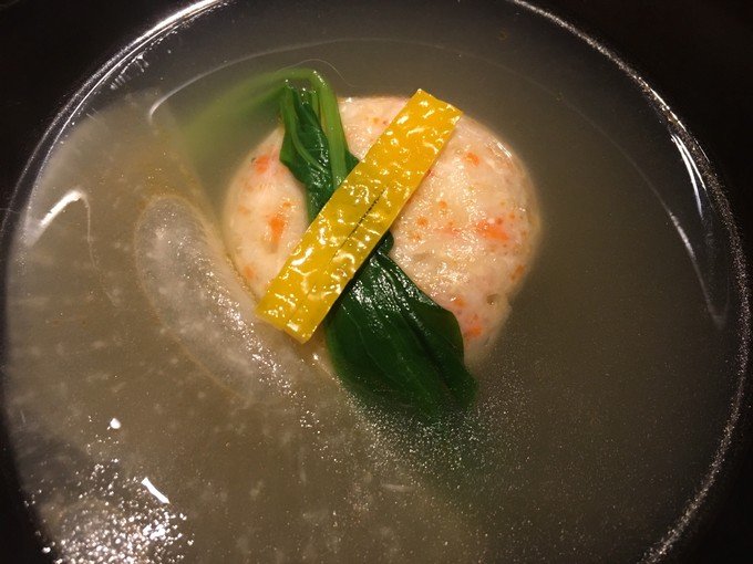 蟹肉丸子汤,薄片白萝卜遮盖着,朦朦胧胧的感觉挺美的,一根莺菜以及松野柚子,汤上漂着少量蟹黄的油,味道清淡,蟹肉有弹性,肉质鲜嫩,收住了原有的味道,在吃了几道肉料以后,让我已经满满的胃流入了一股清流,这个季节的蟹不用多说,都是好食材。