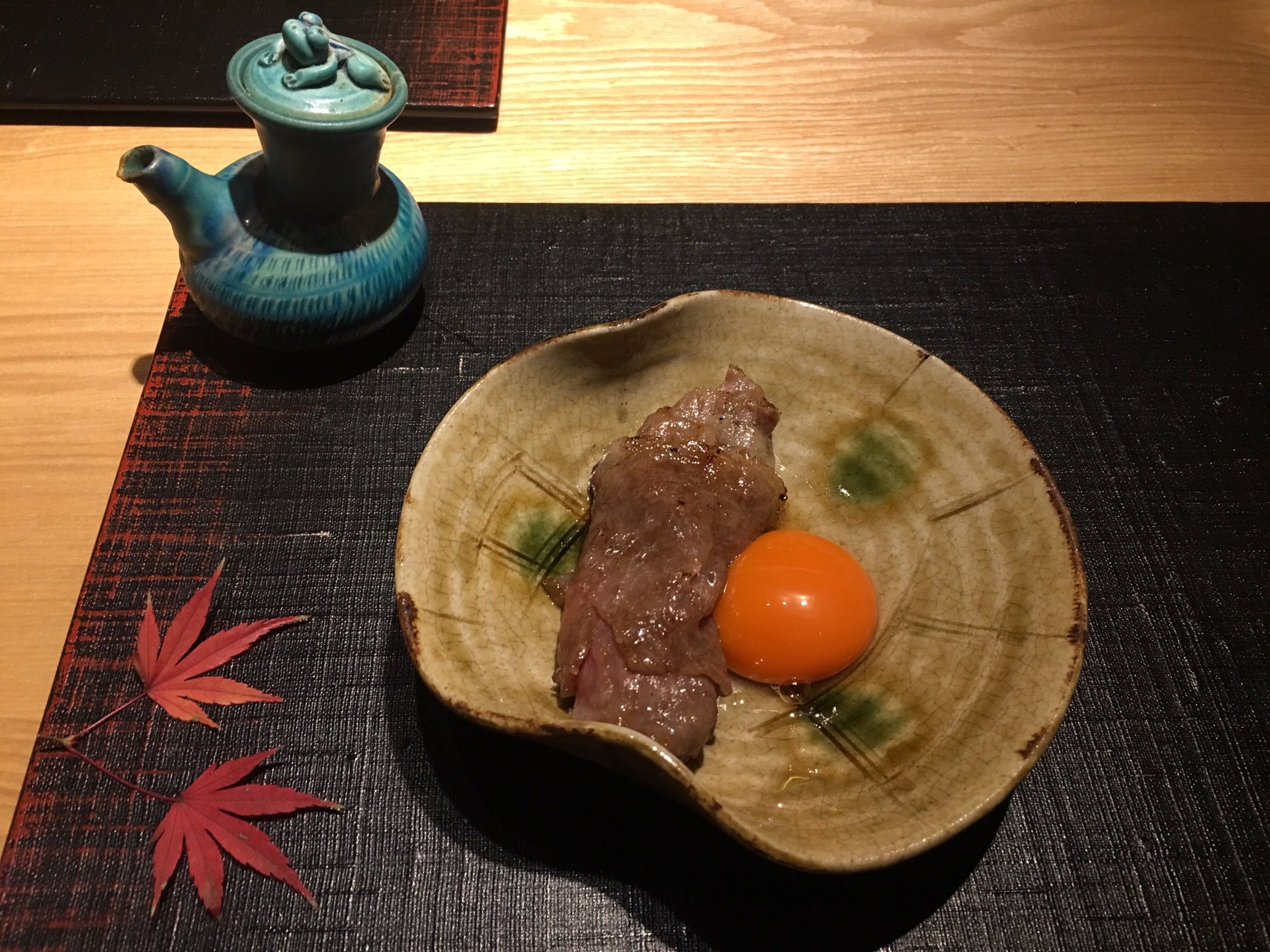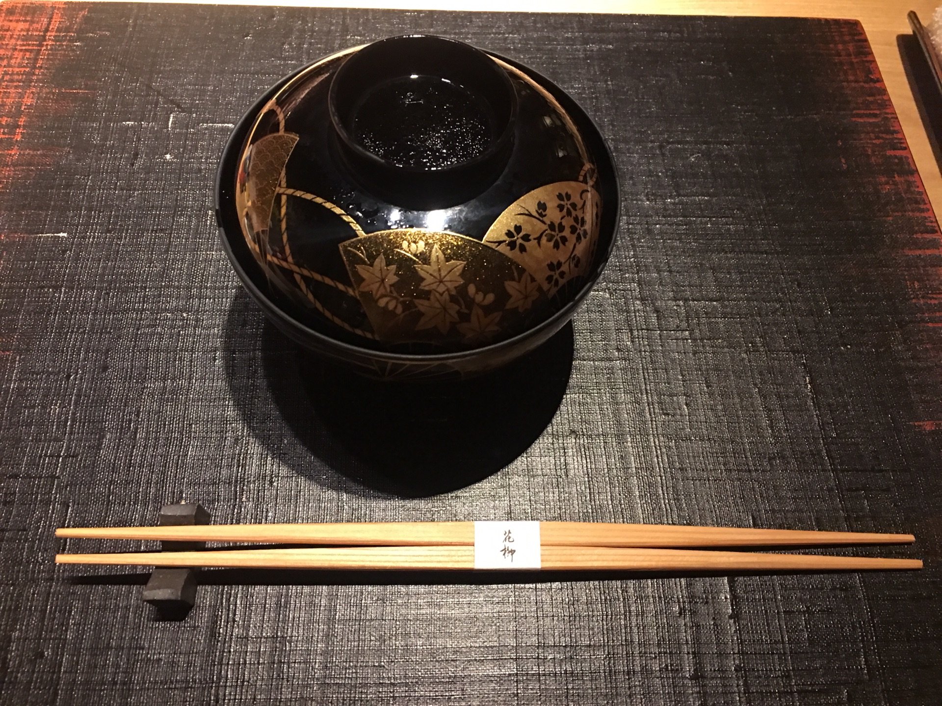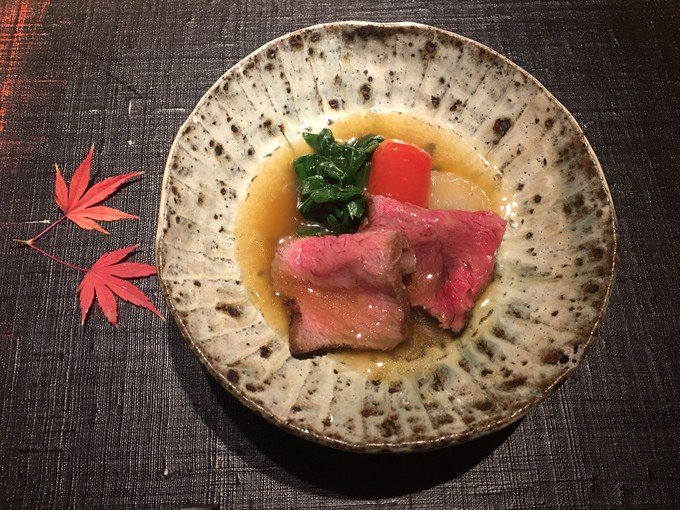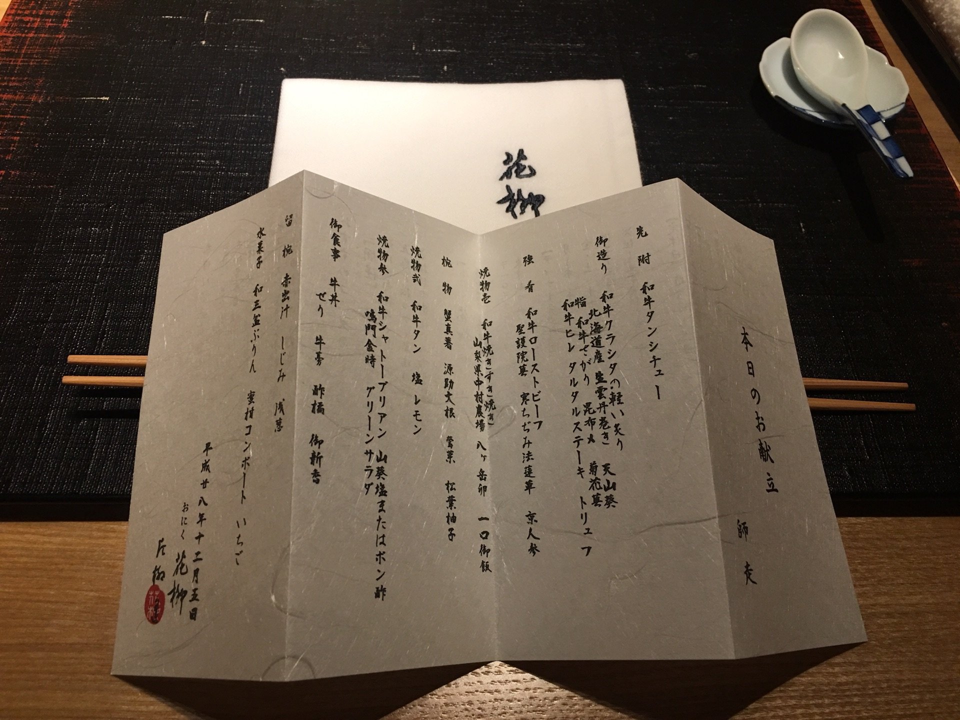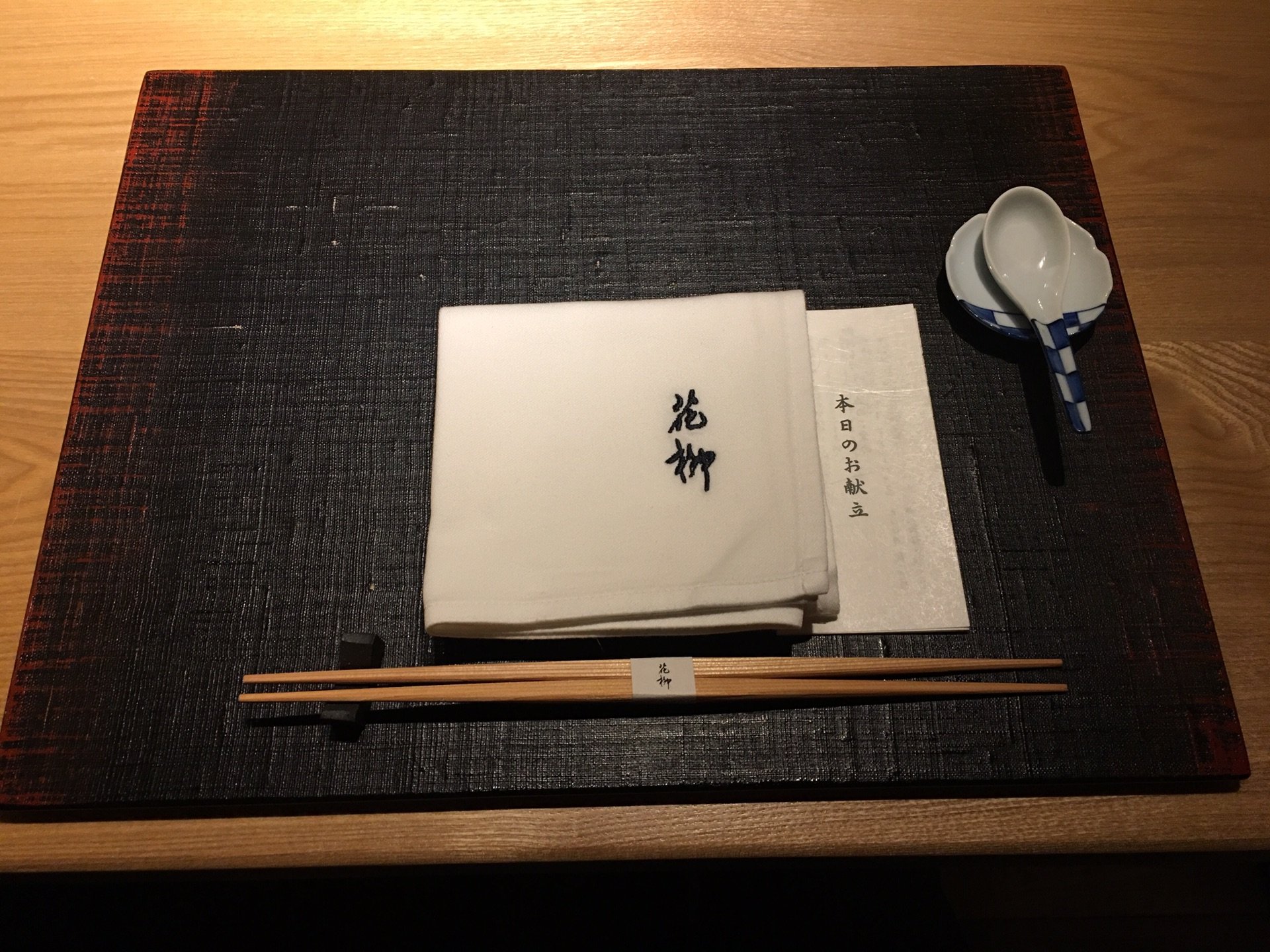 花柳这家店原名叫然,具体位置:〒103-0024 Tōkyō-to, Chūō-ku, Nihonbashikobunachō, 11−11-11, K1ビル1F,是吃和牛料理的一家米其林一星餐厅。从三越前站大约需要走8分钟,从神田站则需要12分钟时候。不太难预约,但还是记得提前约,我约到的是9:45晚上,好晚,但为了吃,吃货什么都不怕,可以说是无所畏惧。店铺座位不多,除了主厨,我只看到了2个店员,所有菜品都由主厨完成。店里的装修是木质日式一门包厢和3个围绕的席位,简洁不封闭却又感觉有了单独的空间。白底黑字的餐巾及和纸印刷的菜单也很符合我的心意~