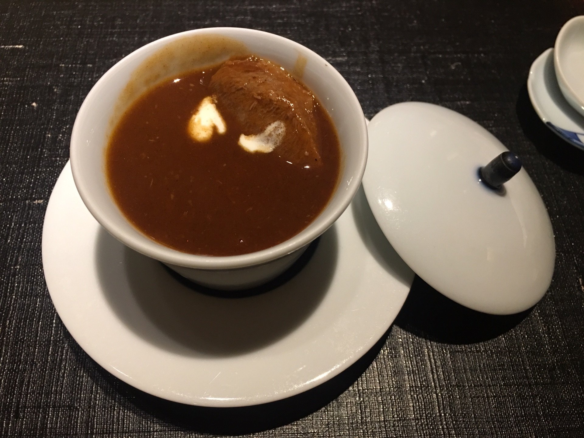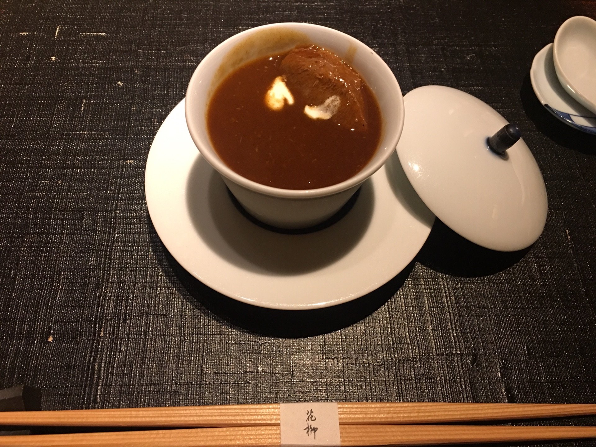 牛舌炖煮 里面有天山葵,昆布,菊花芜等,配了淡淡的咖喱点缀了一些芝士,牛舌很兰,易嚼,咖喱味道不重与牛舌的嫩滑可谓是相得益彰,也很开胃暖心。