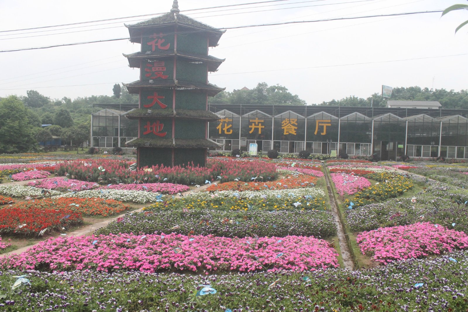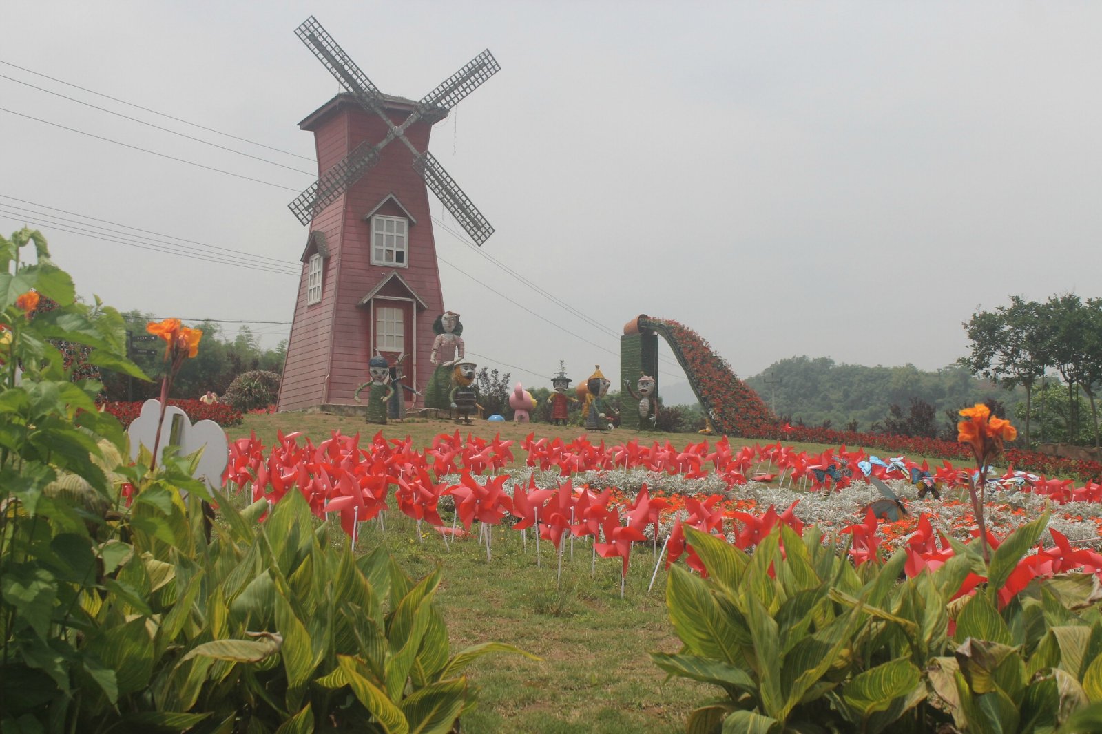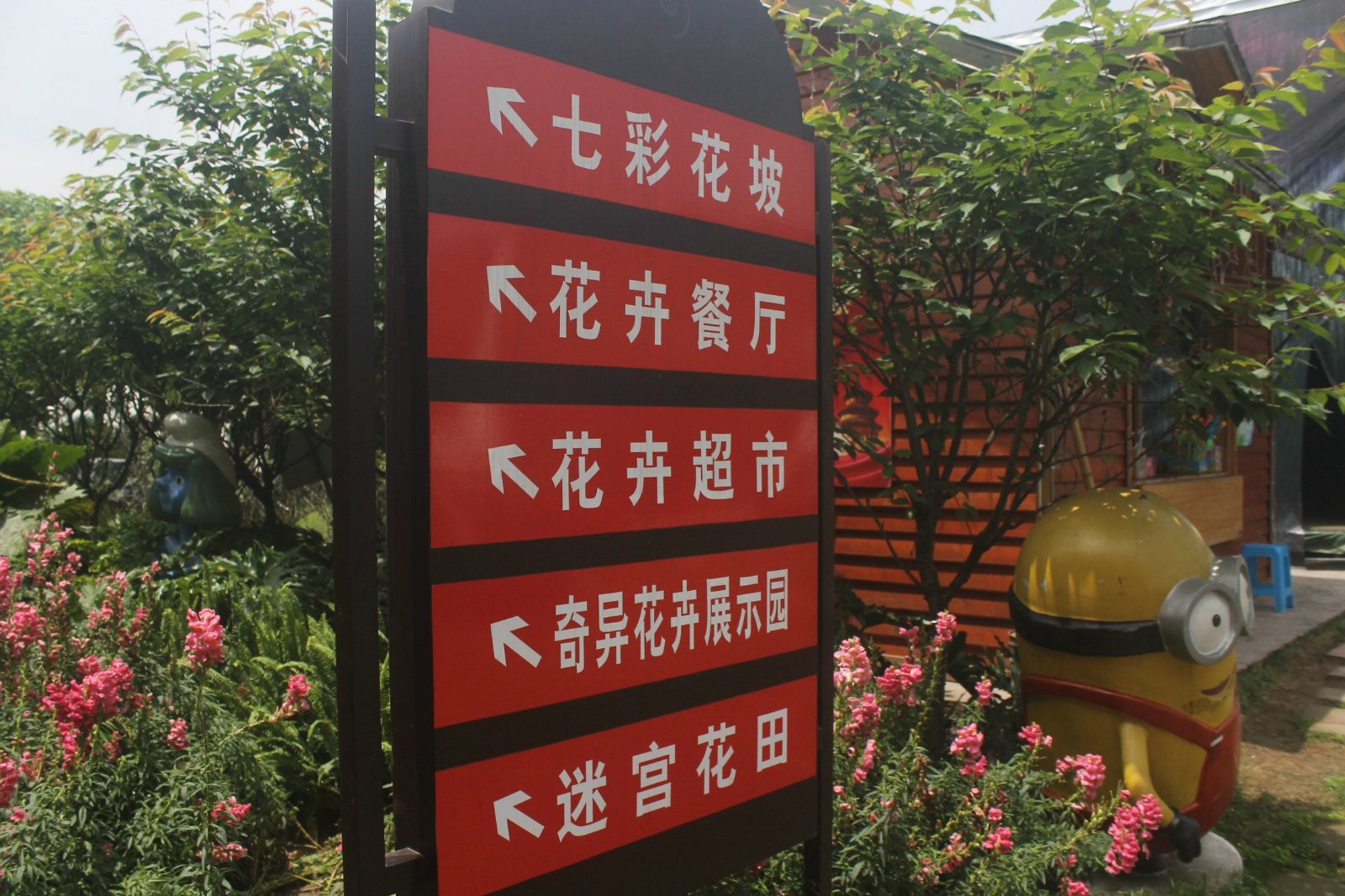 景区进门左边是七彩花坡、迷宫花田、花漫大地等景区。这片区域很大,七彩花坡引入很多卡通的原素,如白雪公主和七个小矮人、荷兰风车、花车等形象。迷宫花田仿造八卦阵,使人仿佛掉入花的迷宫之中。花漫大地这里也是凤凰花海景区内的一大亮点,塔楼造型的花漫大地在这一景区尤为醒目。其后方就是颇具特色的花卉餐厅。