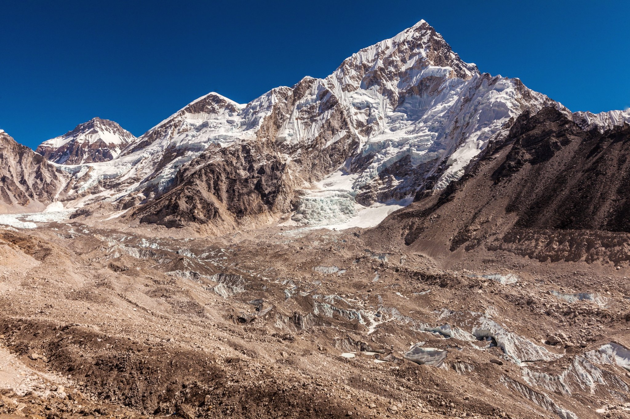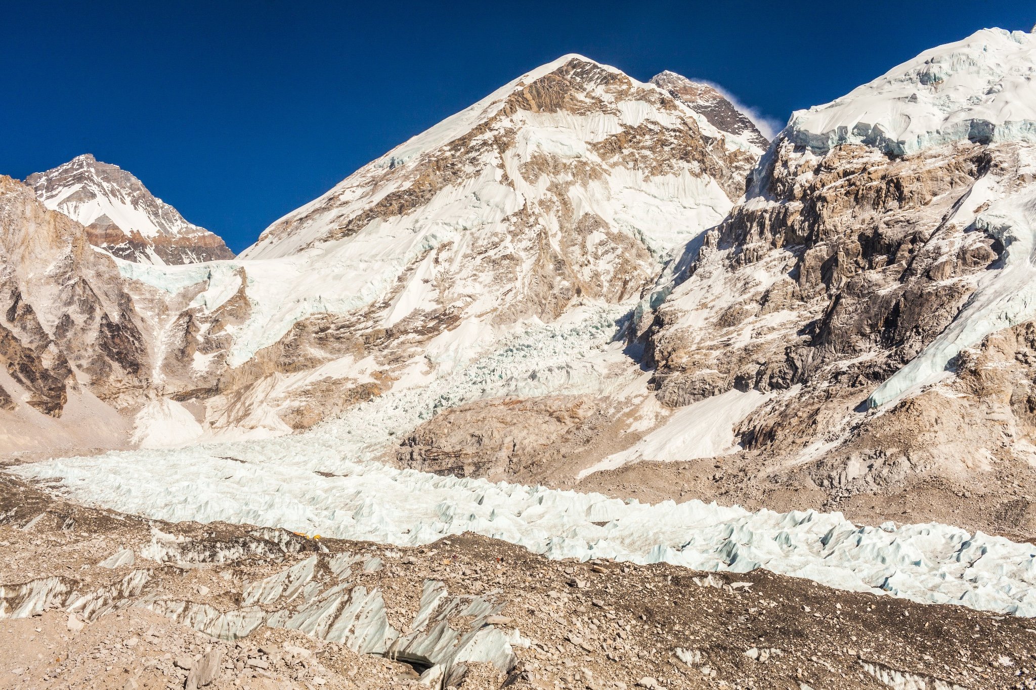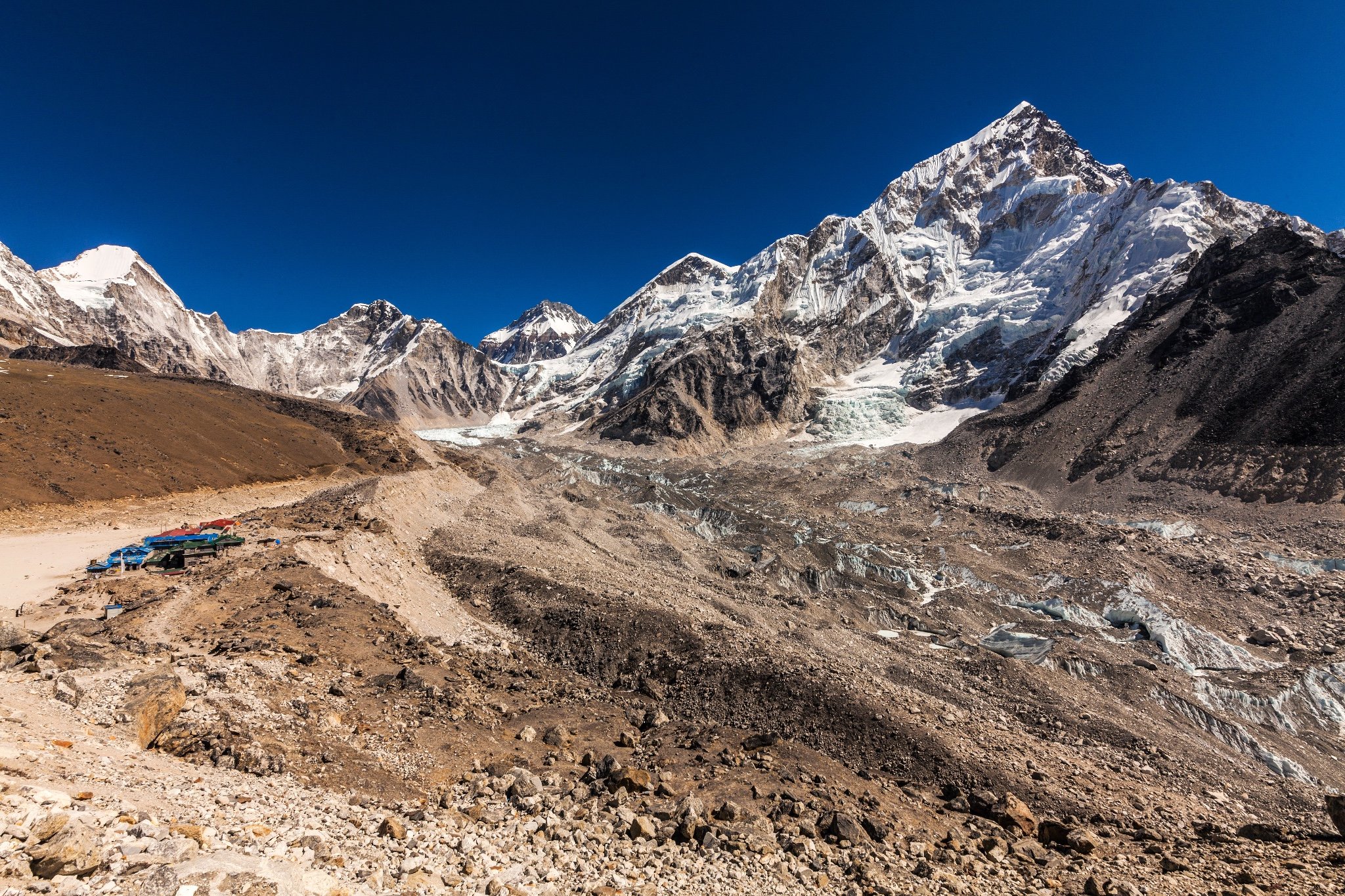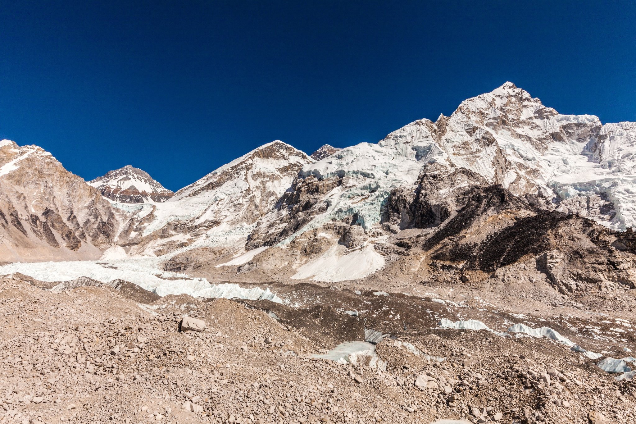 雪山前面就是昆布冰川,应该是地震的原因,冰川上面都是有很多沙石,但是非常壮观,冰川的尽头就是珠峰大本营。