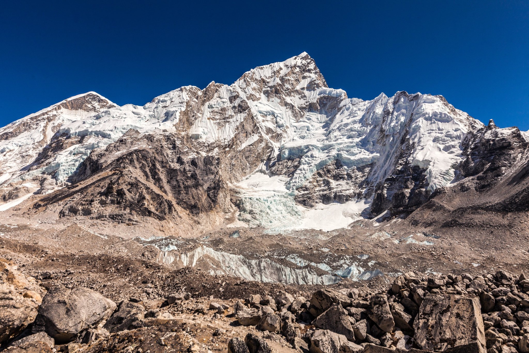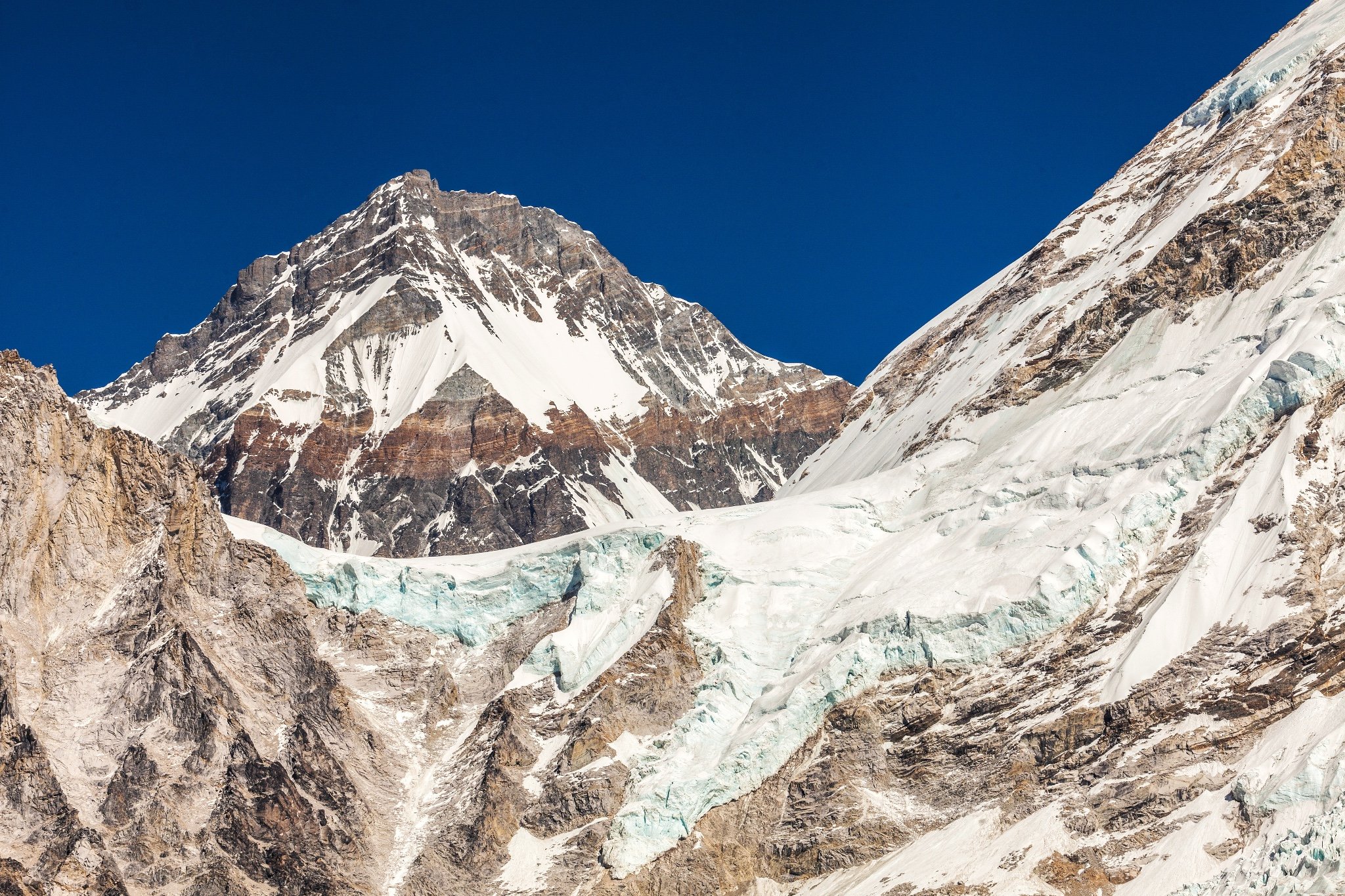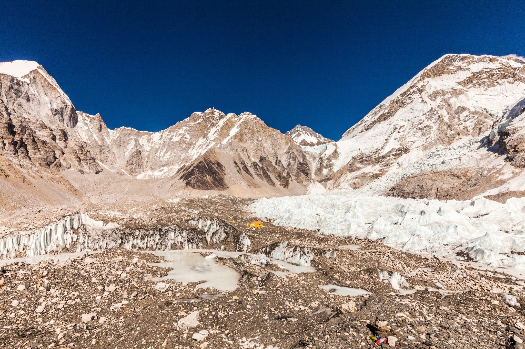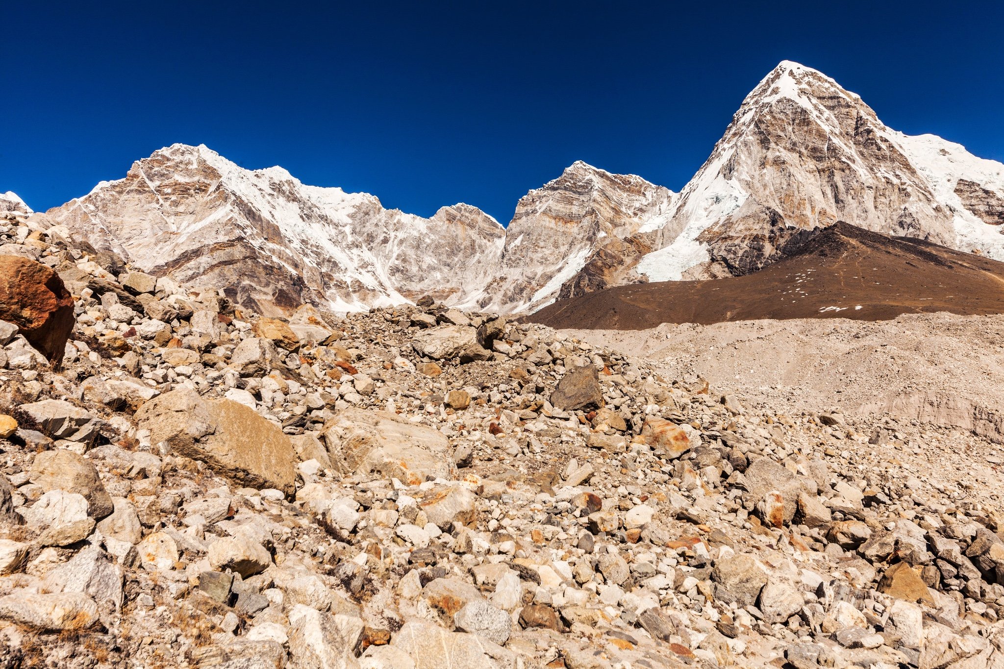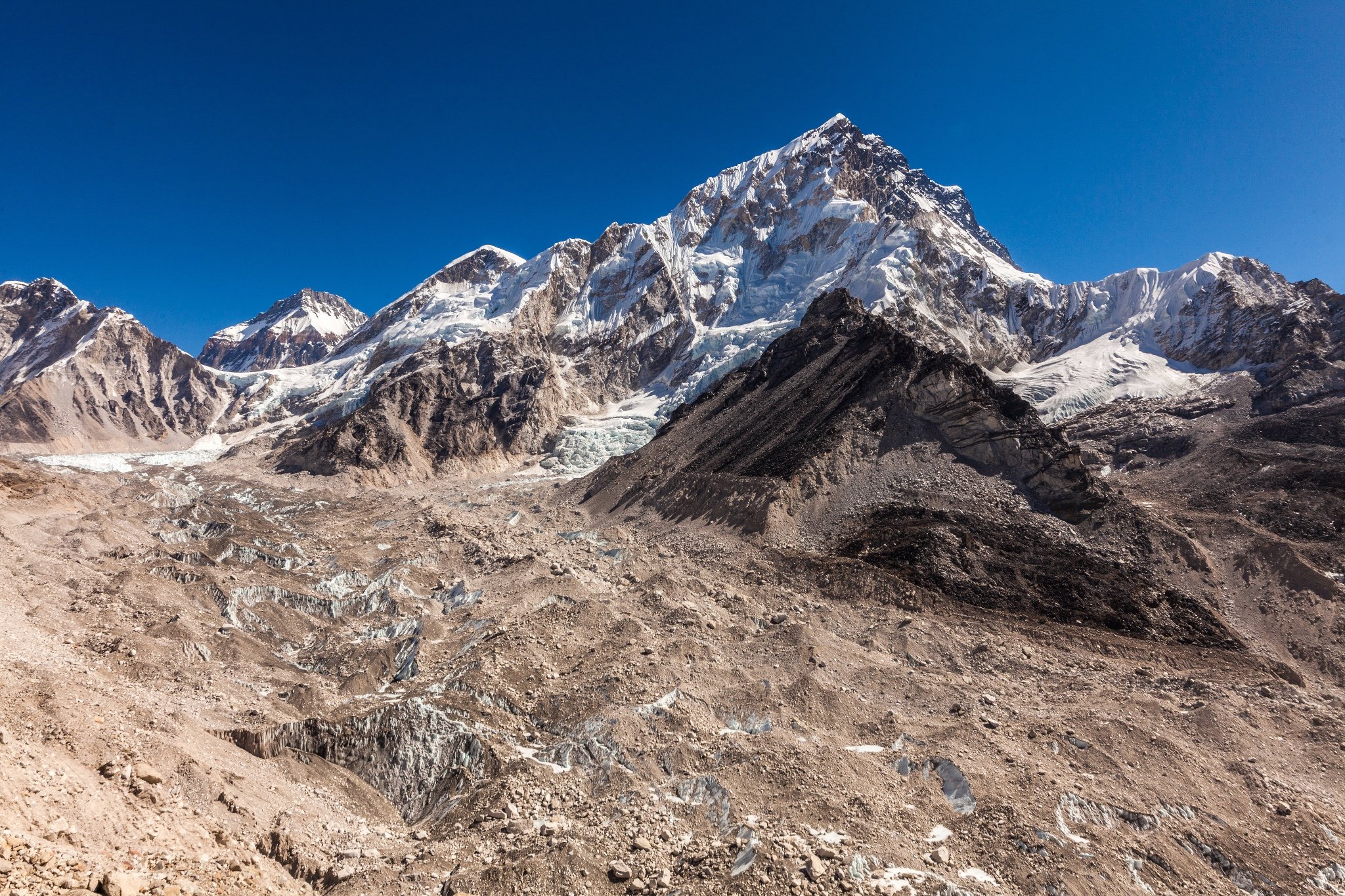 雪山前面就是昆布冰川,应该是地震的原因,冰川上面都是有很多沙石,但是非常壮观,冰川的尽头就是珠峰大本营。