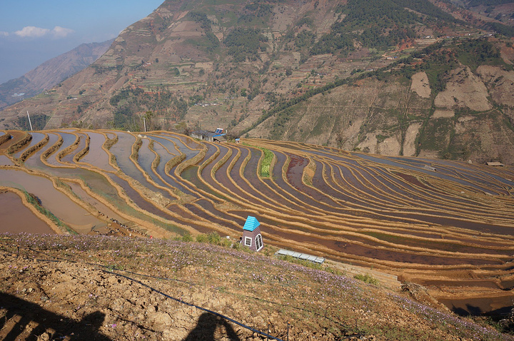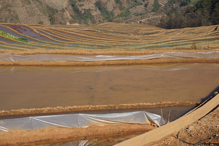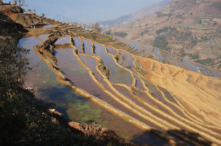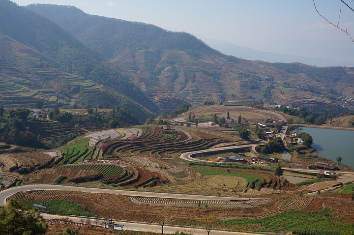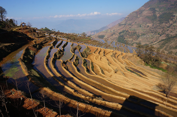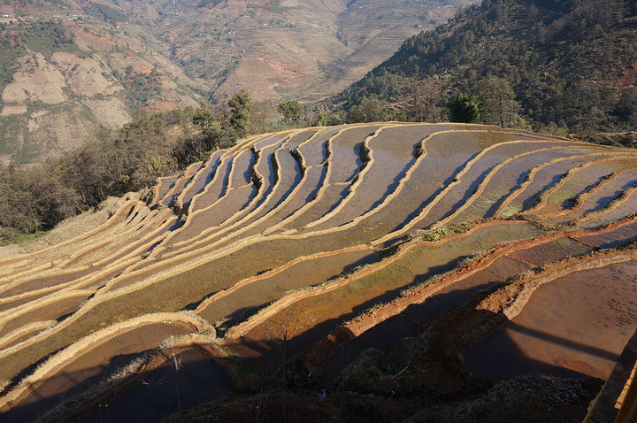 沿着人行步道,进入梯田景点,新山梯田依山沿坡修建,沿着陡峭的山坡层层向上分布,层层叠叠的梯田依附于龙头山、龙肘山下,特别是雨天云雾多的季节,山坡上的梯田在云雾笼罩下,非常壮观美丽。 冬天,米易县新山傈僳族村的千亩梯田开始蓄水,为来年栽秧耕种做准备。米易县新山村梯田主要位于莫佬河上游马鹿塘河与白龙洞沟交汇区,面积约1000亩,马鹿塘河、白龙洞河为其主要的水源,四季长流不息。 梯田,被称为“地球上最美的曲线”。 经过世世代代傈僳族人的努力,他们把周围的山谷用石块砌起田坎开垦梯田,引来龙肘山水灌溉,并在梯田中种植稻谷、玉米、土豆、烤烟。 盛满水的梯田就像一面面镜子,折射出银色的光芒,景色壮美。 无心插柳般在山河间留下令人惊叹的“艺术品”,连绵成片的壮阔、层层而上的错落之美造就了梯田绝佳的视觉效果。 遥望对面山坡的梯田,一道道精致的线条,构成一幅美丽的画面。 各种不同的颜色,梯田,就像在大地铺上一层五彩斑斓的傈僳族的织锦。 傈僳族历时1300多年雕刻的“大地雕塑”。那是面与面交叠的美丽,线与线交汇的神奇,线与面交融的感叹。 如果有时间,新山梯田拍摄时间是夕阳西下,晚霞映照的时候。 大山里随处可见的梯田装饰大山,远远望去,像一条条琴弦在拨动。随着山风发出动听的音乐。