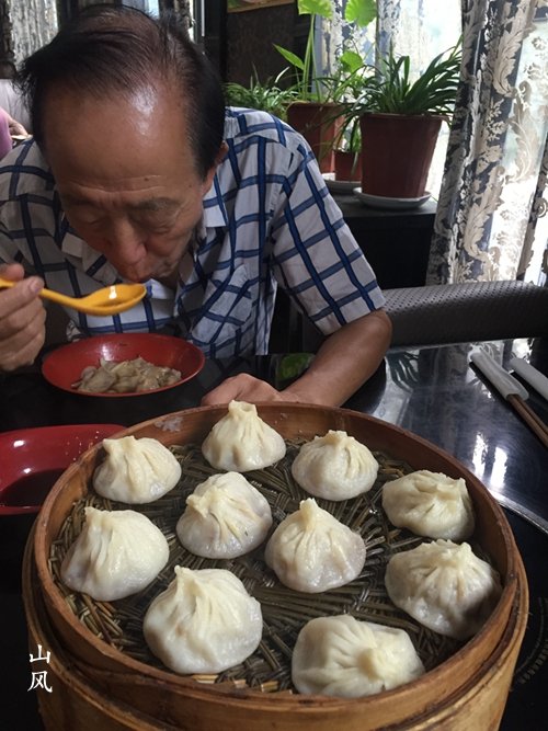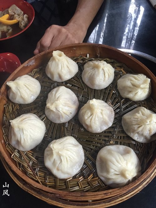 我们一家三口早上本想吃一碗正宗扬州炒饭再出发的,找了一圈没找到,又来到老苏北饭店。再来一笼灌汤包,