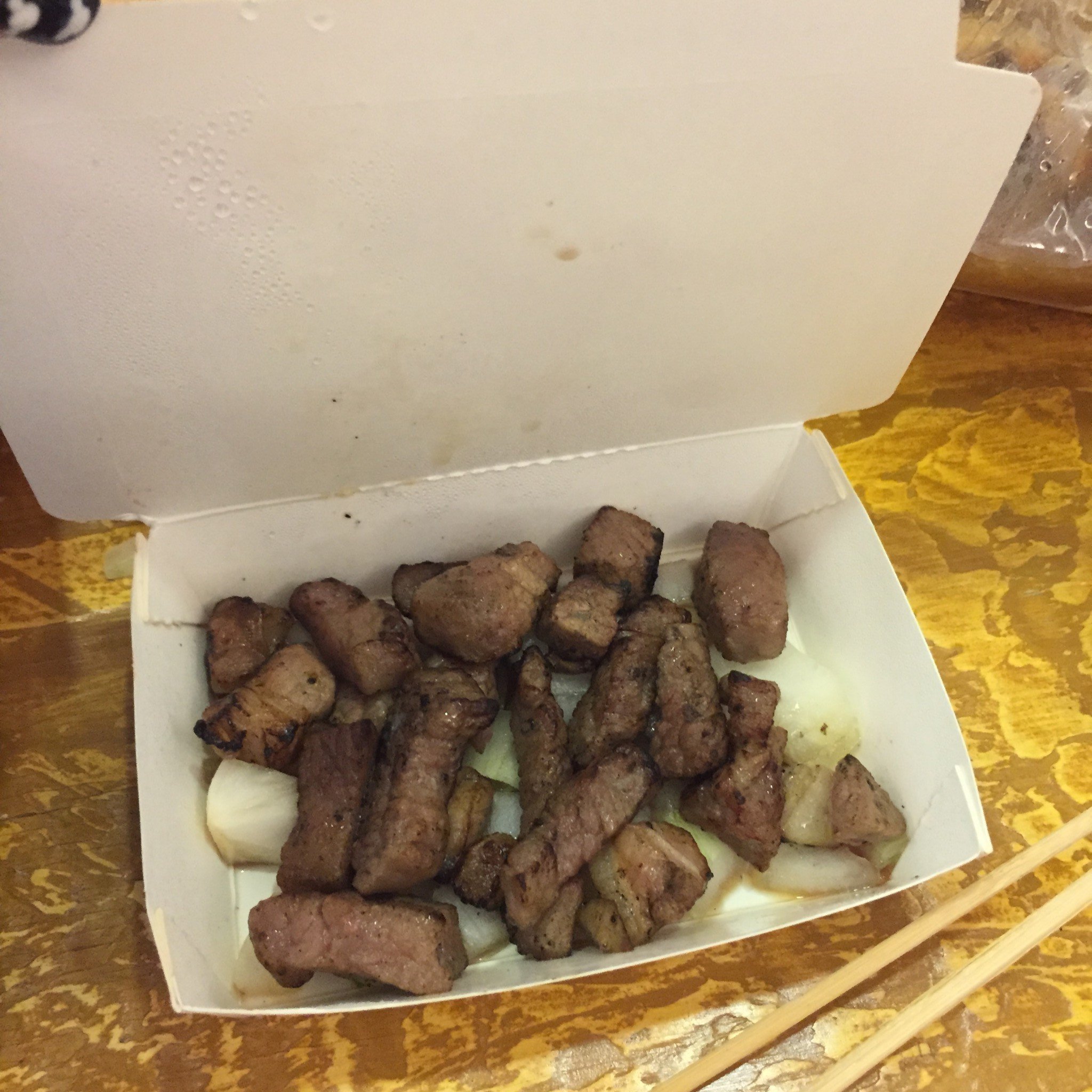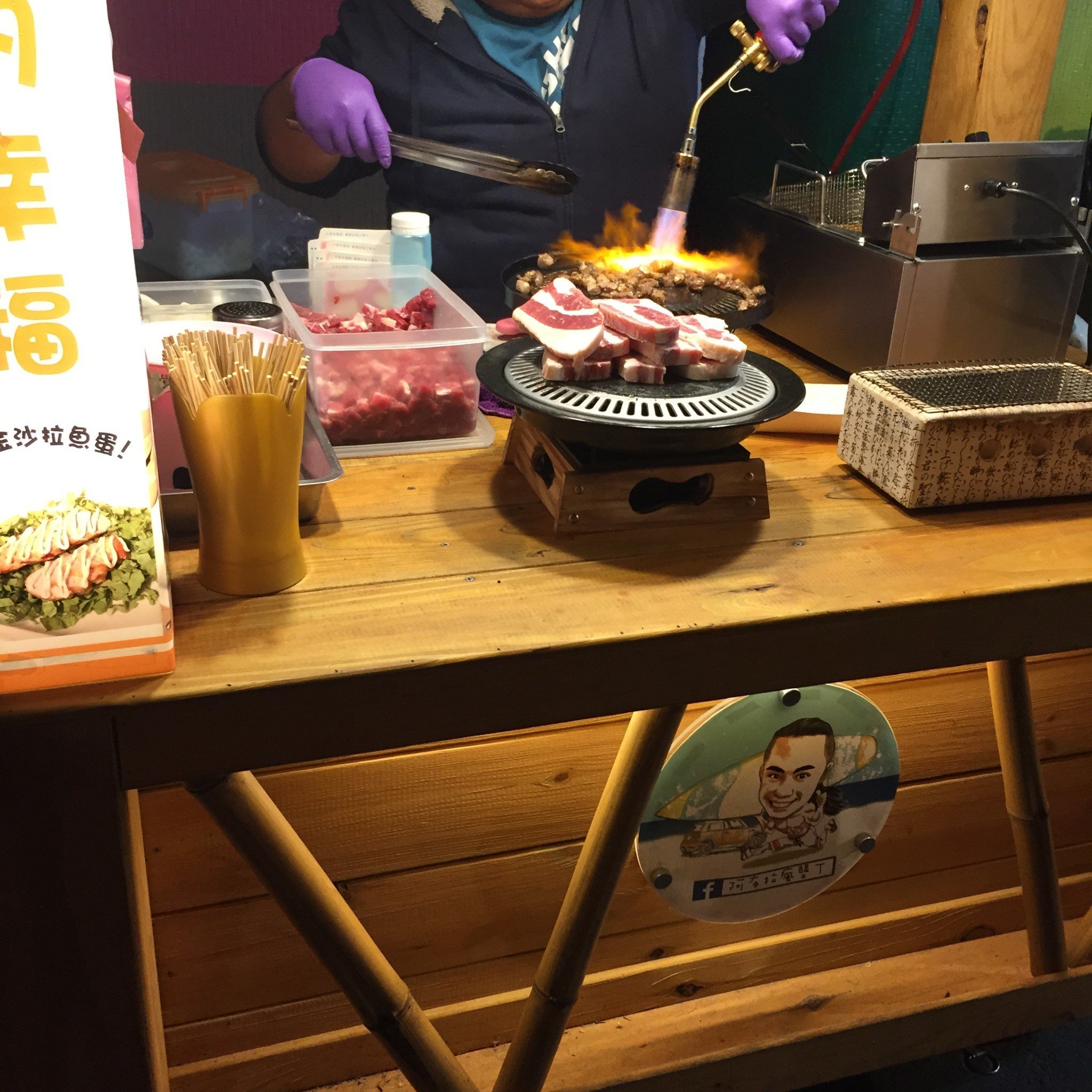 好爱吃那个火焰牛排,在台湾,只要是能去夜市,我俩都会把这个吃一次,200NT$。一品卤味,就相当于是个甜甜的麻辣烫,称重的,花多少钱的都有。水果茶,只有一个摊位在卖,超级好喝,50NT$。