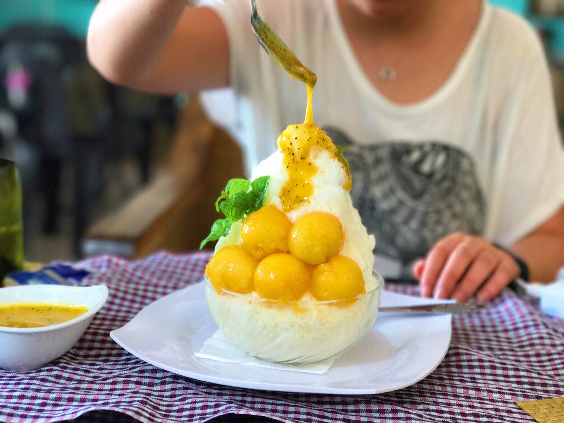 点了一个Mango Ice-cream Mountain with passion fruit,白白的底是香草冰淇淋刨冰,淋上百香果酱真的又好看又好吃。