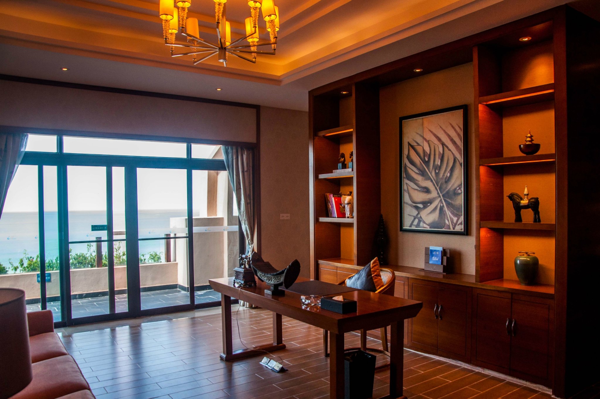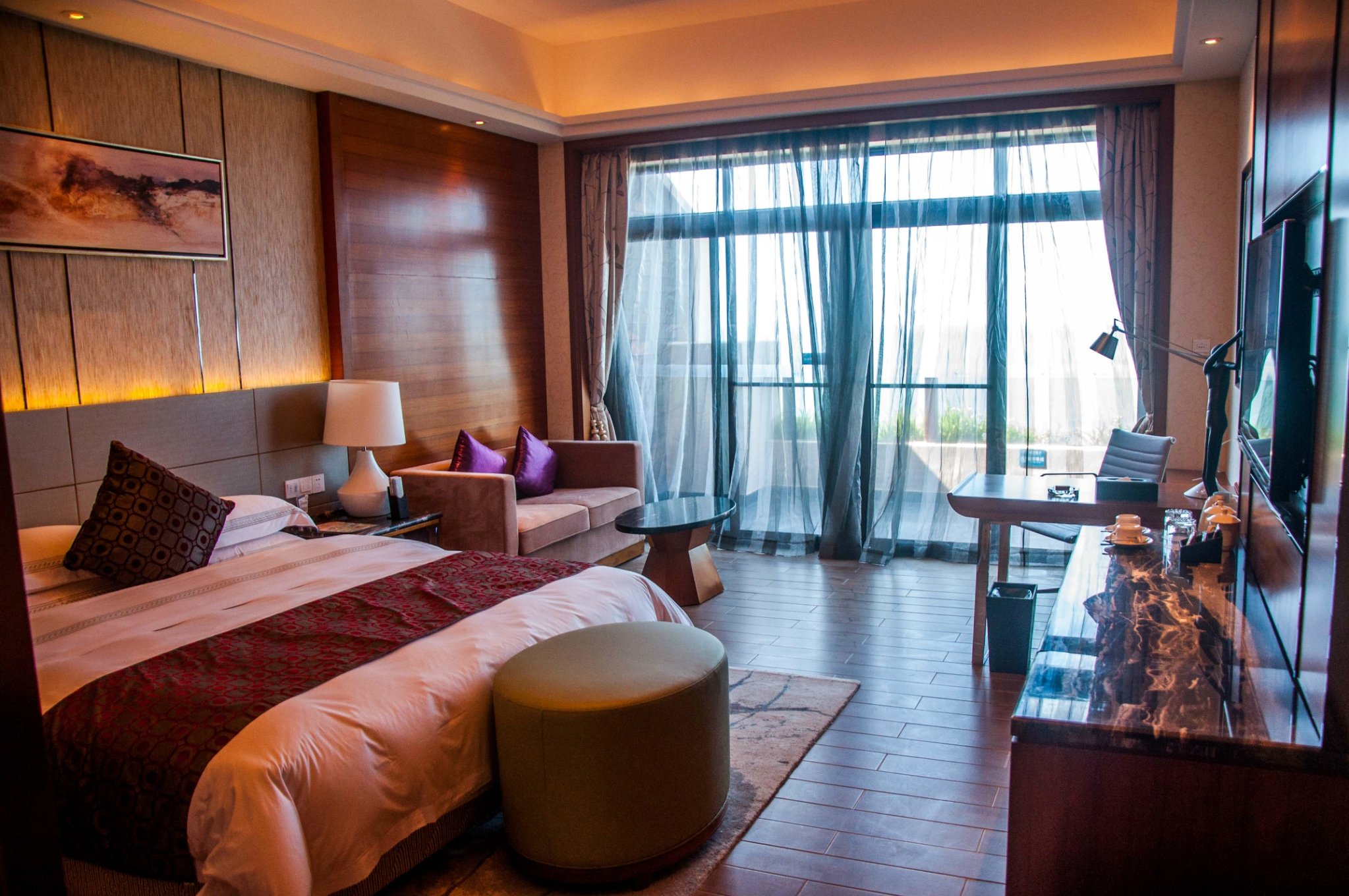 和大堂副理黎肖虎聊天得知,酒店一共有五百多间房,全部临海一线展开,均为180°全览海景客房,而此次我入住的酒是豪华海景房,每个房间都有个超大的观海阳台,拉开窗帘,映入眼帘的是酒店精致的园景和一览无余的海岸线。