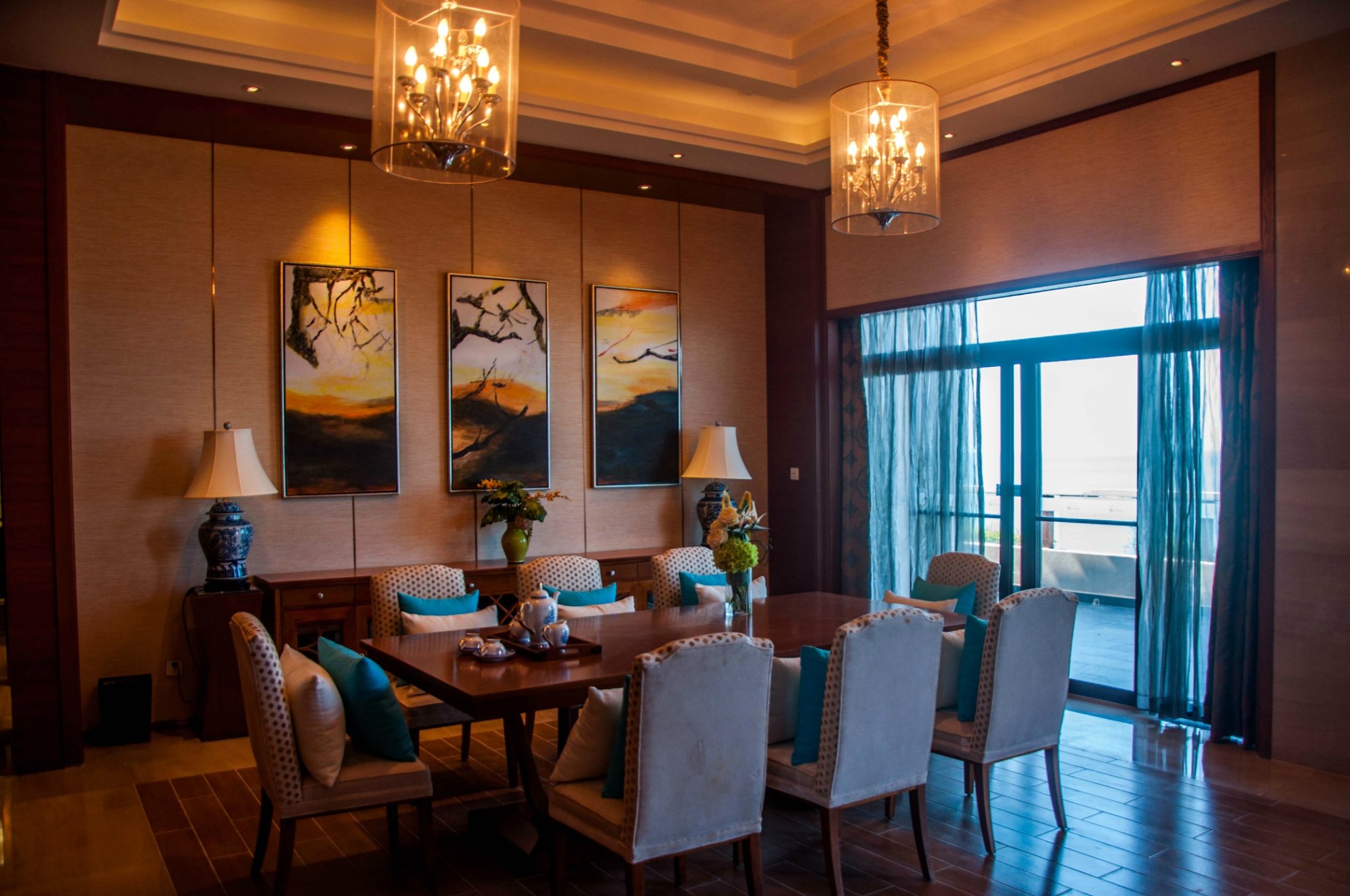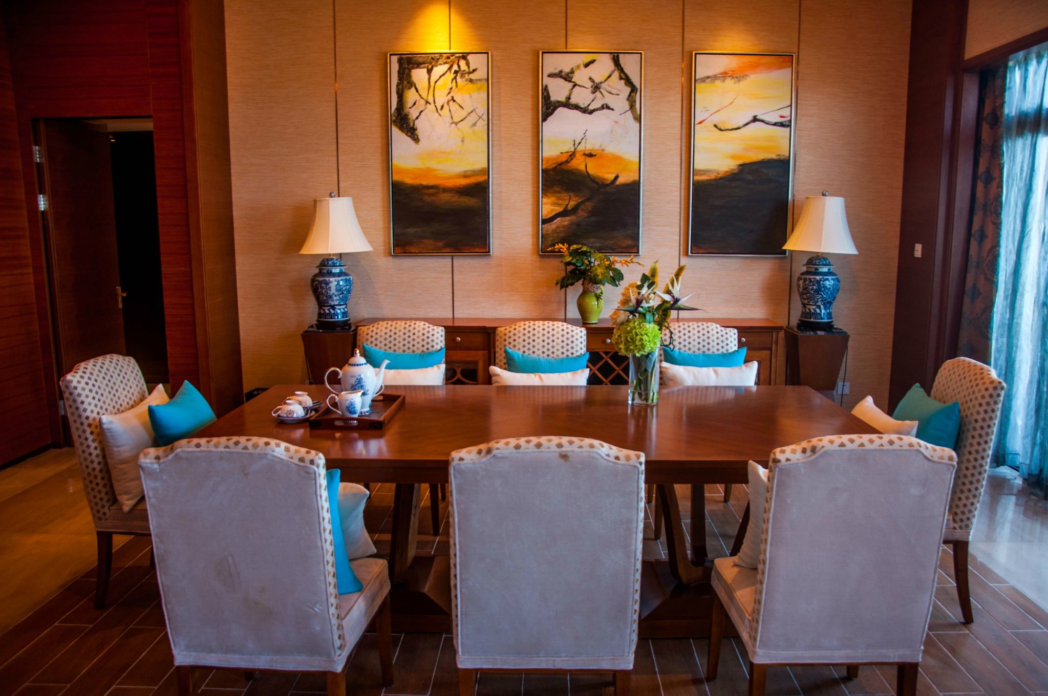 用餐区的椅子和餐具茶壶看起来也十分考究。