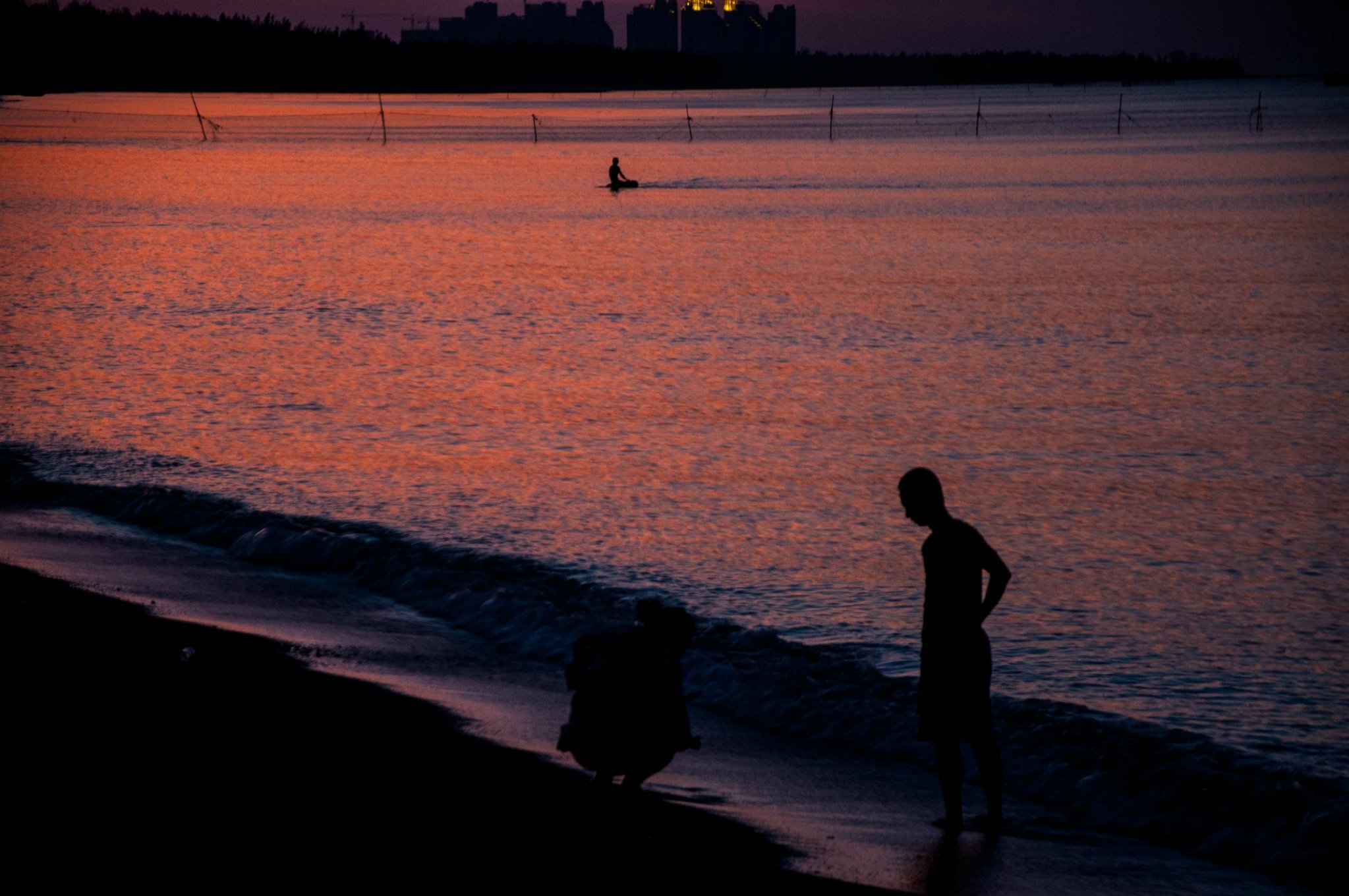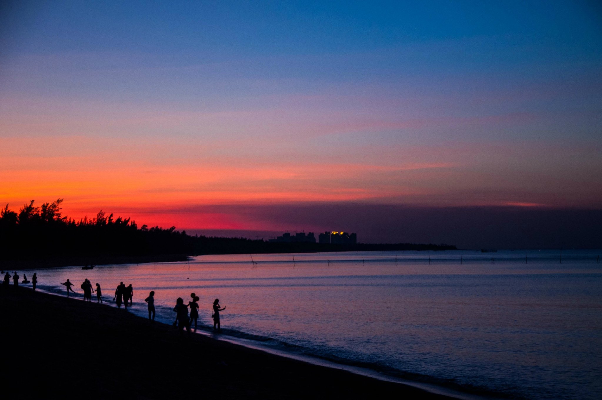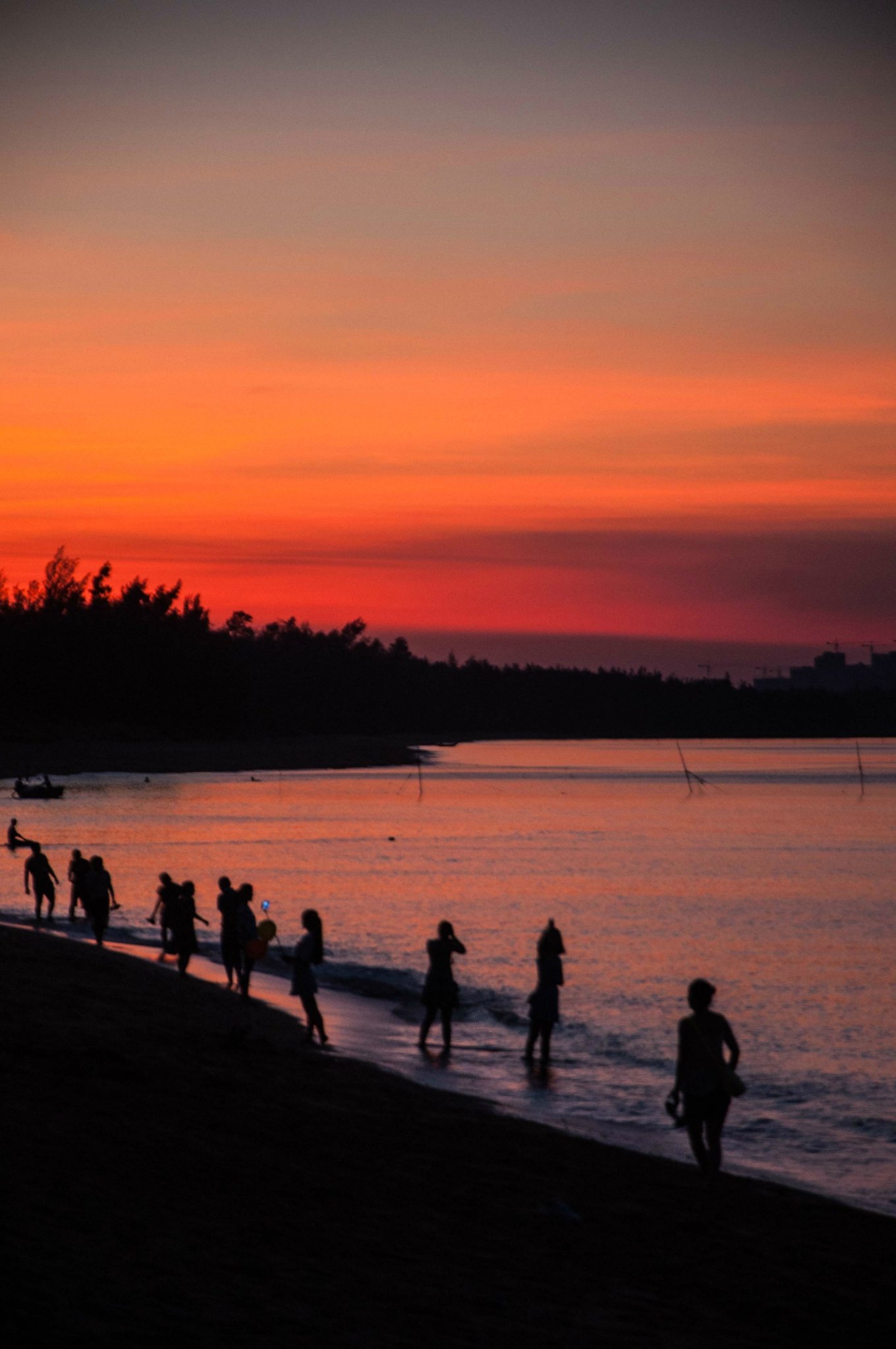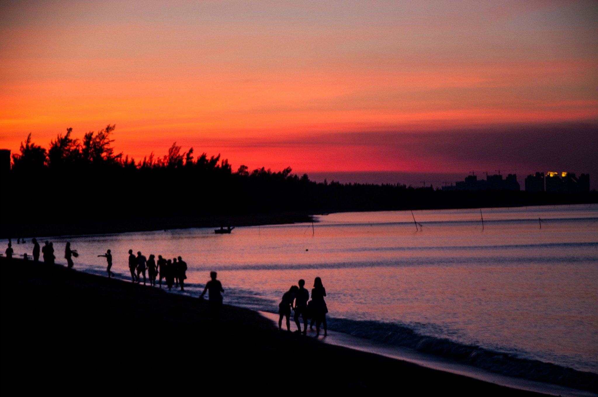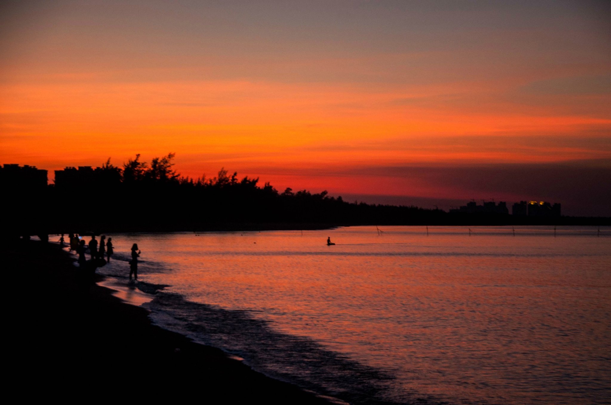 泡完了温泉,沿着泳池的木栈道走下沙滩,夕阳映红了天际,一片火红的光瞬间布满相机的取景器,金沙滩的日落,太美。
