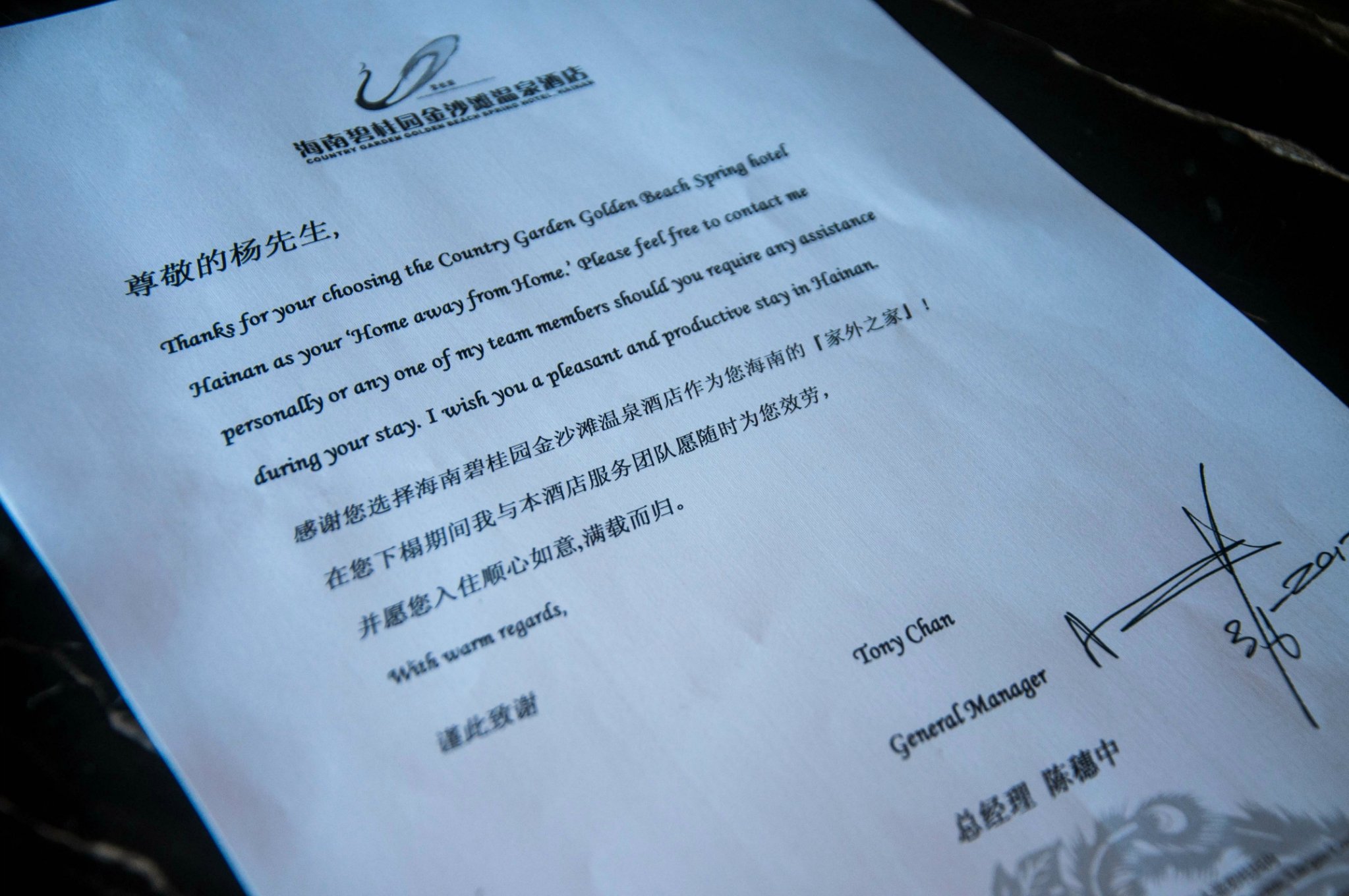 工作区的办公桌上放着贴心的欢迎信,随处可见酒店的用心。