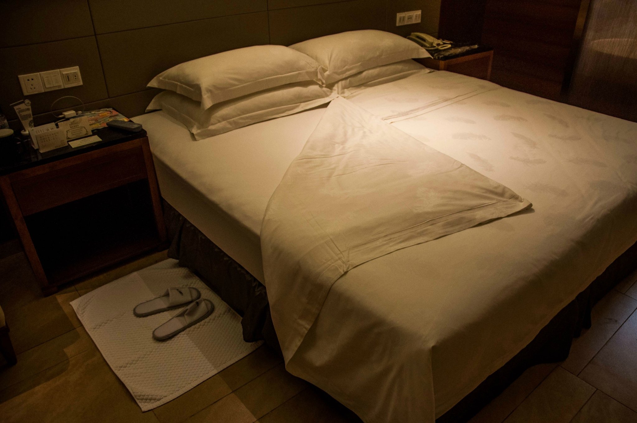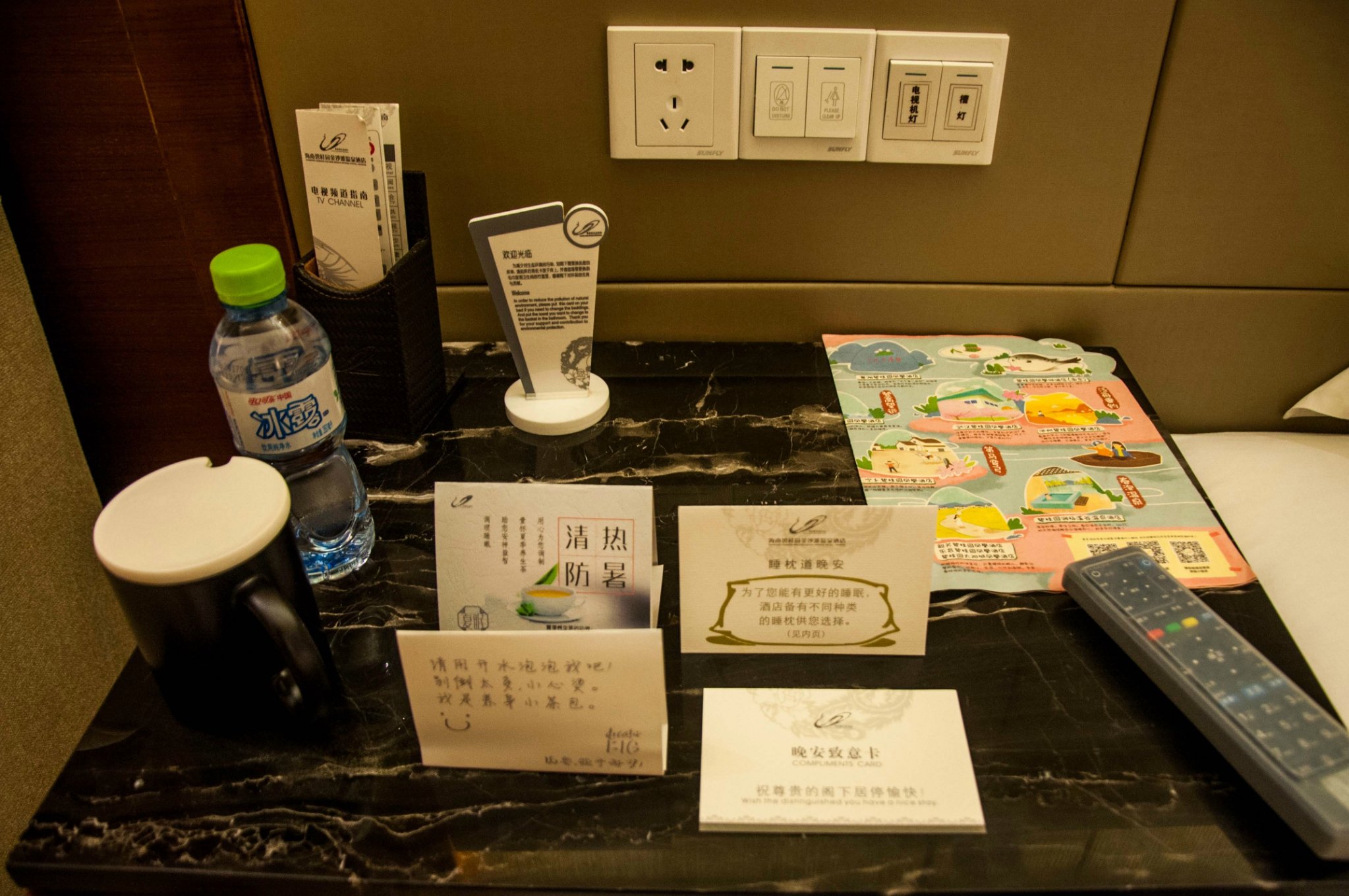 欣赏完美丽的日落,回到房间看看电视,冲个澡就准备休息了,却意外发现床边已经放好了拖鞋,床头有工作人员留下的小纸条,茶杯里放好了清热祛火防暑的清茶和热水壶里已经烧好的开水,还有询问客人意见的小卡片,真的是温暖又贴心,碧桂园的客房服务,真的赞。