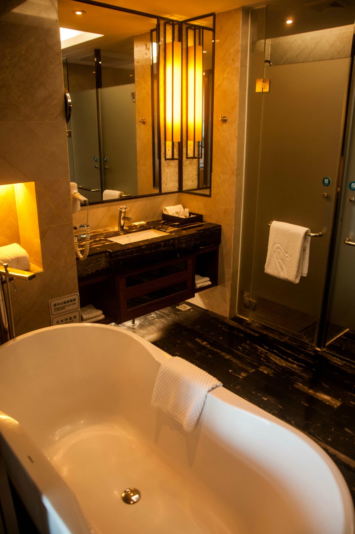 左侧是淋浴间,右侧是卫生间,卫生间内居然还有电话。卫生间和浴室独立是高端酒店标配,不容易滑倒,多人入住时提供了更好的便捷性和私密性