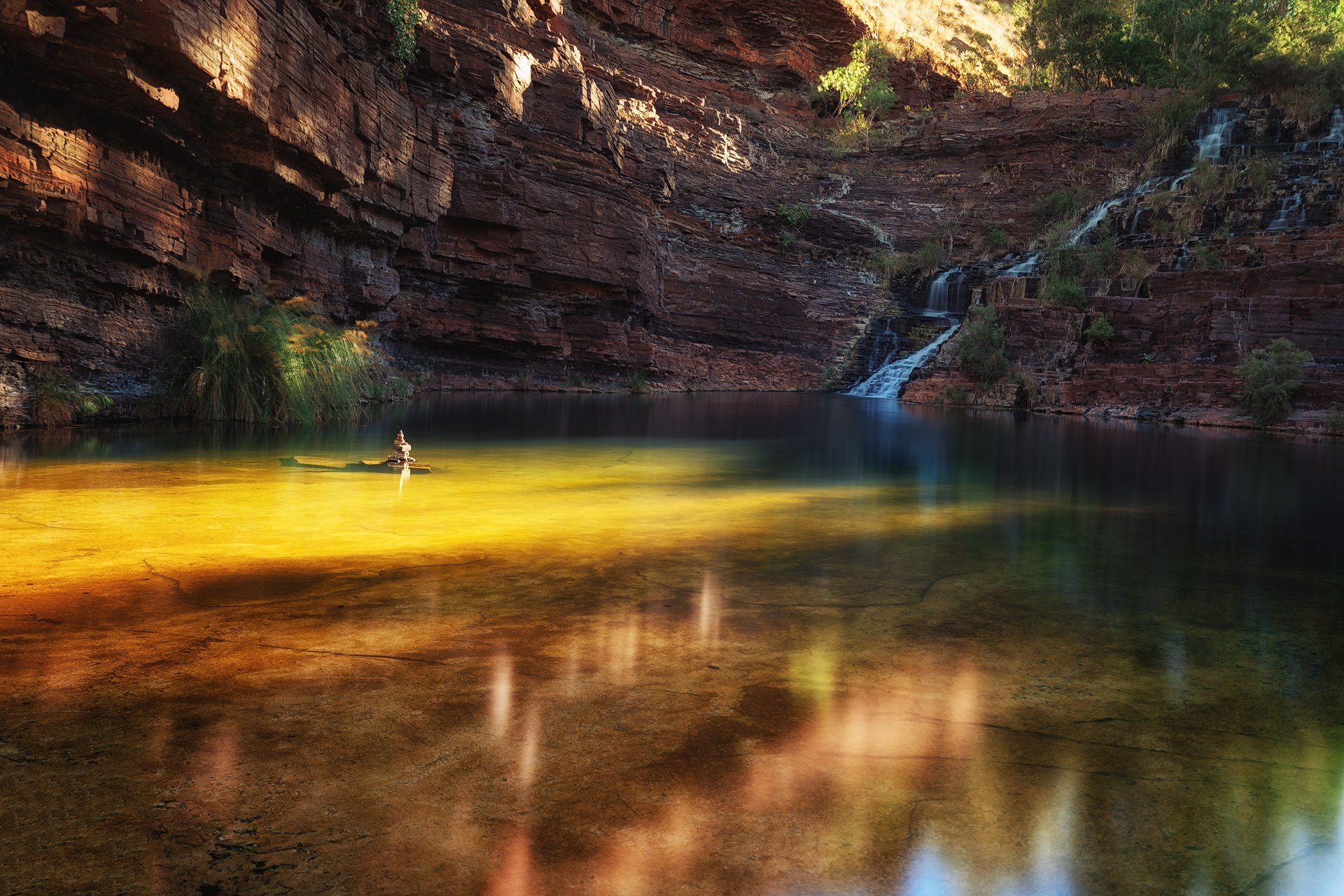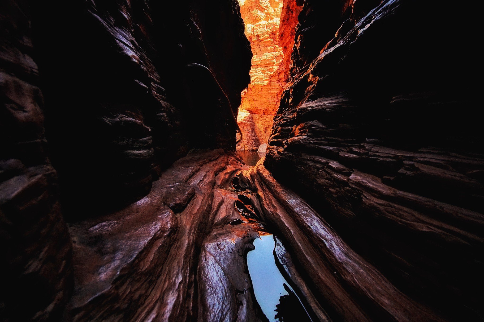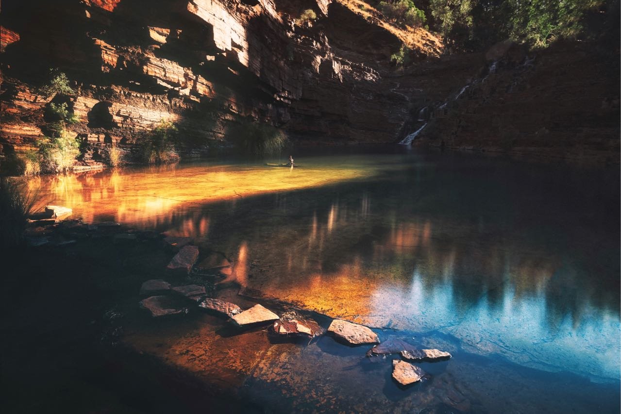 Karijini有名的是徒步,这里按照几个等级来划分徒步路线,通过徒步的方式,探索到深处的峡谷。我们去探索了两处峡谷,第一天是Weano峡谷,是很简单的徒步线路,从停车场到达峡谷深处的水潭大概走10分钟就到了。水潭可以游泳,太阳每刻的变化都让水潭中的水发生不同变化,像彩虹一般。还有从山体上流下的小瀑布,如果到了雨季这里的水更大。