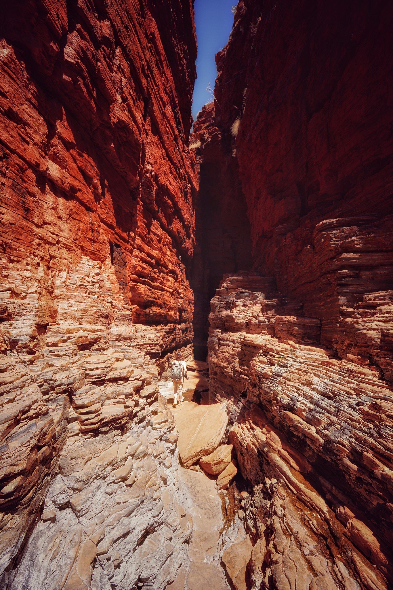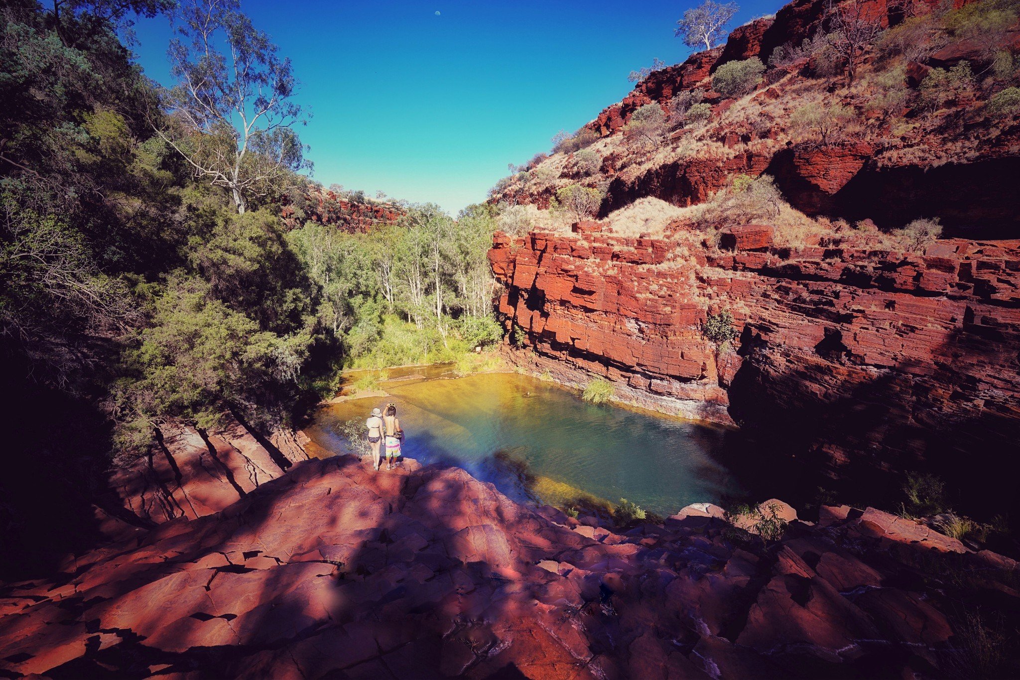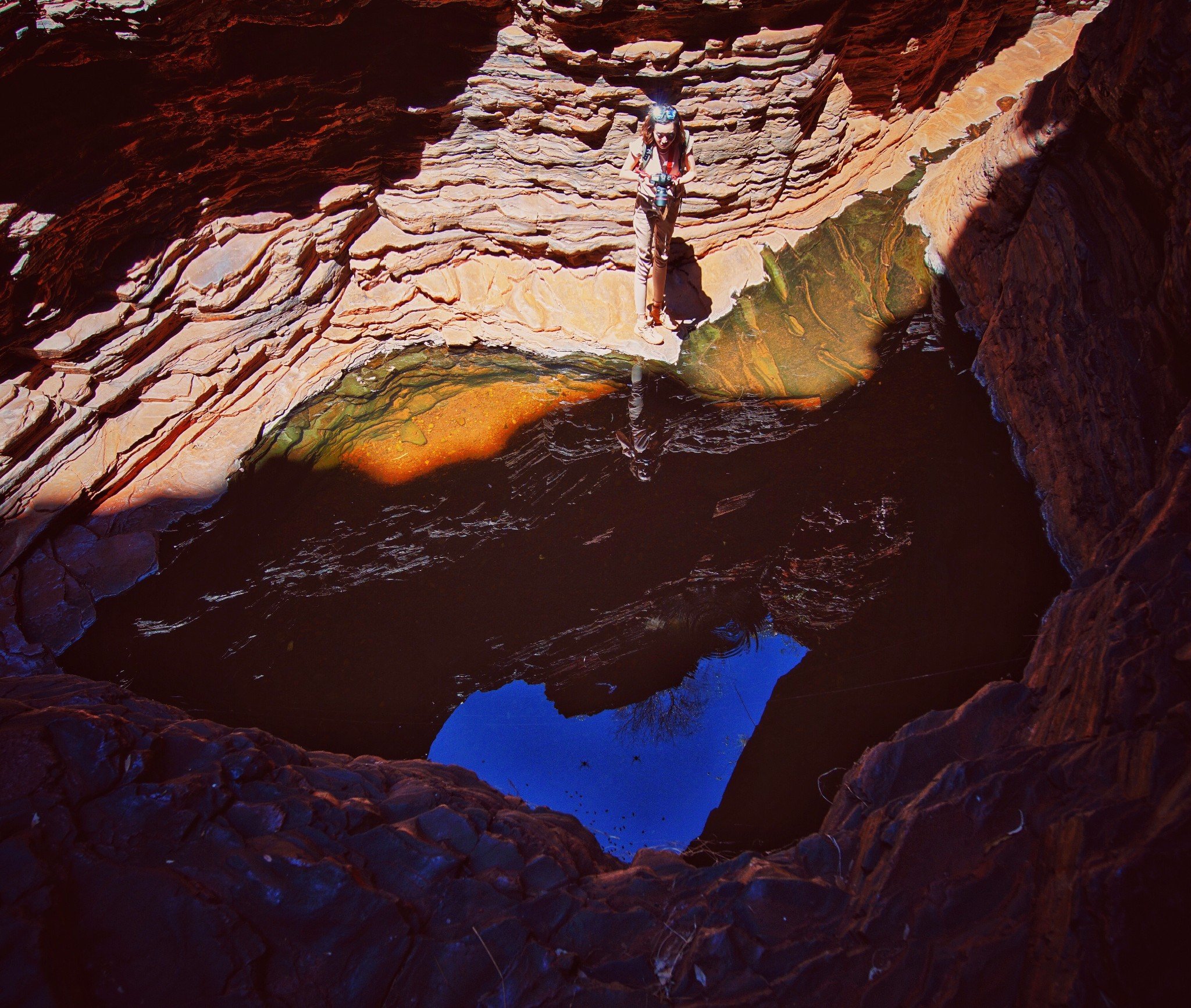 Karijini有名的是徒步,这里按照几个等级来划分徒步路线,通过徒步的方式,探索到深处的峡谷。我们去探索了两处峡谷,第一天是Weano峡谷,是很简单的徒步线路,从停车场到达峡谷深处的水潭大概走10分钟就到了。水潭可以游泳,太阳每刻的变化都让水潭中的水发生不同变化,像彩虹一般。还有从山体上流下的小瀑布,如果到了雨季这里的水更大。