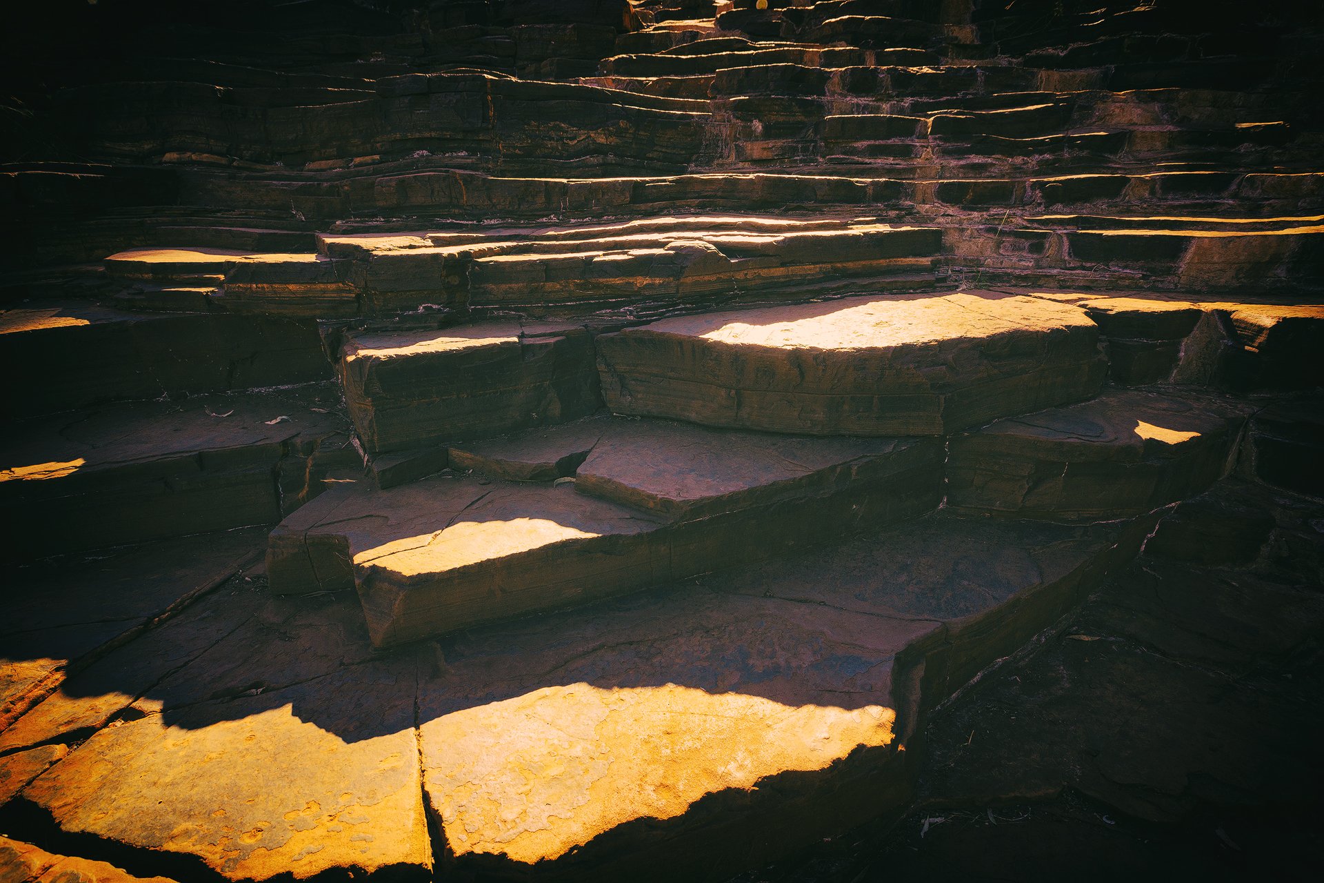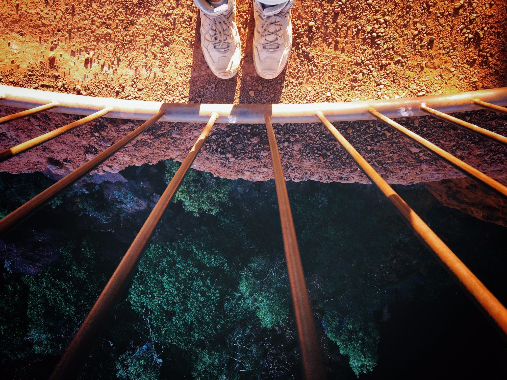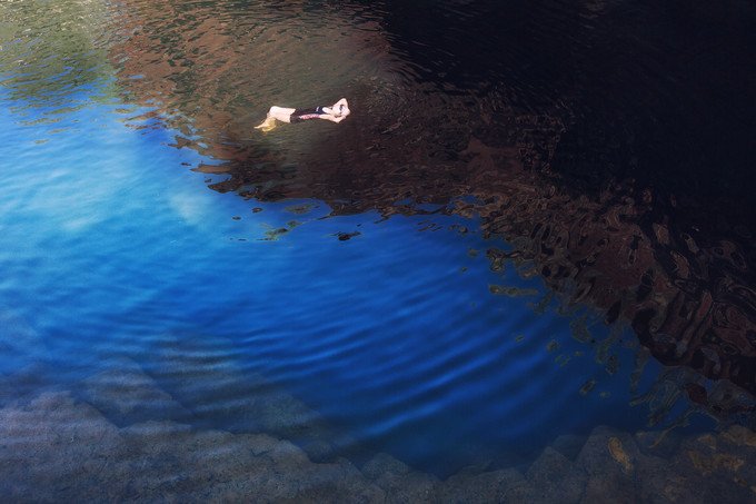 第二天我们选择走了中级的徒步线路Dale峡谷。这条线路则不同,人需要走到峡谷底层,从大大小小的岩石之间穿过。沿路时常会出现小水洼,在山谷中光影迷人,与岩石的红色形成对比。后半段基本要手脚并用了,在到达水潭前,公园修建了攀登的脚梯,如果没有这脚梯是很难到达水潭的。这个水潭和前一天的不同,四周被岩石包裹的严严实实,而且非常陡峭,水潭向西延伸着,可以顺水游向下个水潭。我的水性比Unlce L差很多,所以我们不打算顺水西下。这里阴凉处非常凉爽,在有太阳照射的地方,岩石上的温度可以煎鸡蛋。我们在这里玩水拍照,几个英国年轻人也一直在这里,他们并没有下水,一直水岸上聊天晒太阳。说话的声音有时候在山谷里环绕发出回声。