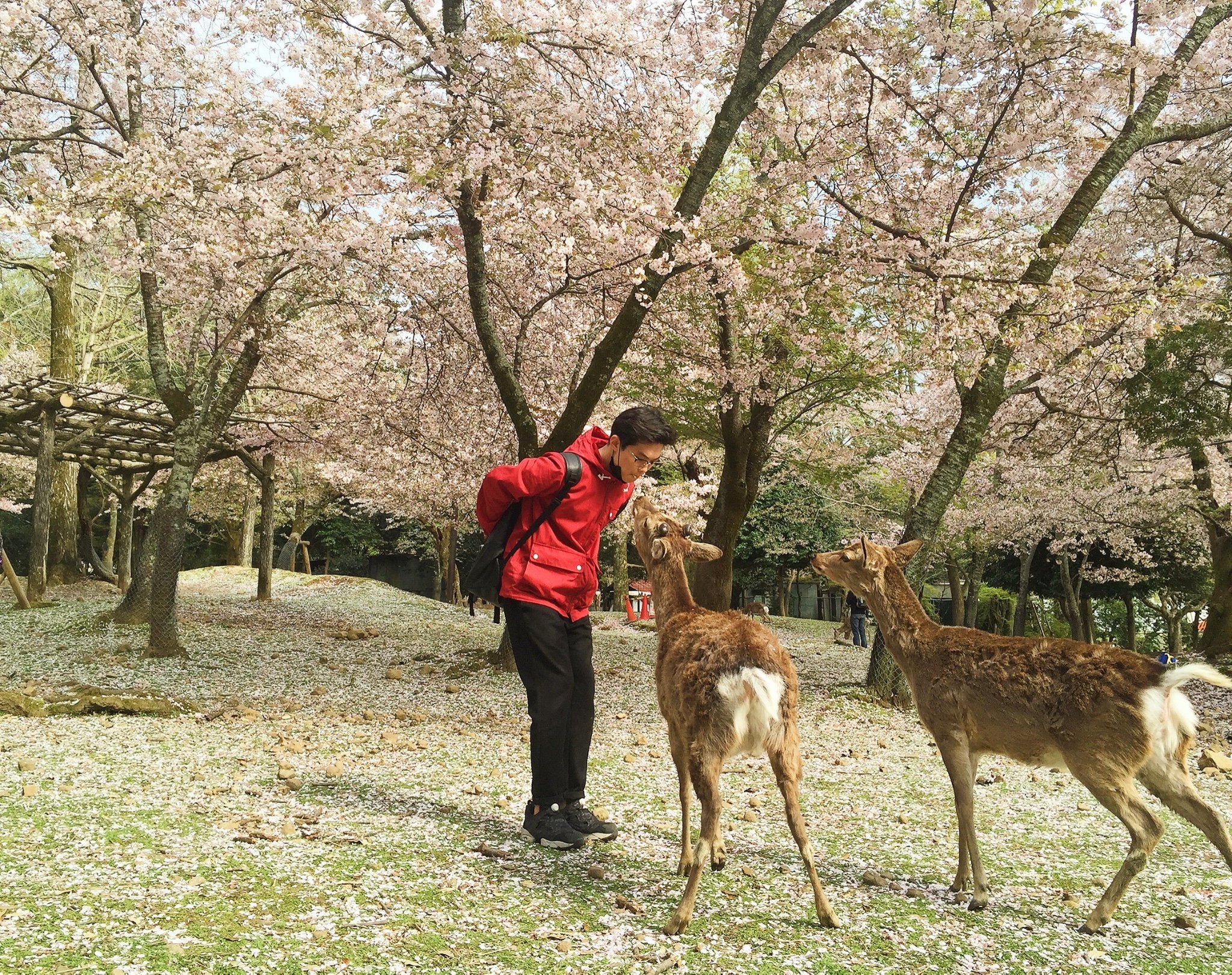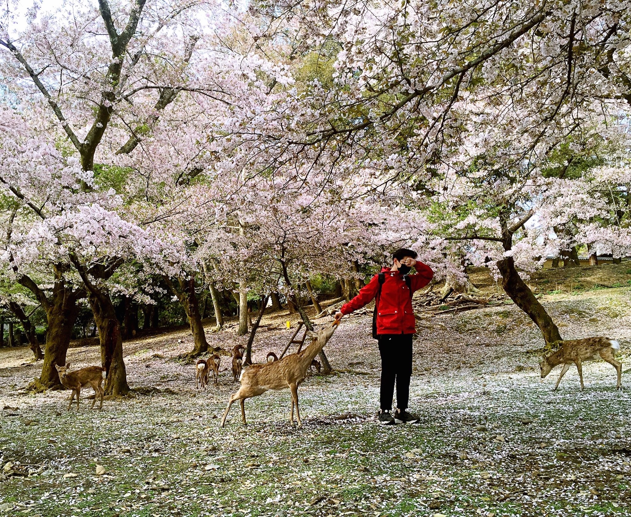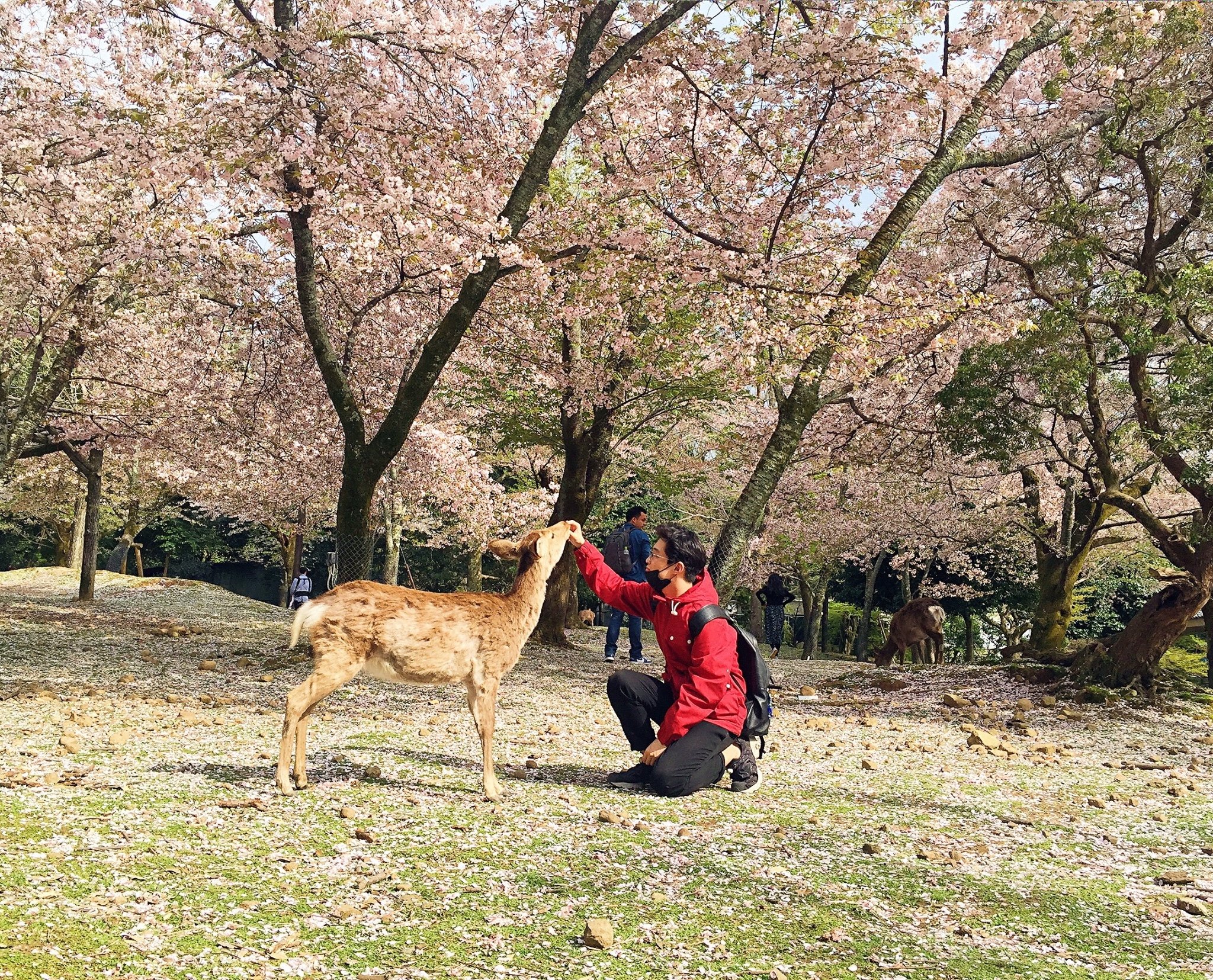 没有食物,鹿可不会上当的理你,于是买15日元一打的鹿饼,在樱花树下摆出各种姿势。