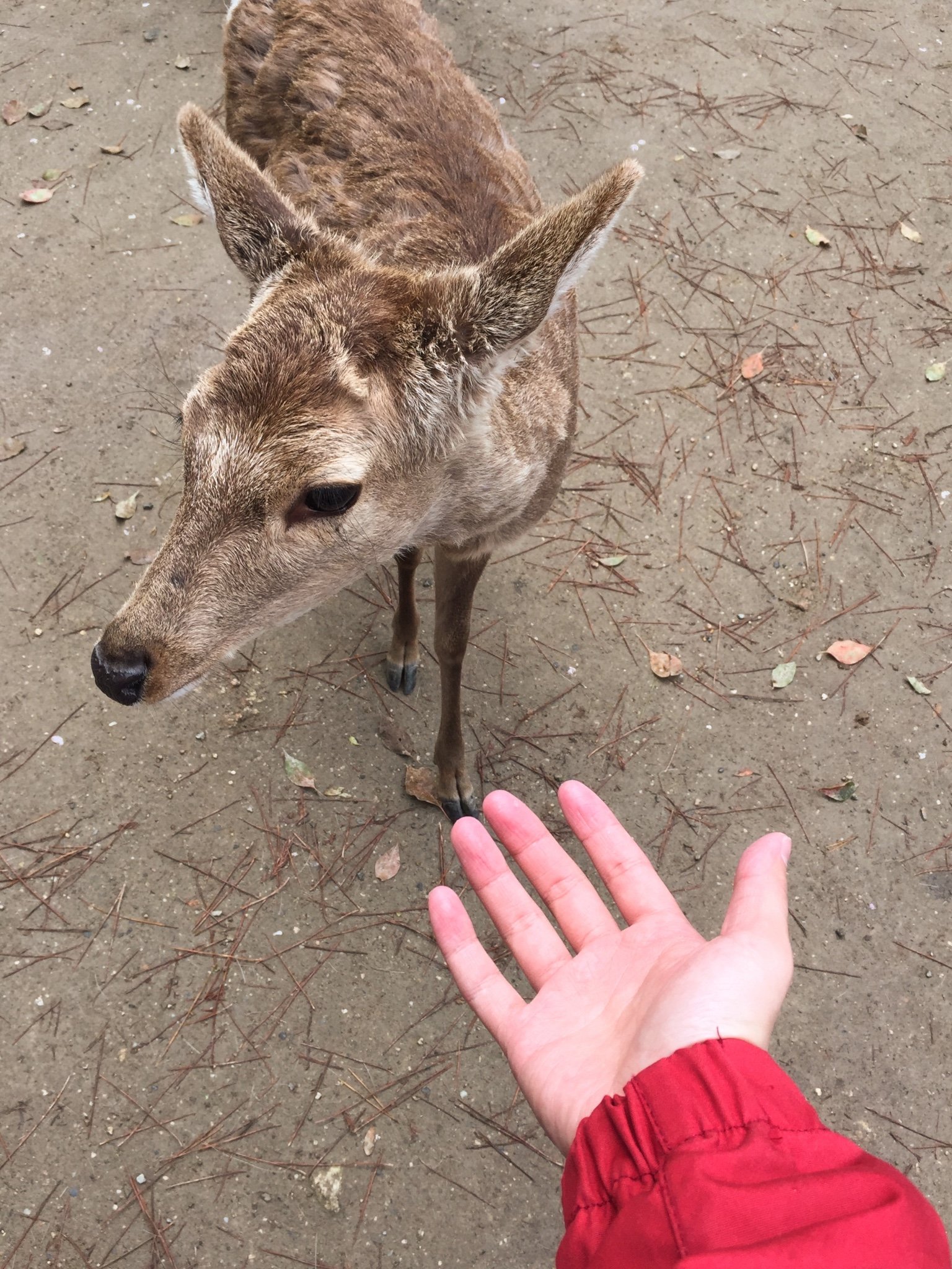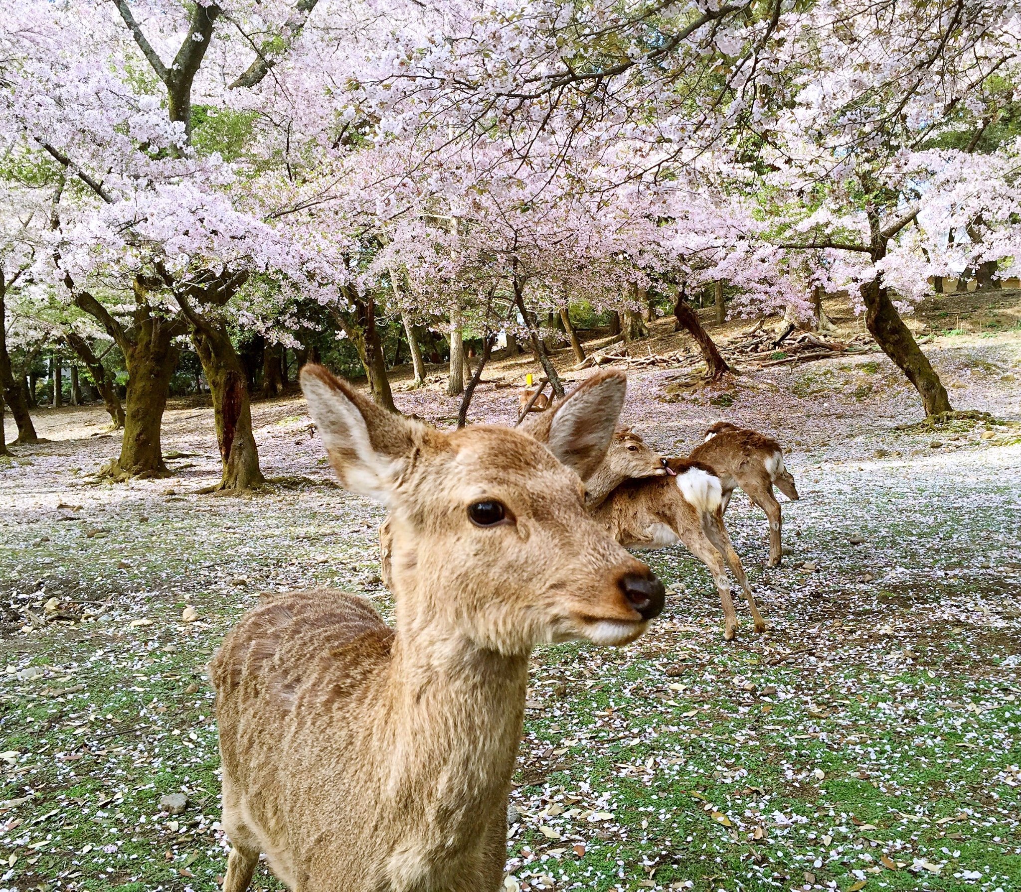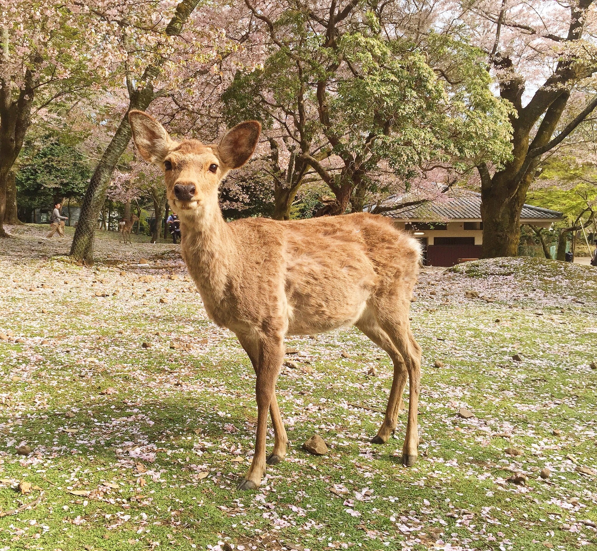 没有食物,鹿可不会上当的理你,于是买15日元一打的鹿饼,在樱花树下摆出各种姿势。