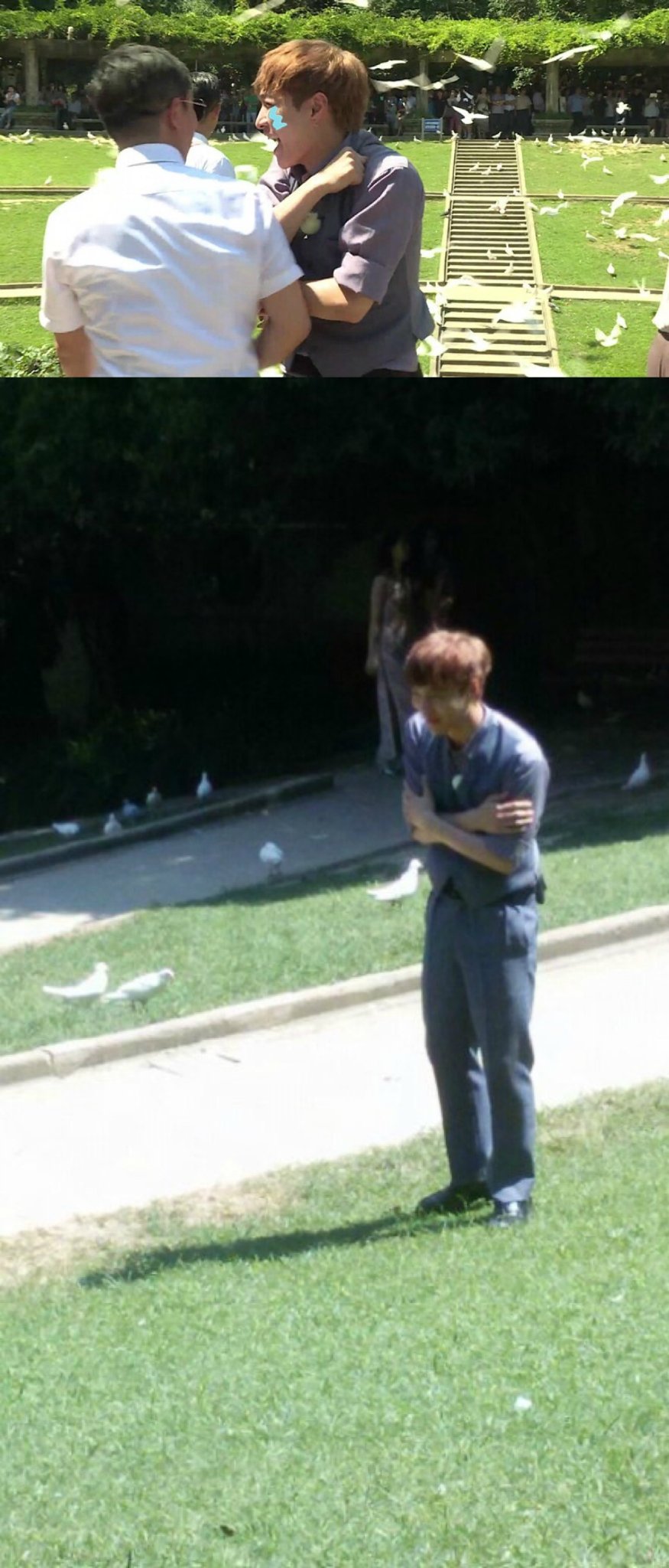 在极限挑战中被吓到不敢移动的张艺兴。喂鸽子实拍,很开心!主要是走得很累了,正好可以坐一坐喂喂鸽子