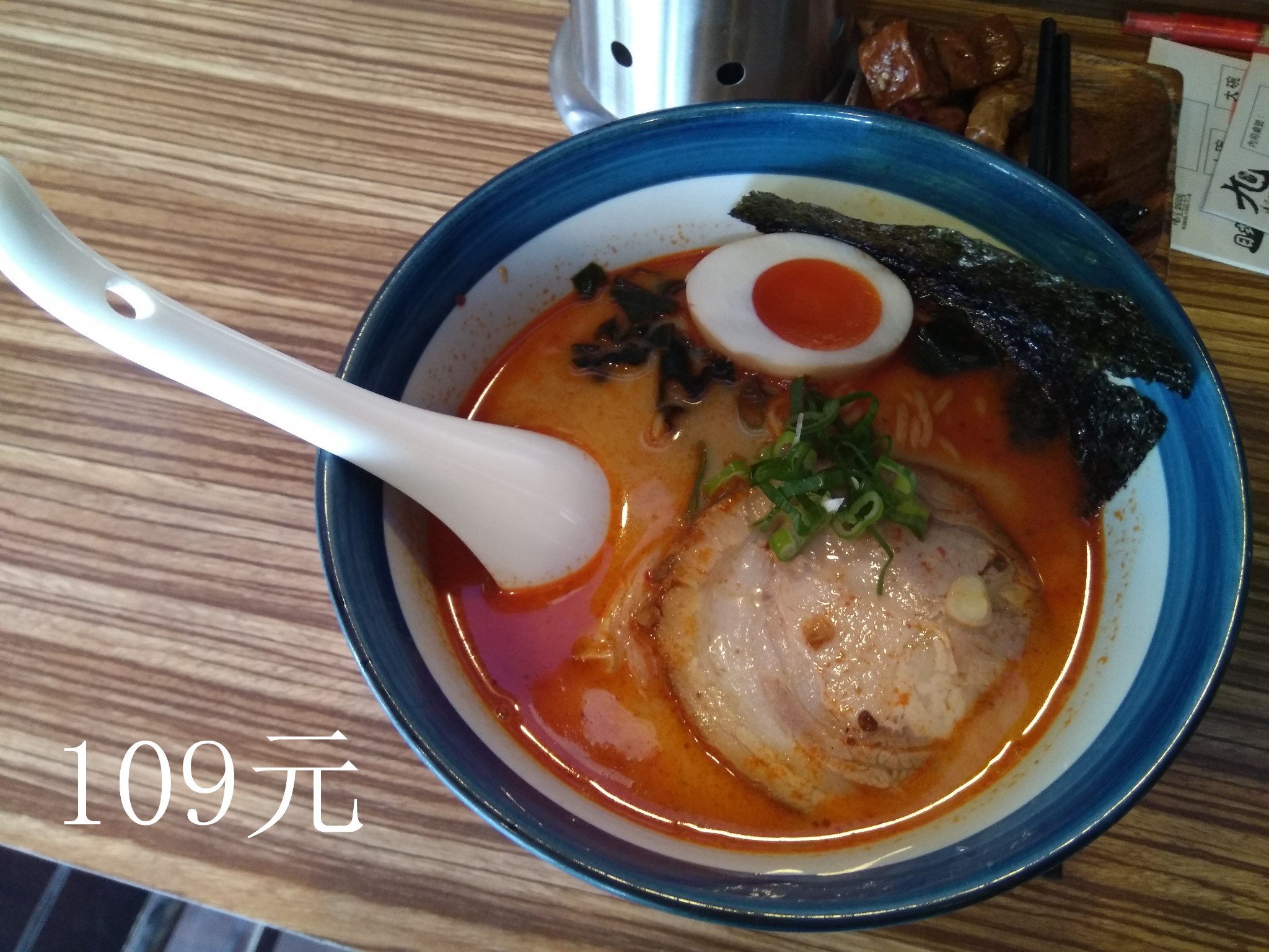 ...湯除了辣還喝的出湯的濃郁,加上小碗才109元台幣,較日本的一蘭拉麵便宜多了,至於小菜一份30元