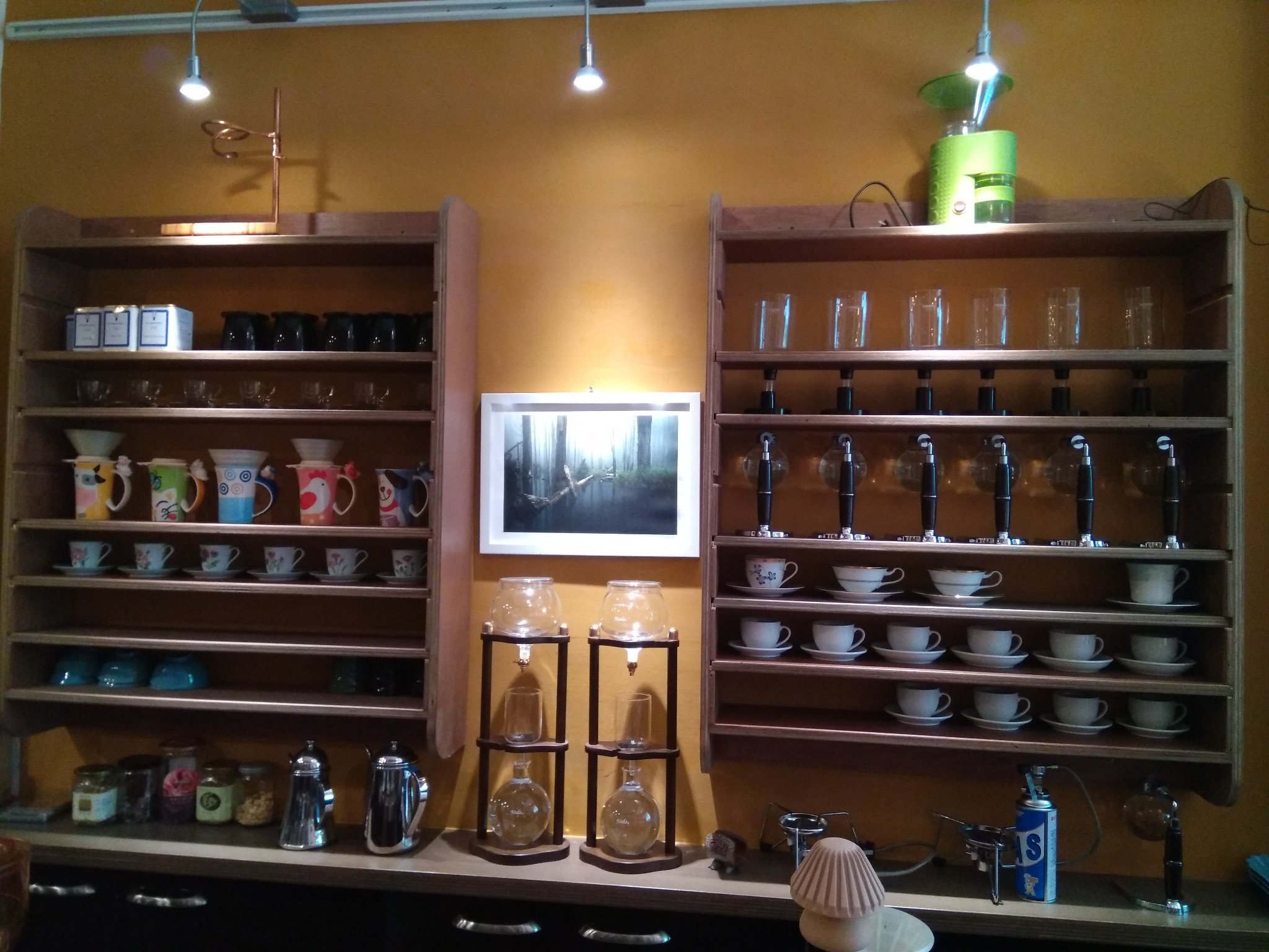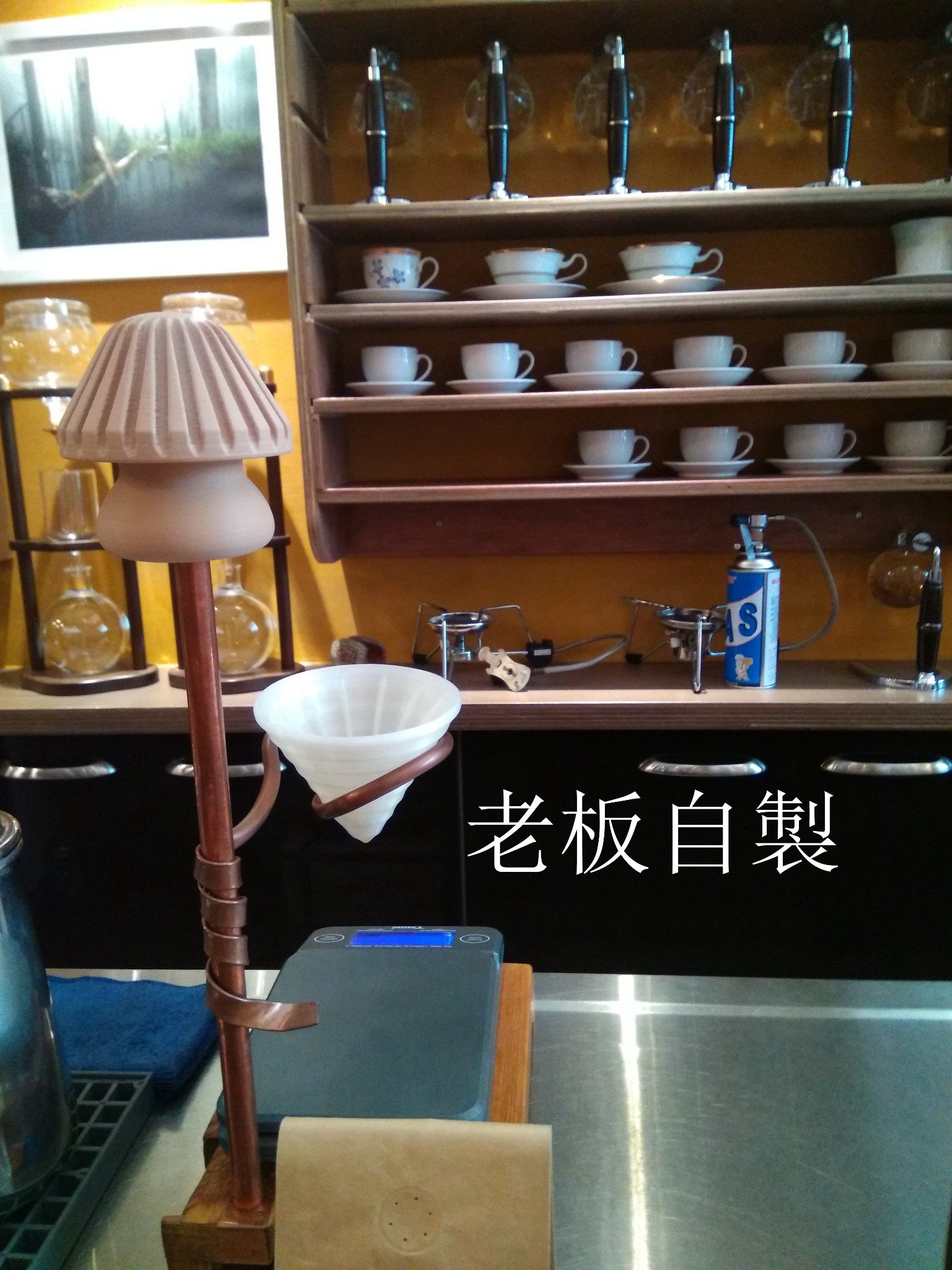 他的許多器材都是自己設計的,尤其是咖啡濾斗是自己設計用三D列印印出來的,原料好像是玉米粉,我有點忘了,重要的是可以為品質把關。