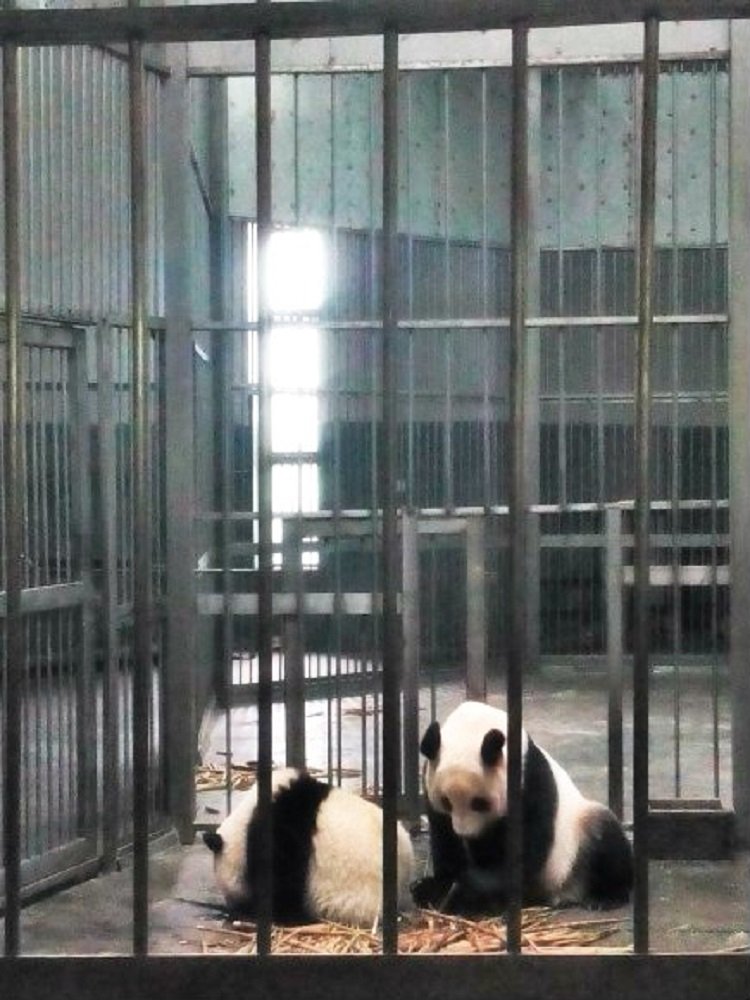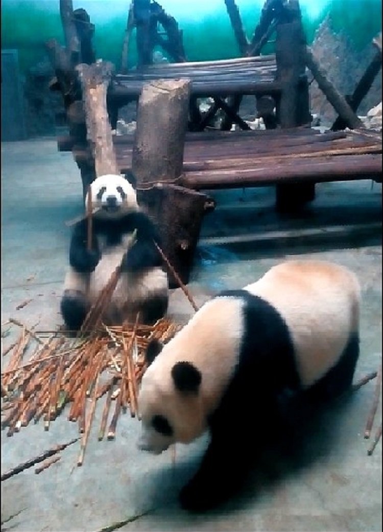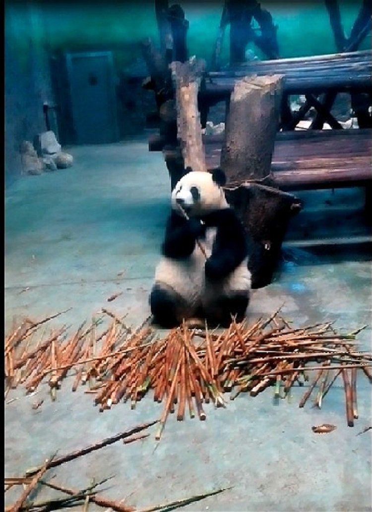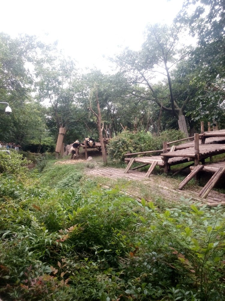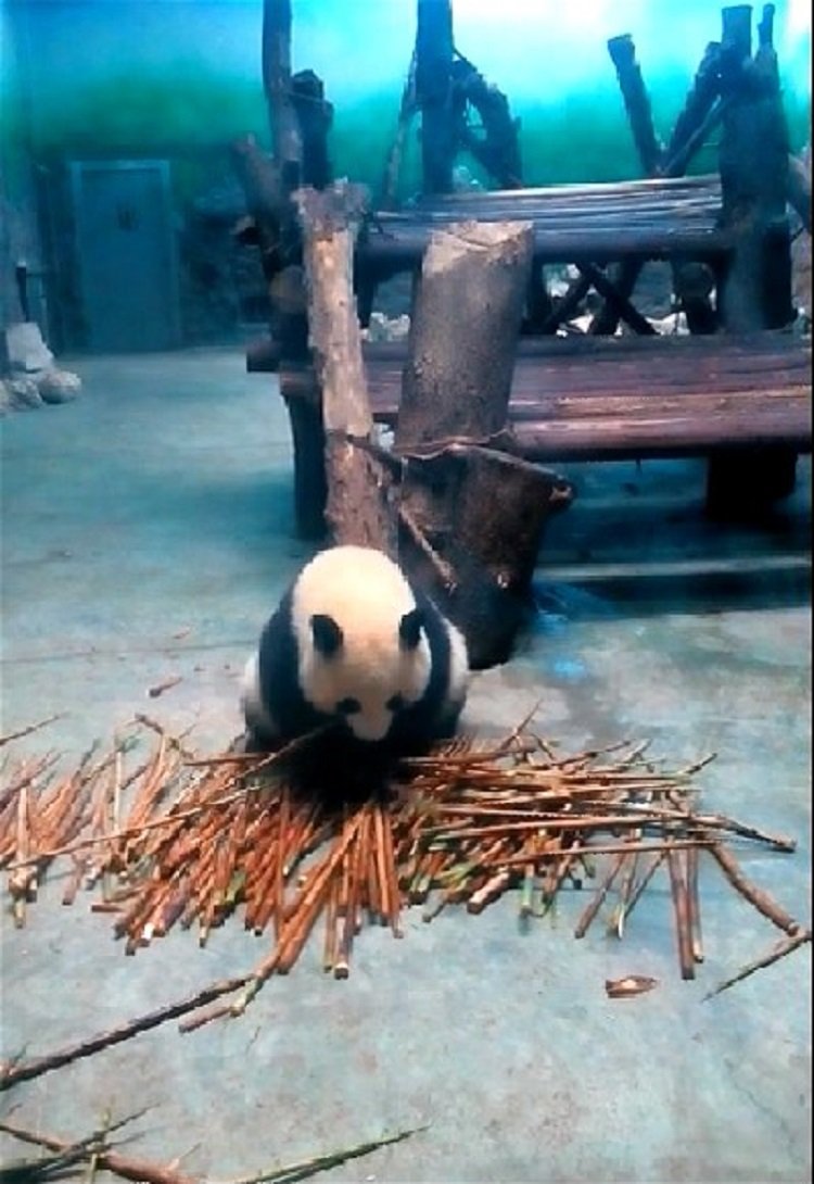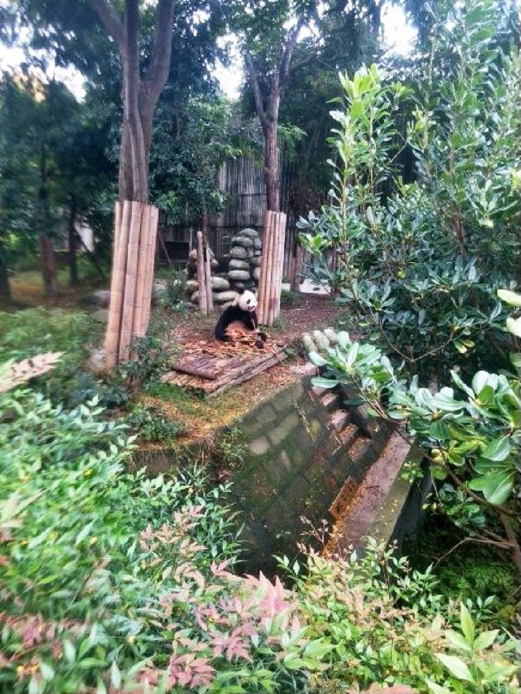 室内有少数大熊猫,但更多的是在户外玩。而且熊猫都各有各的地盘,牌子上写着熊猫的名字等简介。有的熊猫就懒洋洋地靠坐着大树,扒拉着脚下那堆竹笋不停地吃。甭管多少人看它们,它们都是一幅淡然自若的表情。也有的几只在一起玩耍,上架子爬树的,互相嬉戏打斗的,每次它们从架子上掉下来,游客都会一阵惊呼,倒是大熊猫非常淡定,爬起来继续玩,太可爱了。
