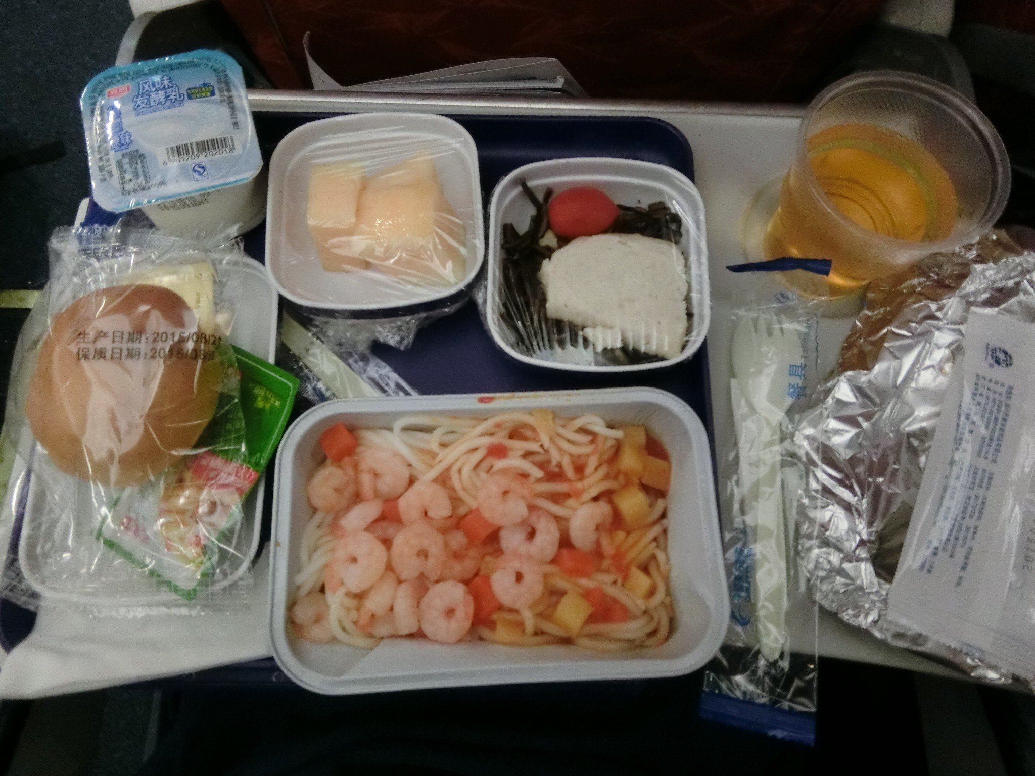 终于登机,东航国际航线的飞机餐还可以吧,这个虾仁面我觉得超级好吃啊,主要是辣酱拌的,反正我是全部吃完了。